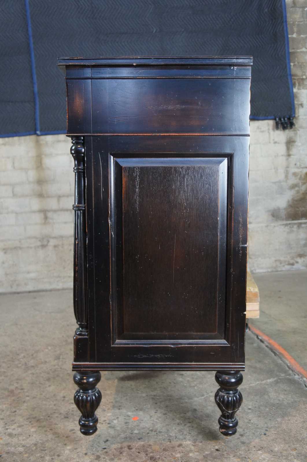 Hickory White bowfront buffet or sidebaord, circa 2000 Features a rectangular form with turned columns and turnip fluted feet. Includes 3 dovetailed drawers and lower cabinets for storage. Finished in distressed black with brown undertones. Traditional styling with French inspiration from Empire and Provincial designs.