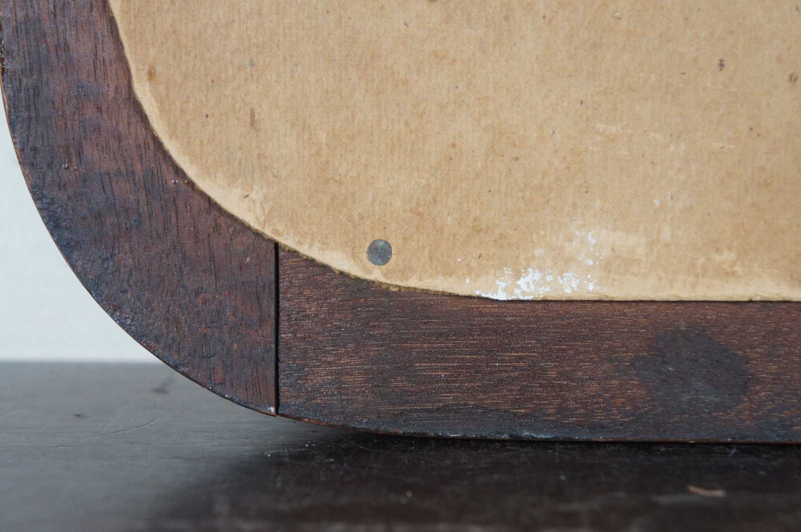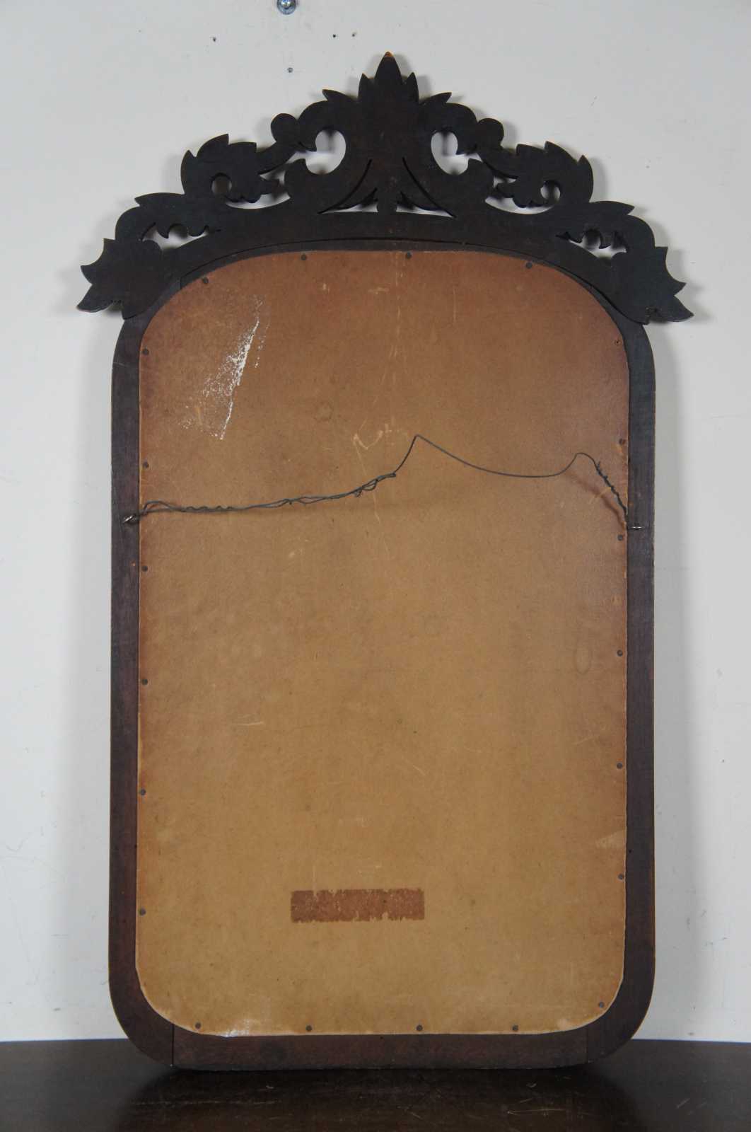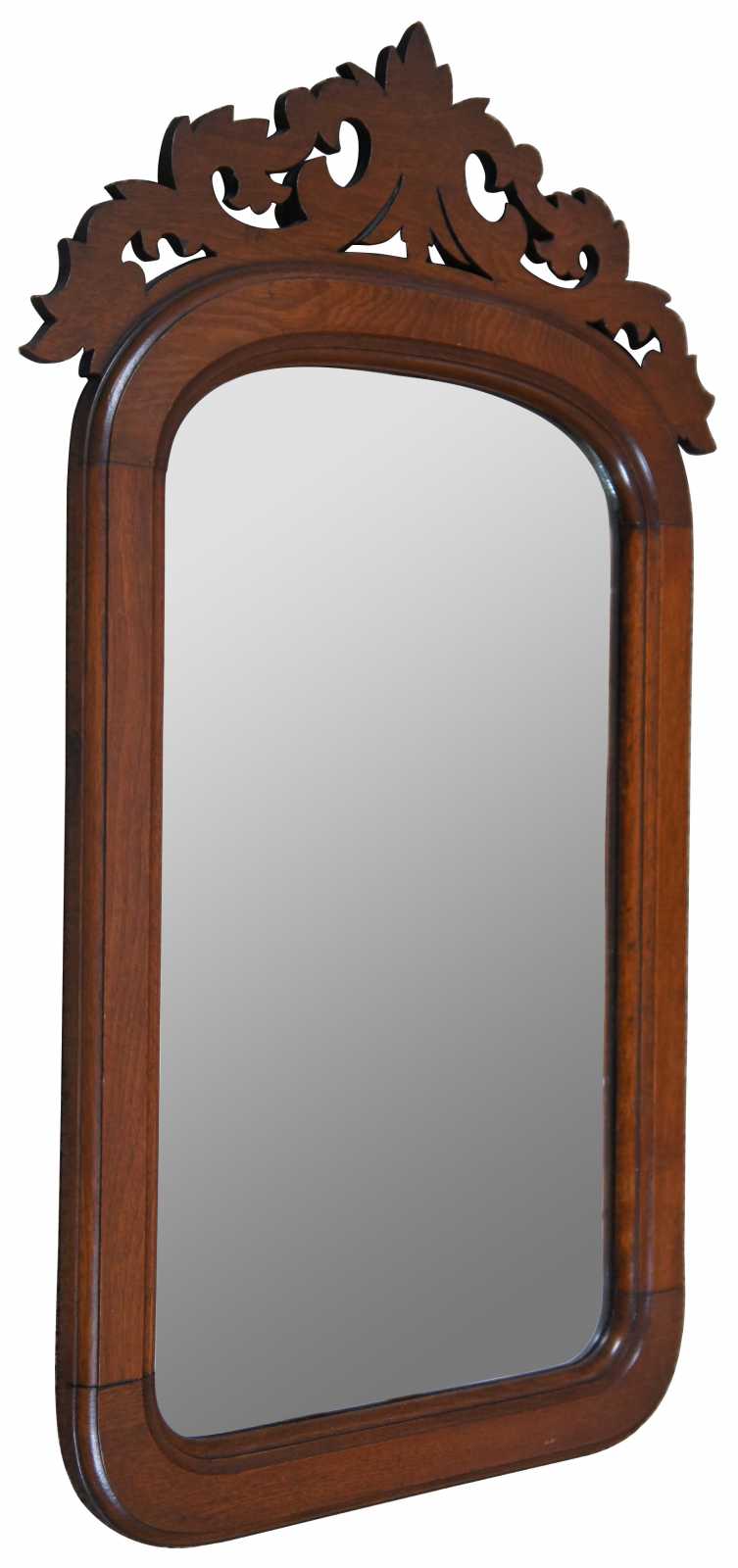 Antique walnut wall mirror with beveled frame and carved leaf crown.
