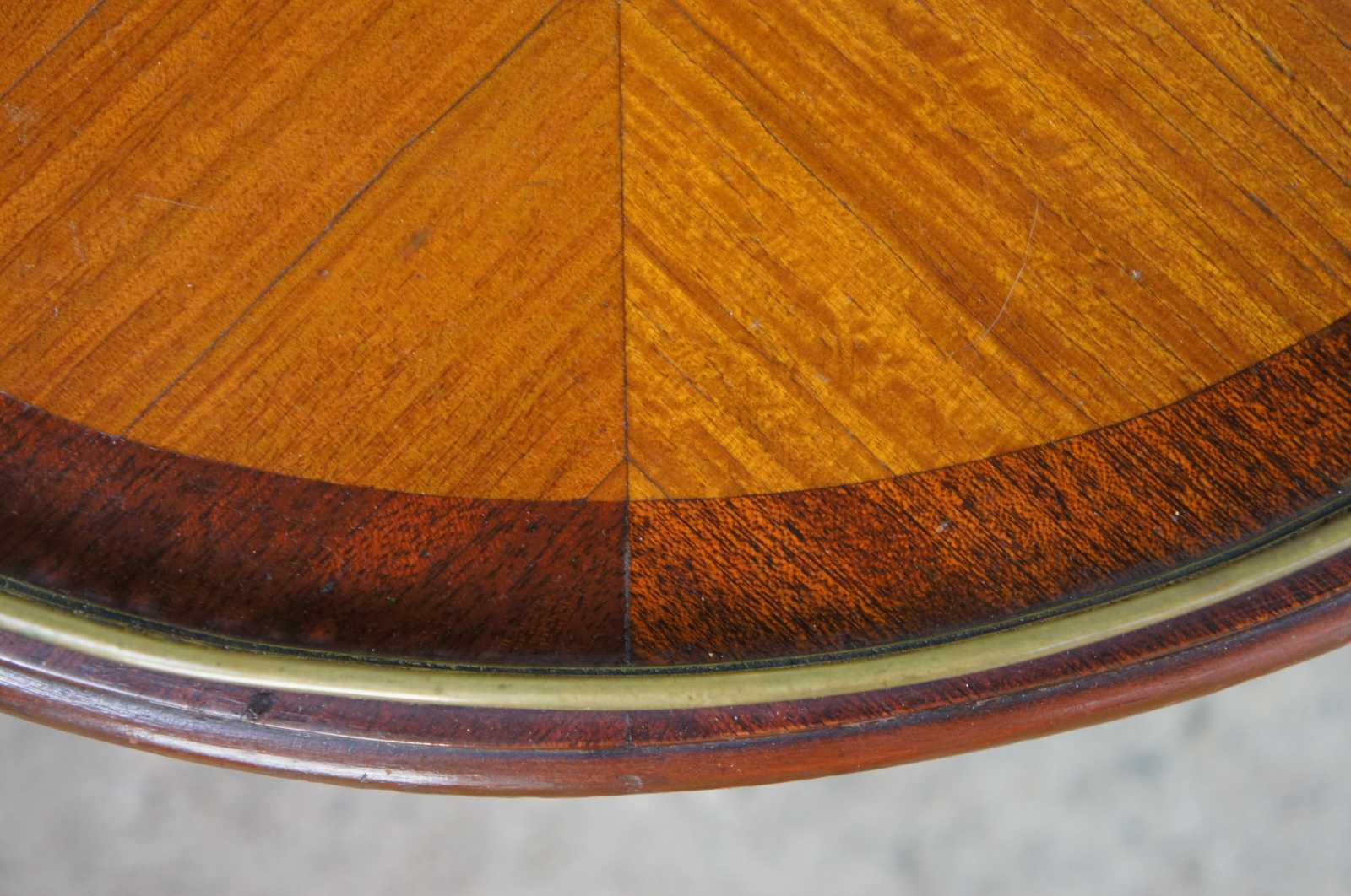 Antique French Louis XV Gueridon or Bouillette table featuring an oval serpentine / clover form with reticulated brass gallery, matchbook top and tapered cabriole legs with brass feet caps.
