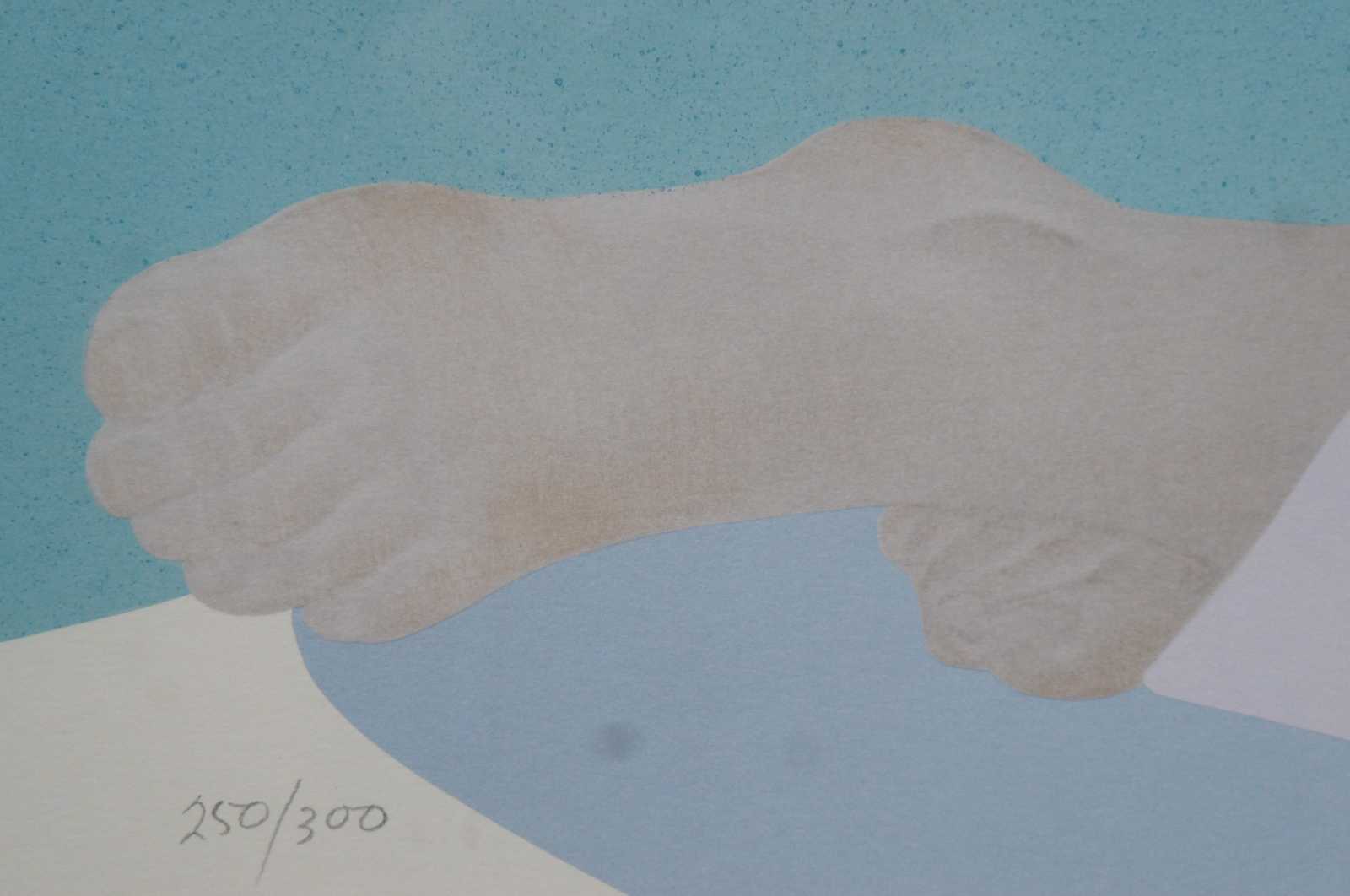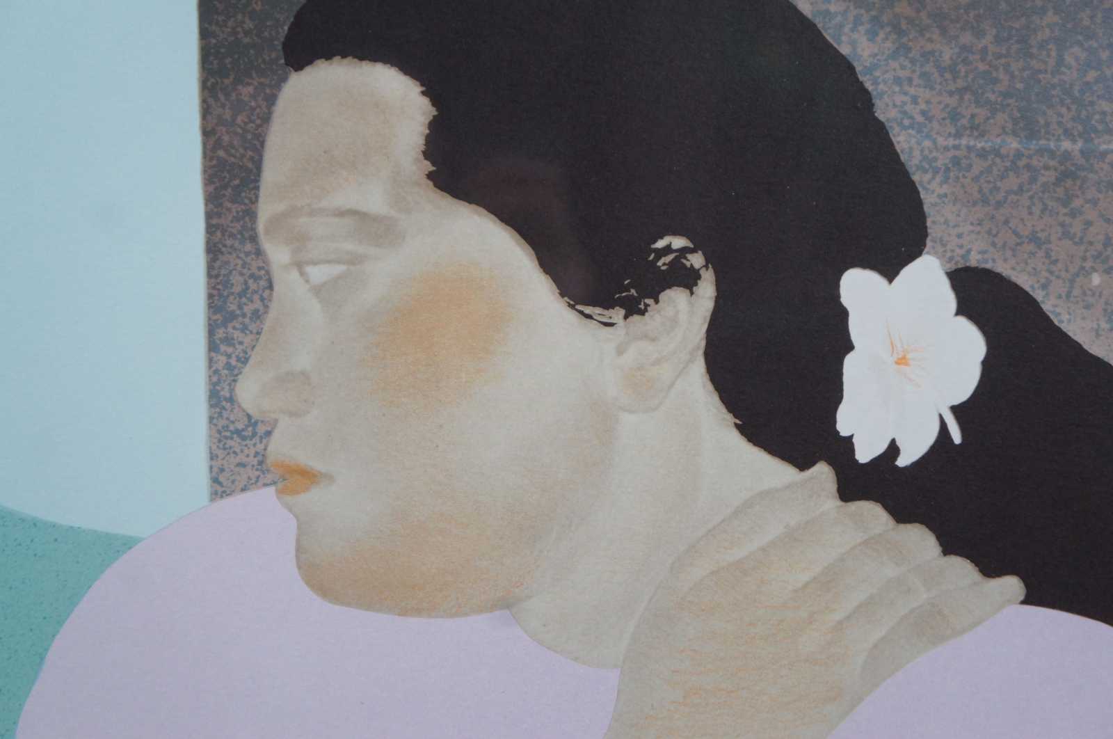 ""Kohala Afternoon"" serigraph print by Pegge Hopper, circa 1980s. Featuring a Hawaiian woman reclining in the sun with a fan at her side and mountains in the background; pencil signed and numbered 250/300. “Born in Oakland, California, Pegge Hopper moved to Hawaii in 1963 and took a job as an art director with an advertising agency. In 1970, she began a series of paintings of Island women, and she has exhibited these paintings in one-person shows in Hawaii as well as Chicago, Los Angeles, and Seattle.