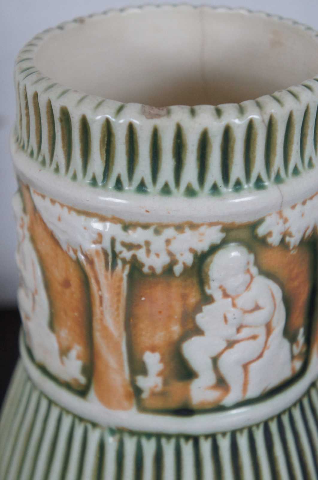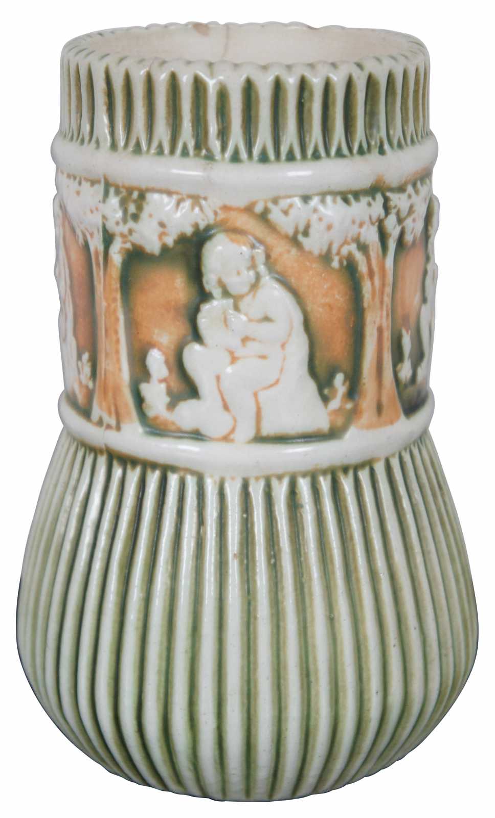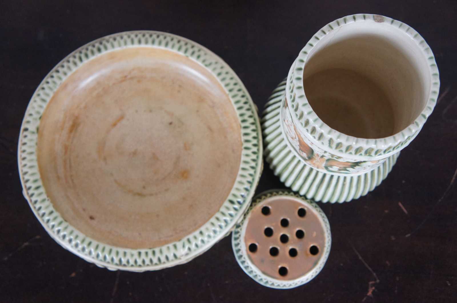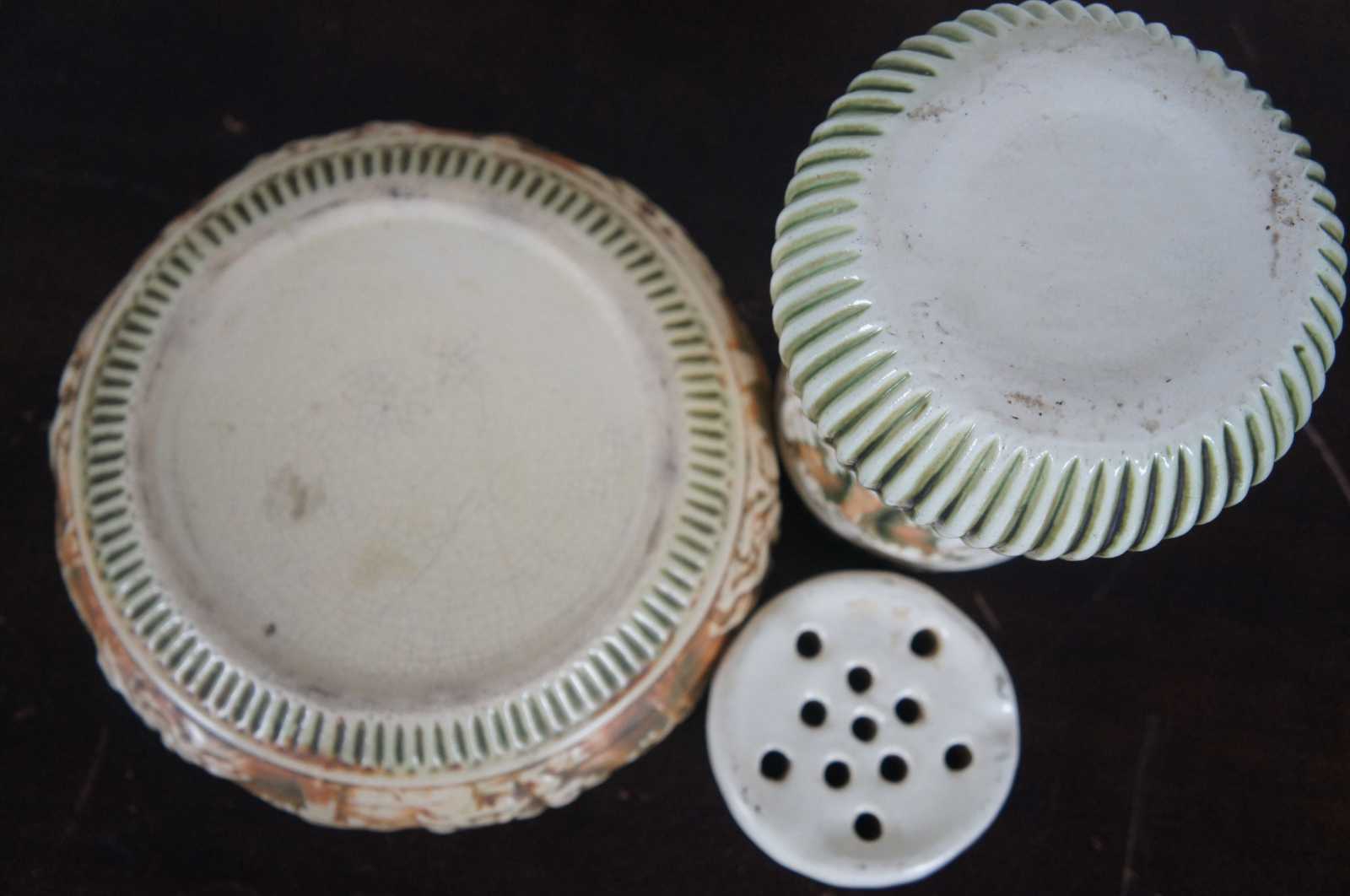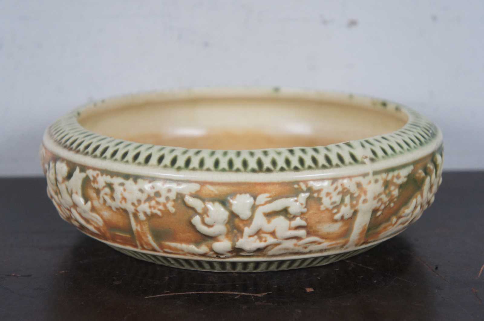 Antique 1910s set of three ceramic pieces by Roseville Pottery in the green and orange Putti cherub, Donatello pattern – flower frog, jardiniere / vase, and a shallow bowl.