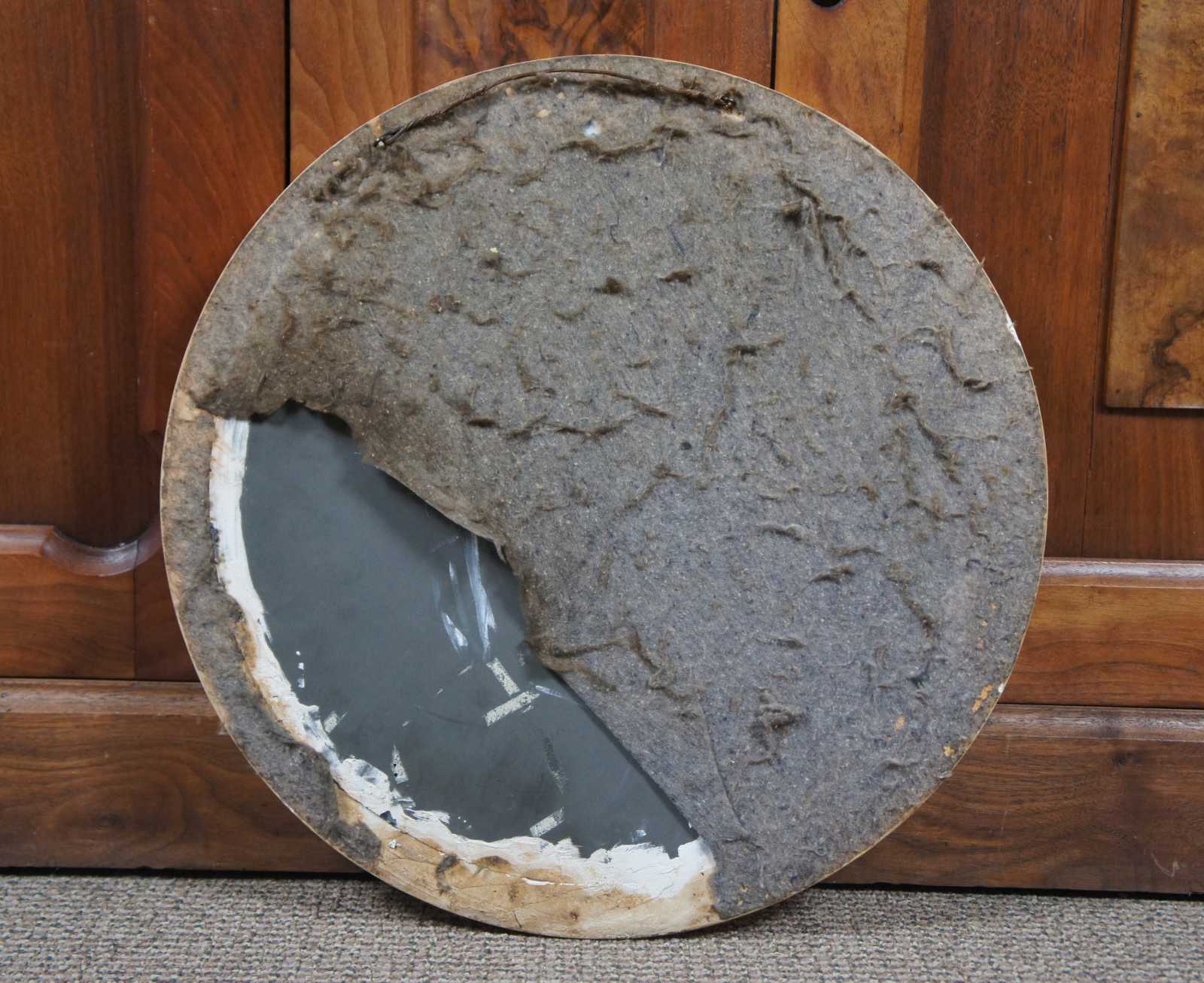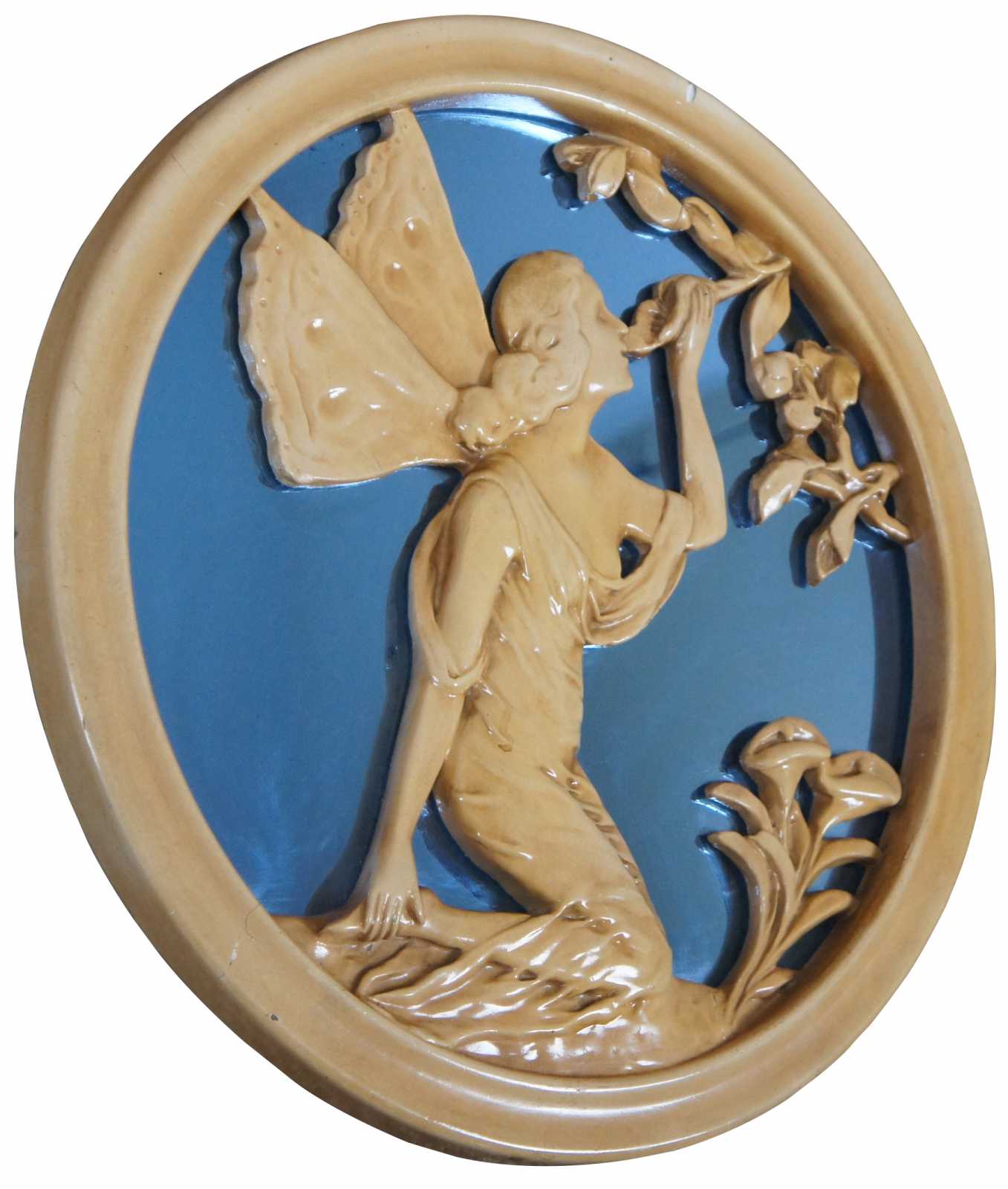 Vintage art nouveau style plaque showing a fairy drinking from a flower, mounted on a blue tinted mirror.