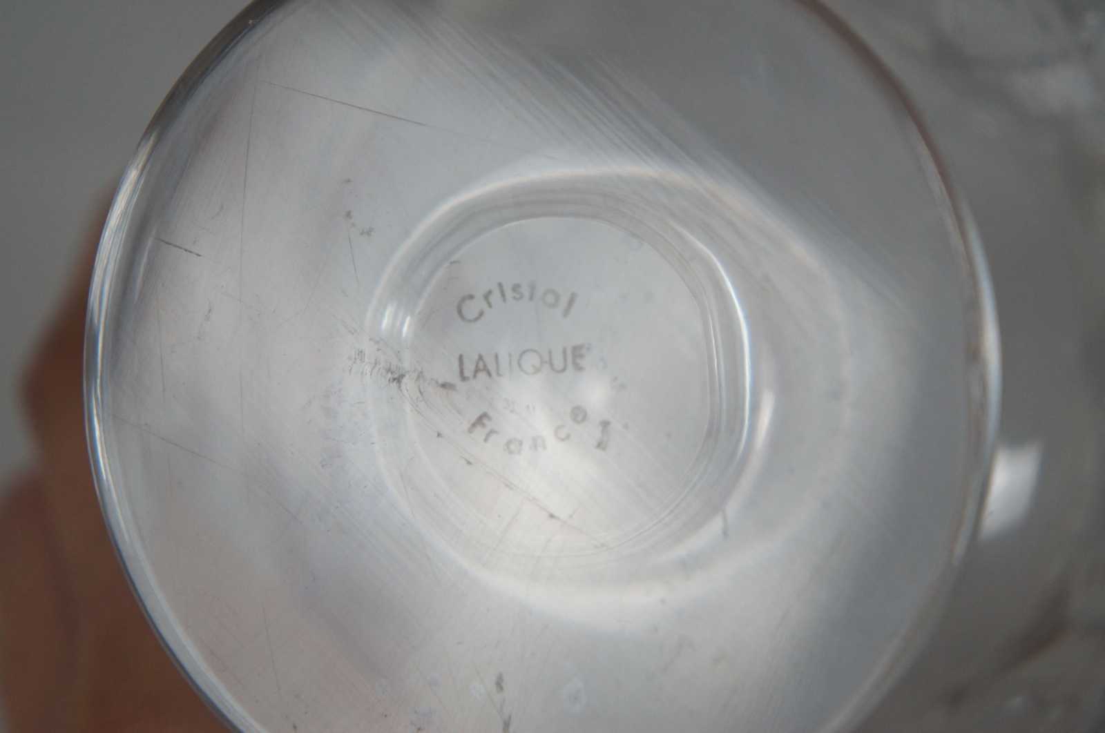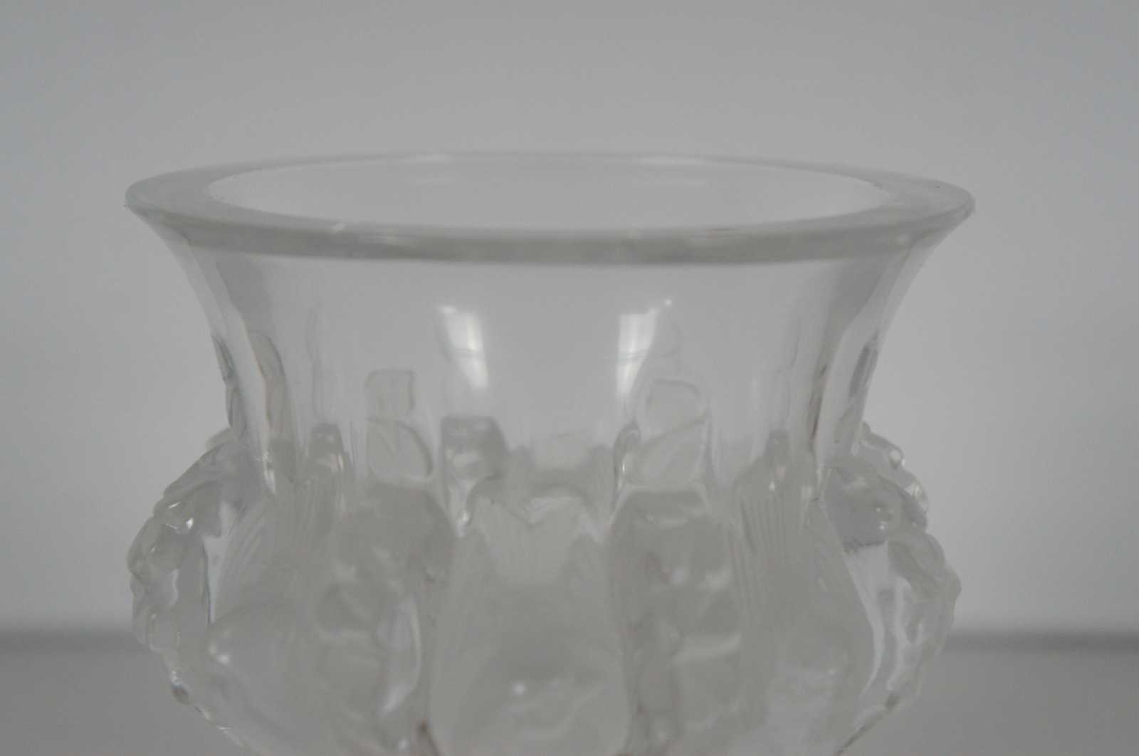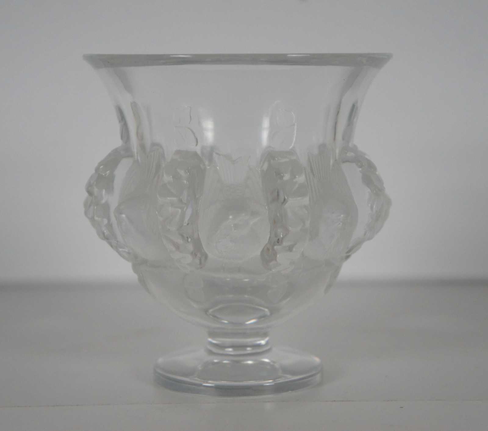 Vintage Lalique French crystal footed Dampierre vase or dish with frosted sparrows.