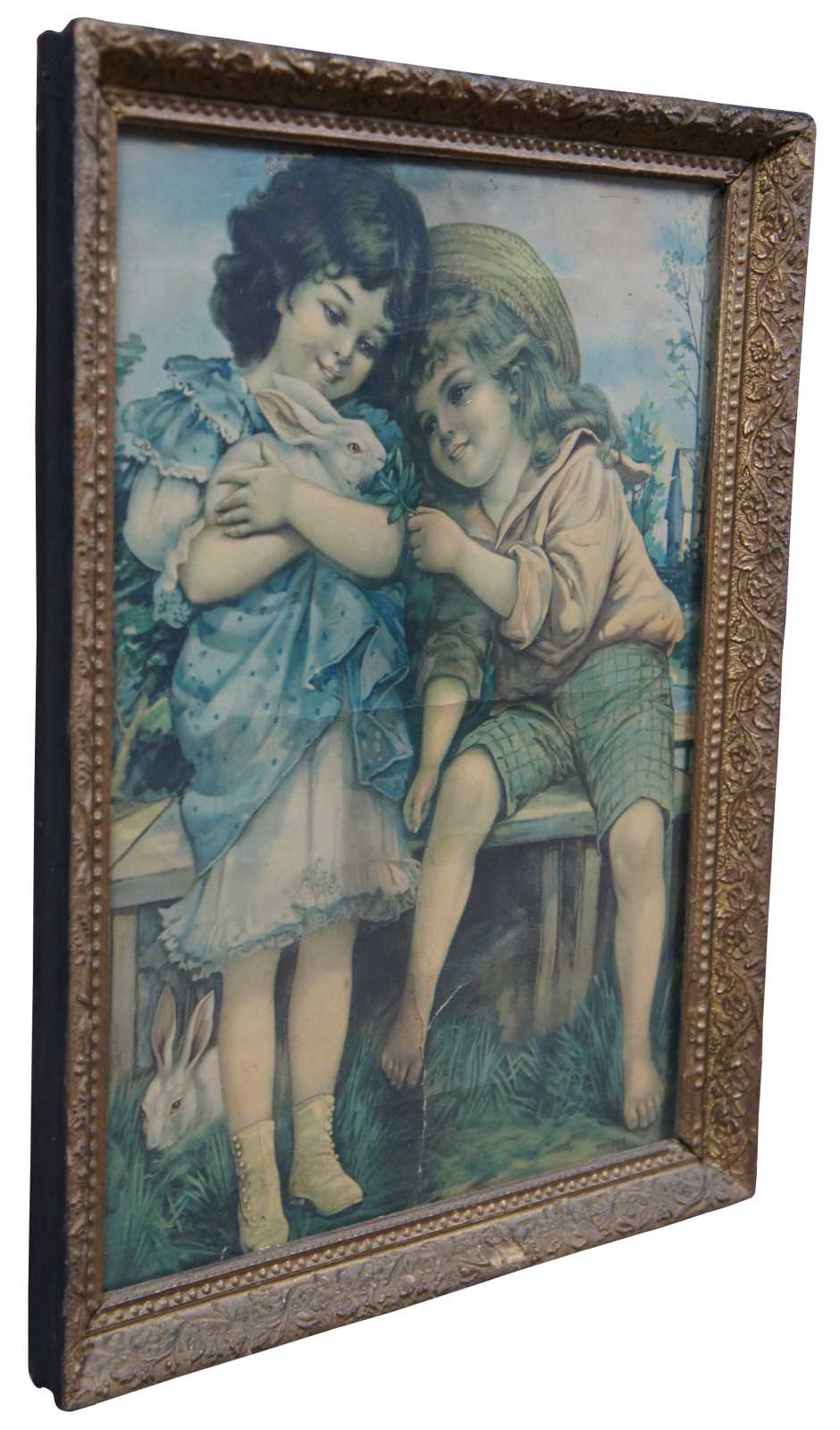 Antique Victorian lithograph print showing a young girl and boy seated at a bench with a pair of rabbits. Labeled as “The Pet Rabbit No 703.”