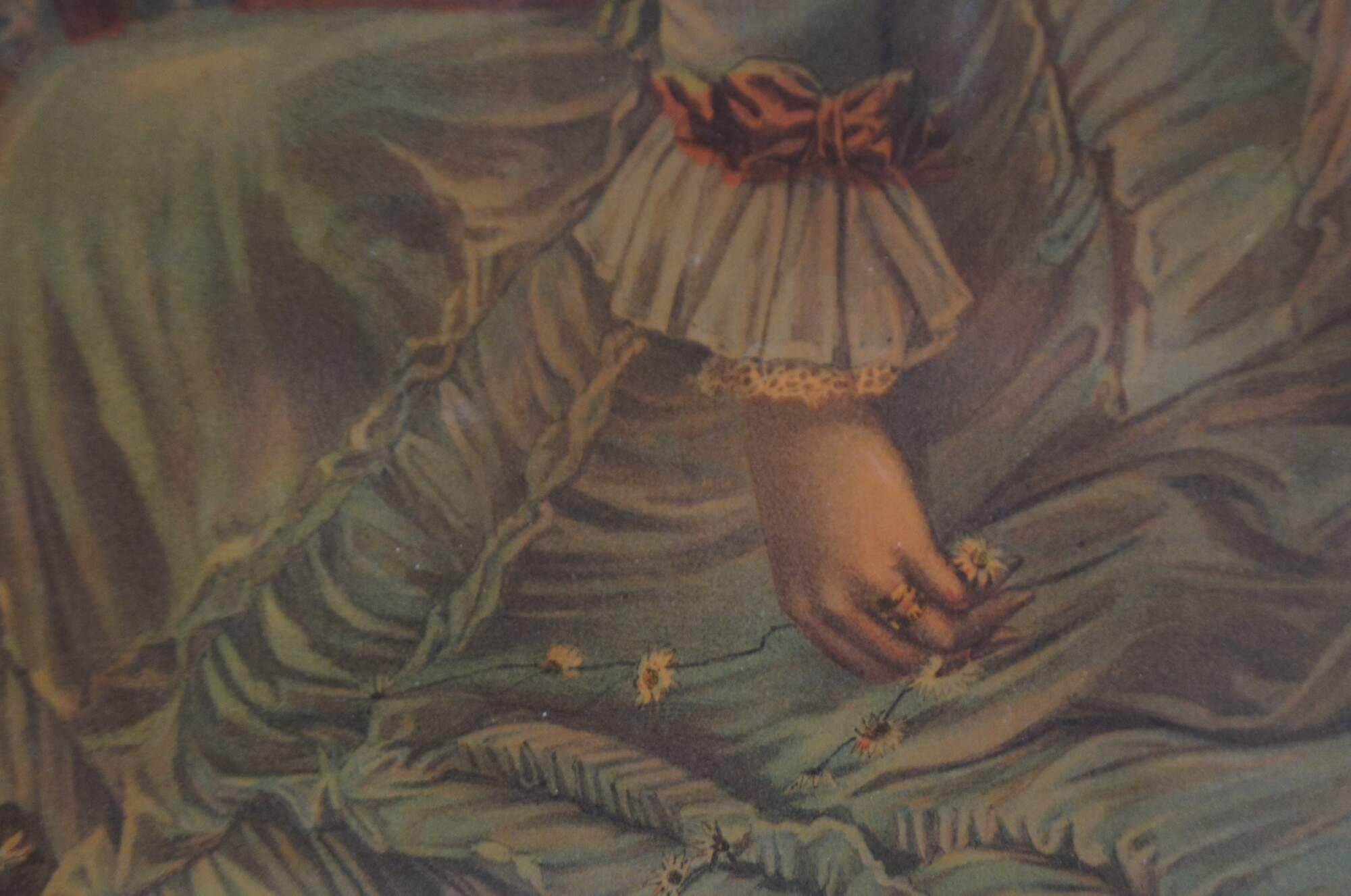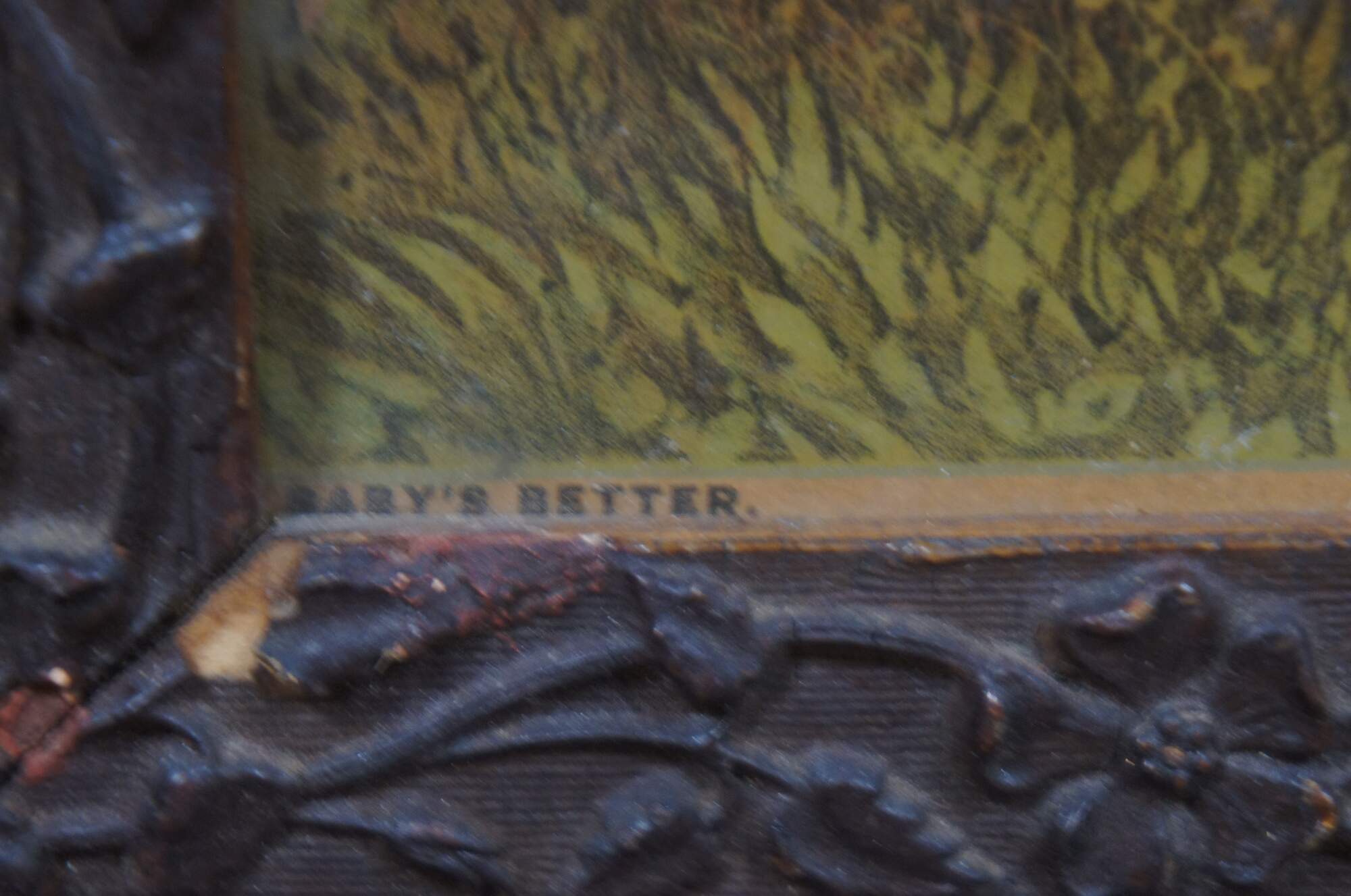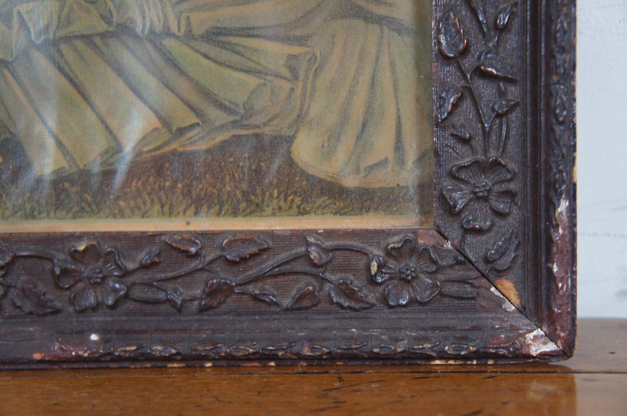 P.O. Vickery Antique Lithograph. "Baby's Better". Augusta, Maine. Dated 1886. Antique Victorian colored lithograph print titled showing a mother and her child seated by a garden bench, set in an intricately carved floral wood frame.