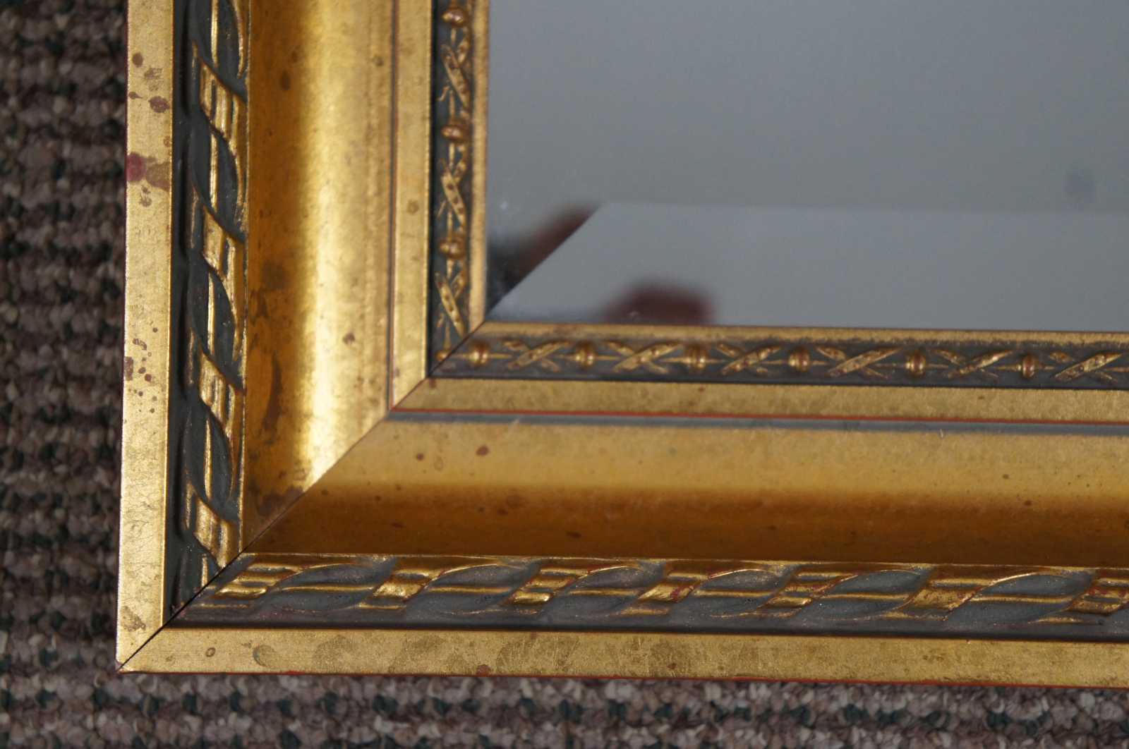 Hollywood Regency or Louis XV style gilt wood wall mirror by the H.A. DeNunzio Company. Features a recctangular frame with ribboned trim outside of a french inspired X patterned trim and beveled glass mirror.