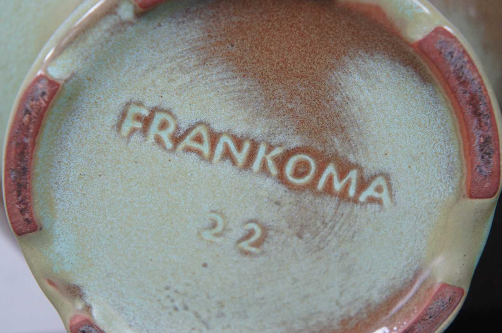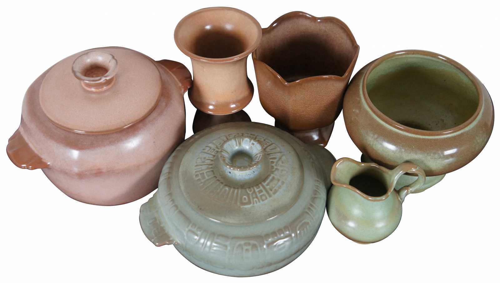 Lot of six assorted vintage Frankoma pottery pieces. Lot includes: pink lidded casserole dish #5W, green lidded Aztec casserole dish #7V, brown & green footed planter #22, brown footed scalloped vase #65, brown flared pedestal vase #F35, and small green creamer pitcher #40A.