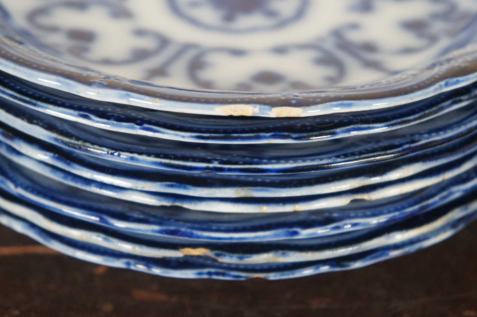 Set of eight 1890’s antique New Wharf Conway flow blue semi-porcelain small plates or saucers.
