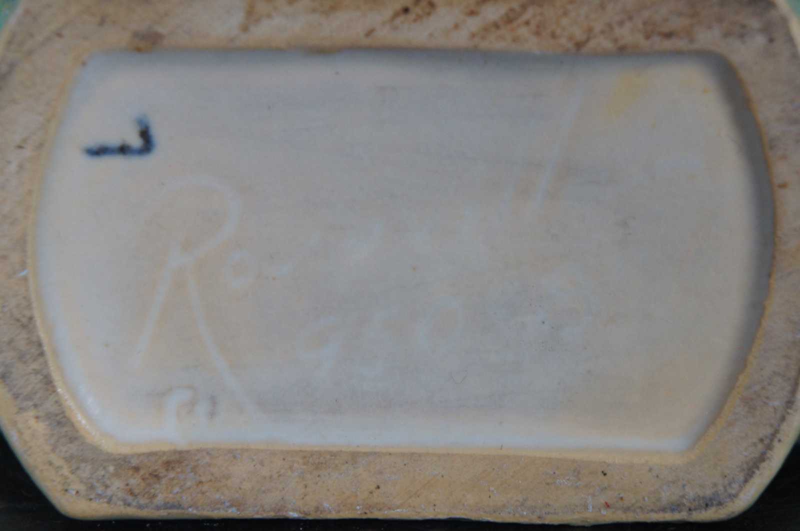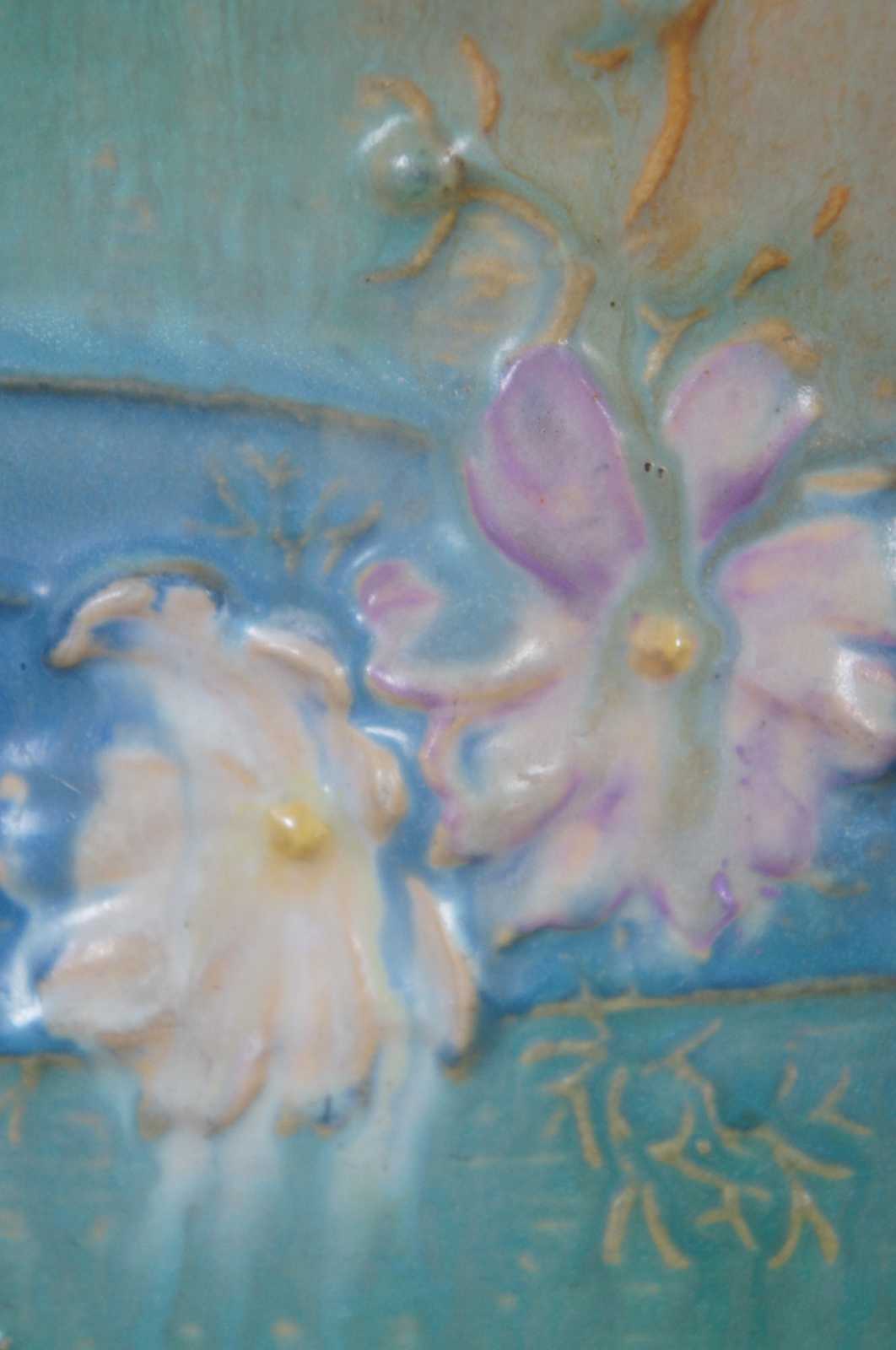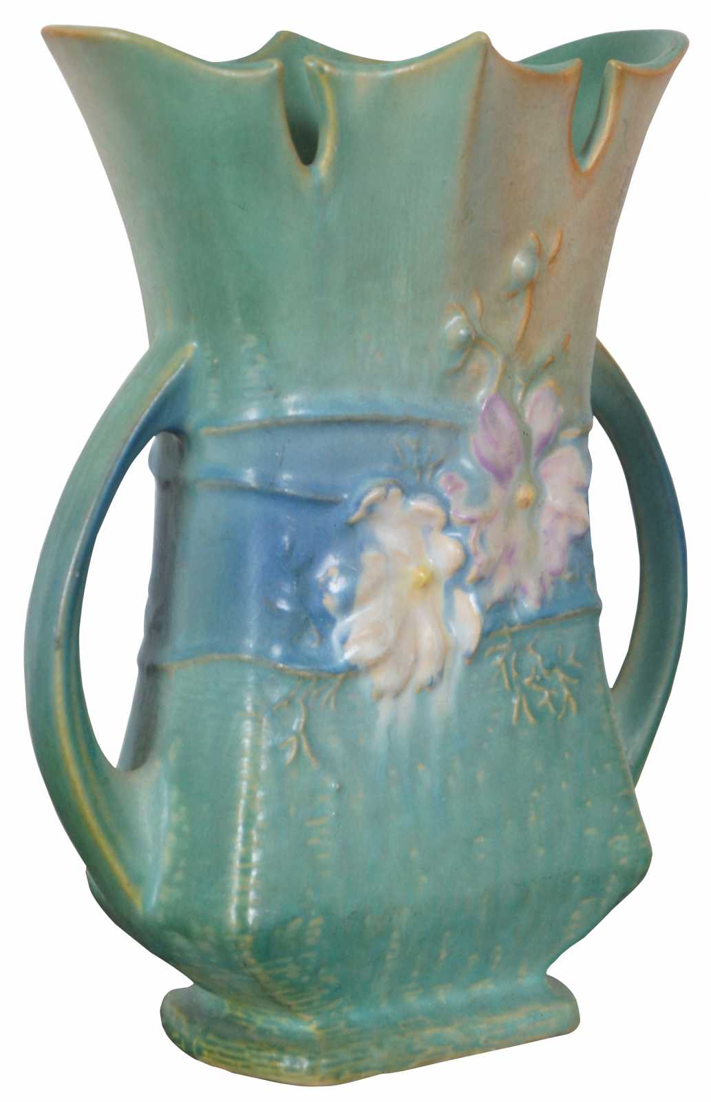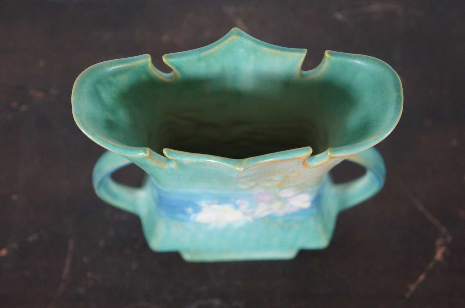 Antique early 1940s Roseville art pottery double handled Cosmos vase, model 950-8, in green and brown with a blue band decorated with flowers.