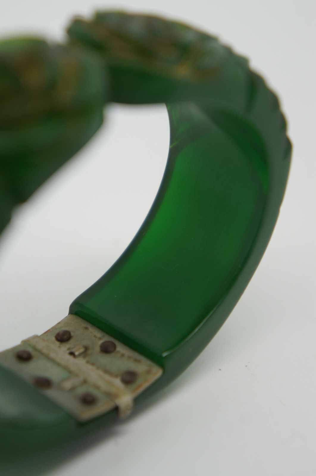 Early to mid 20th century Bakelite clamper bracelet in semi-translucent green with carved roses and spring hinge.