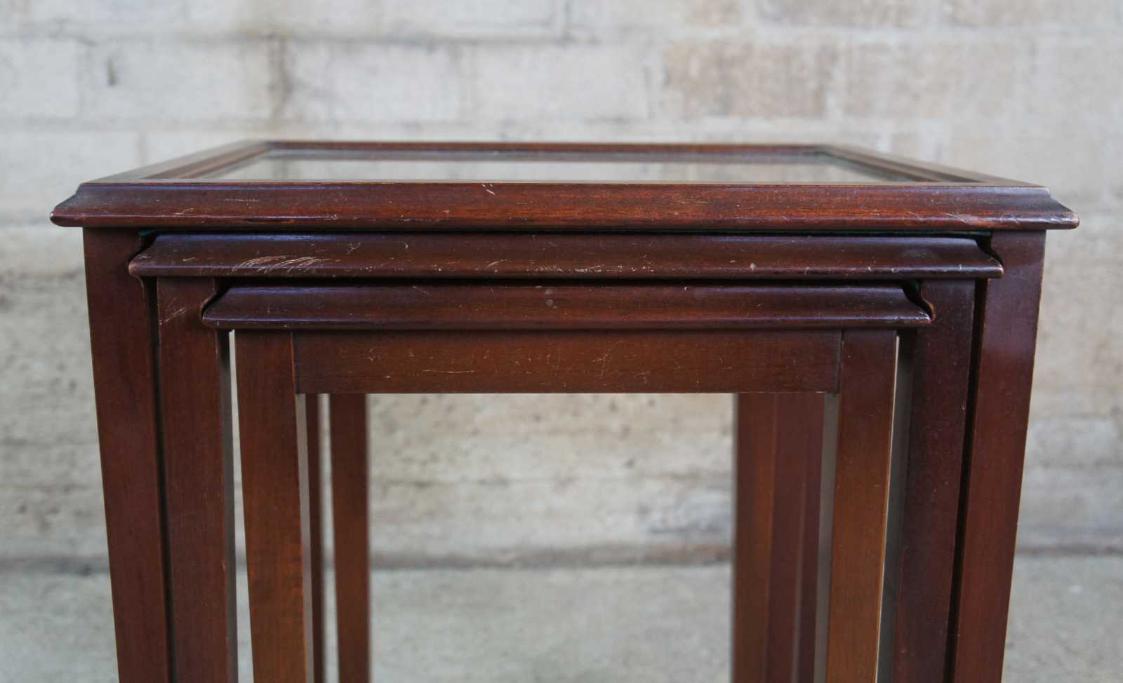 Nest of three antique Ferguson Bros Mfg Co side tables. Made of mahogany featuring a ogee edge, tapered legs, and glass tops. 5484.