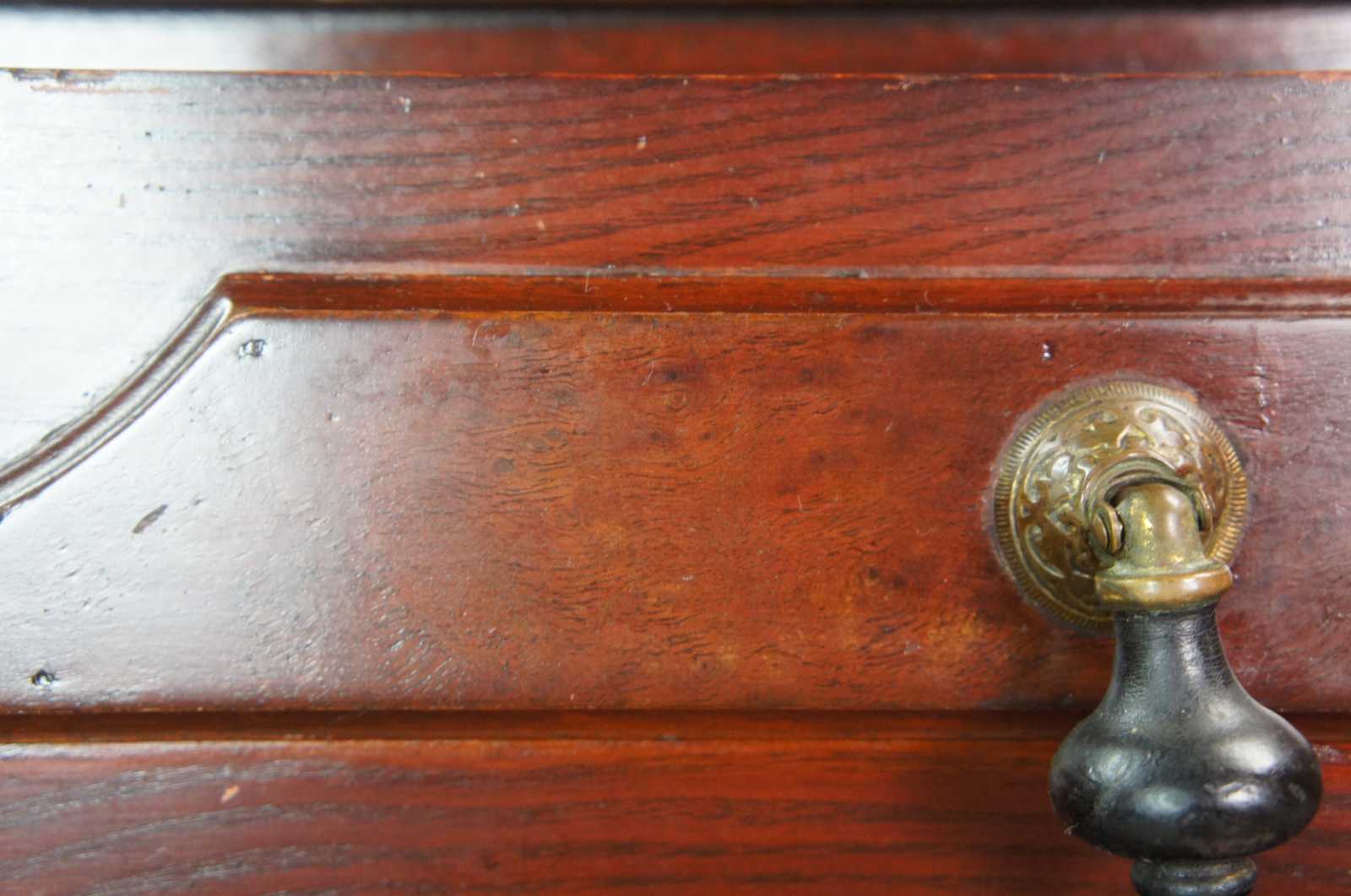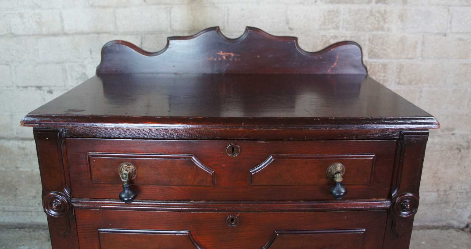 Antique Eastlake Victorian parlor washstand or chest. Made of pine featuring three paneled walnut burl drawers with ebonized teardrop pulls with brass rosettes, carved accents, serpentine backsplash and casters.