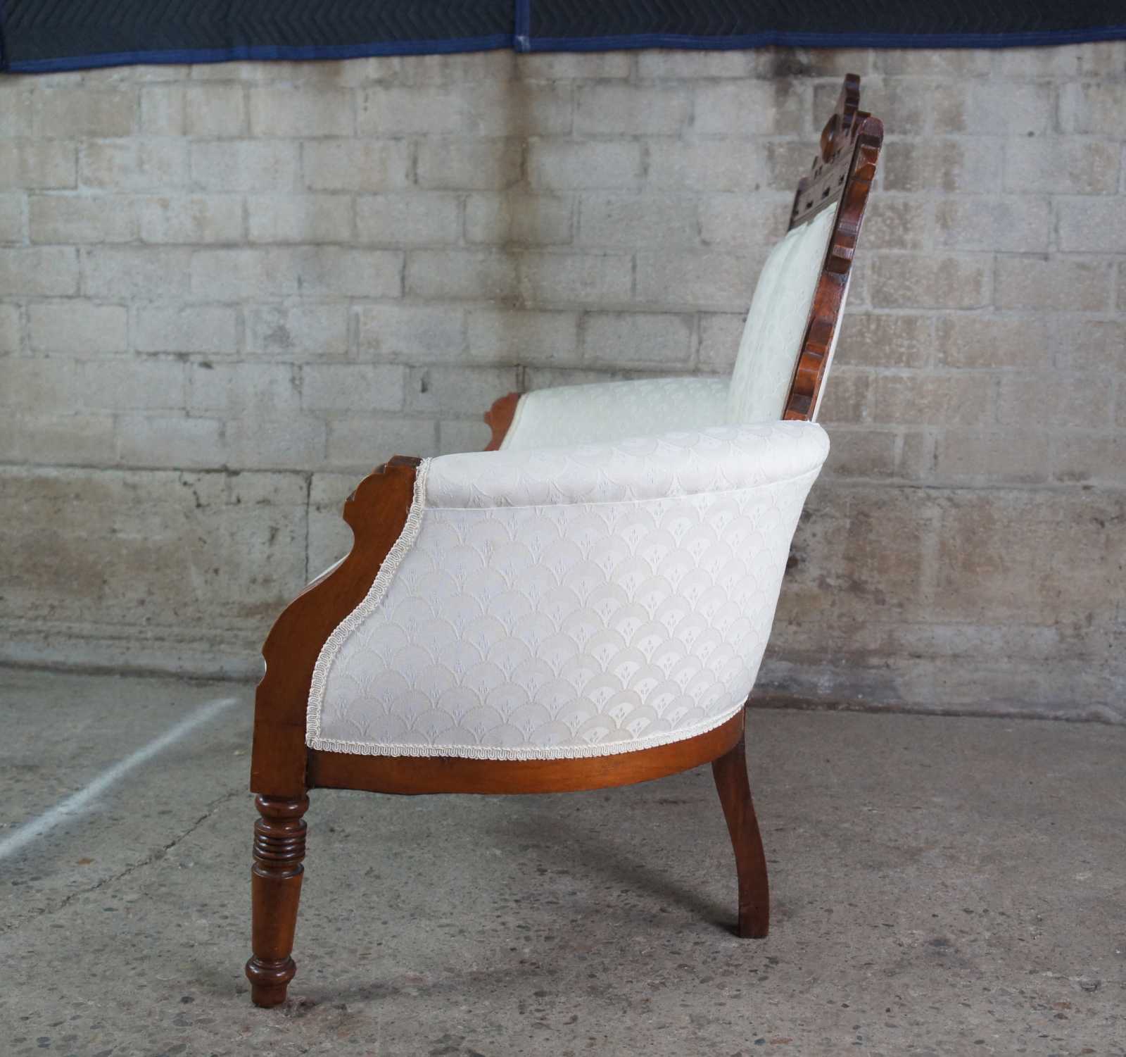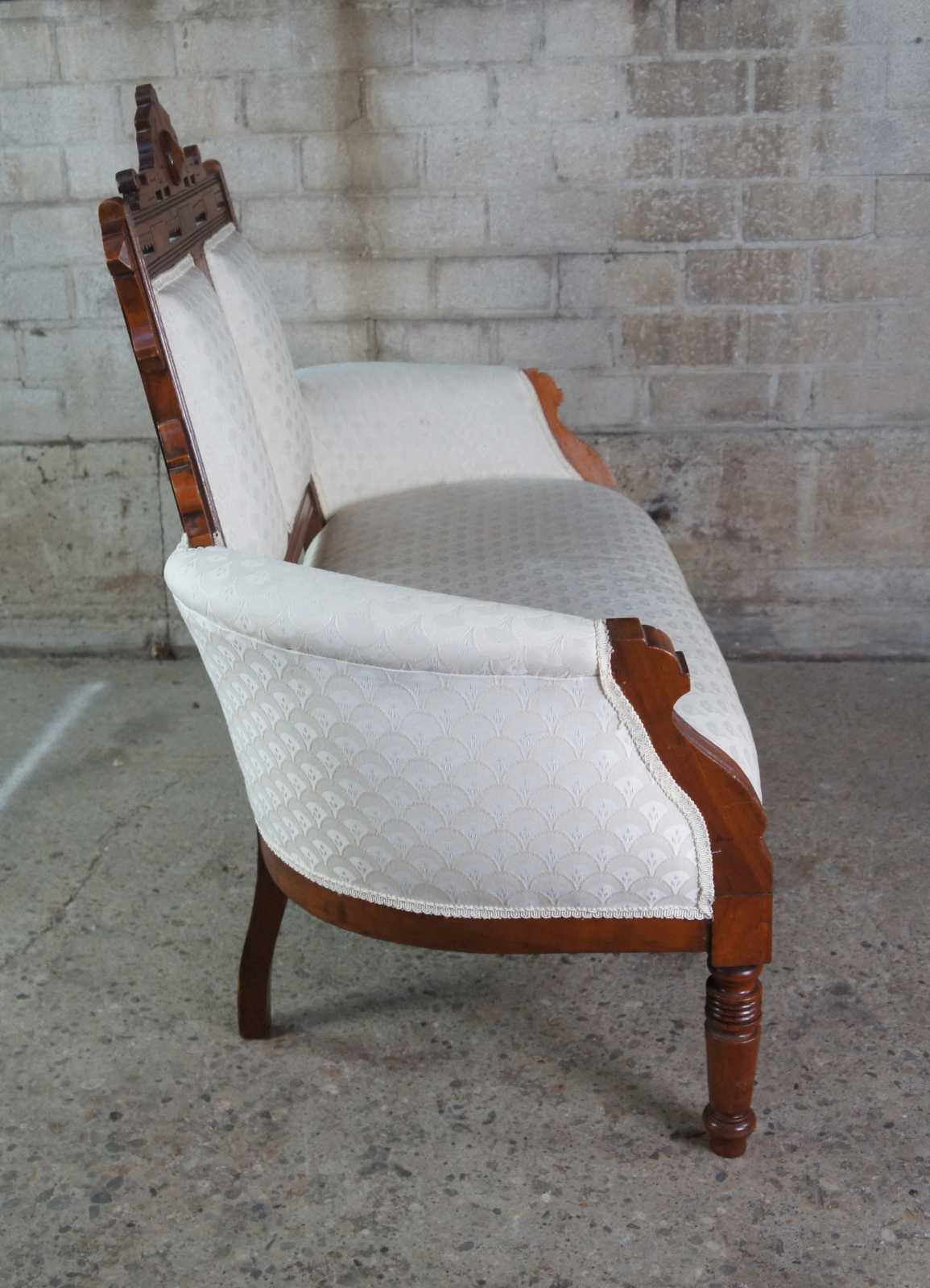 Antique Victorian Eastlake parlor settee or love seat. Made of walnut featuring a flare of Renaissance Revival with carved pierced back and frame with turned legs supporting a wide frame and white upholstery.