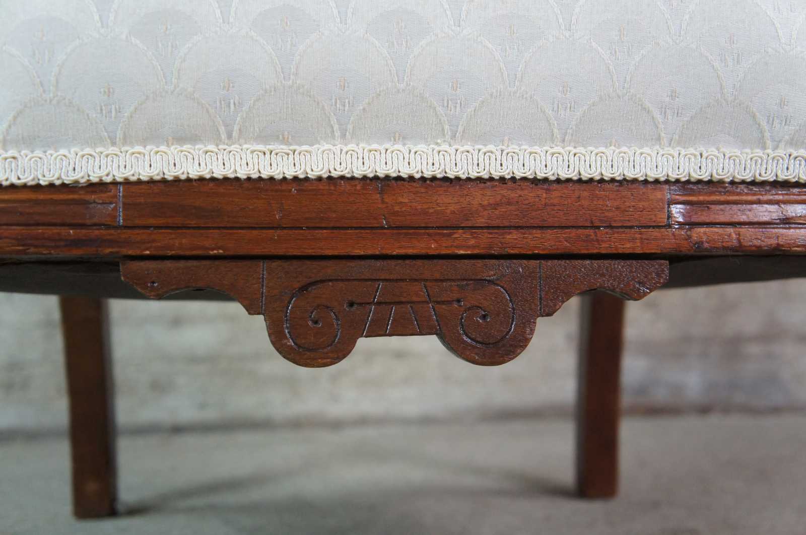 Good antique condition, wear and distressing commensurate with age and use, edge wear, blemishes to upholstery, missing right side trim.