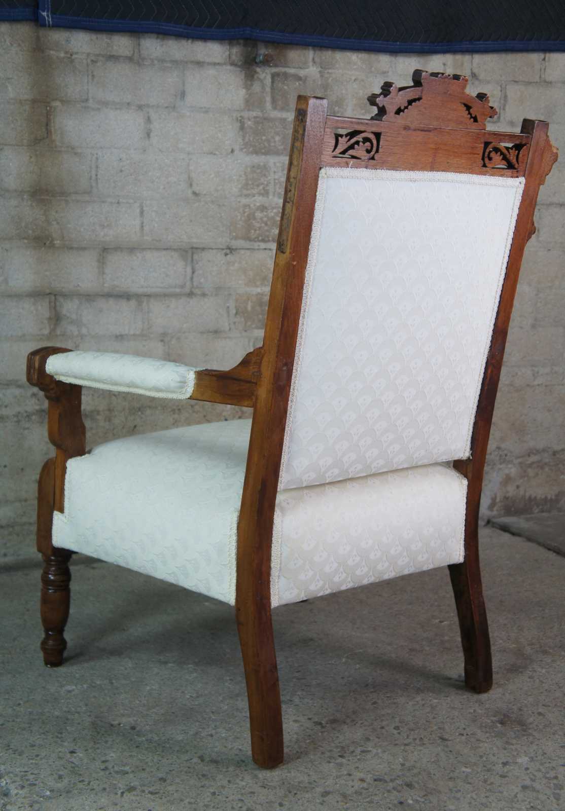 Antique Victorian parlor armchair. Made of walnut with carved Eastlake accents that features reticulated floral, turned and fluted accents/