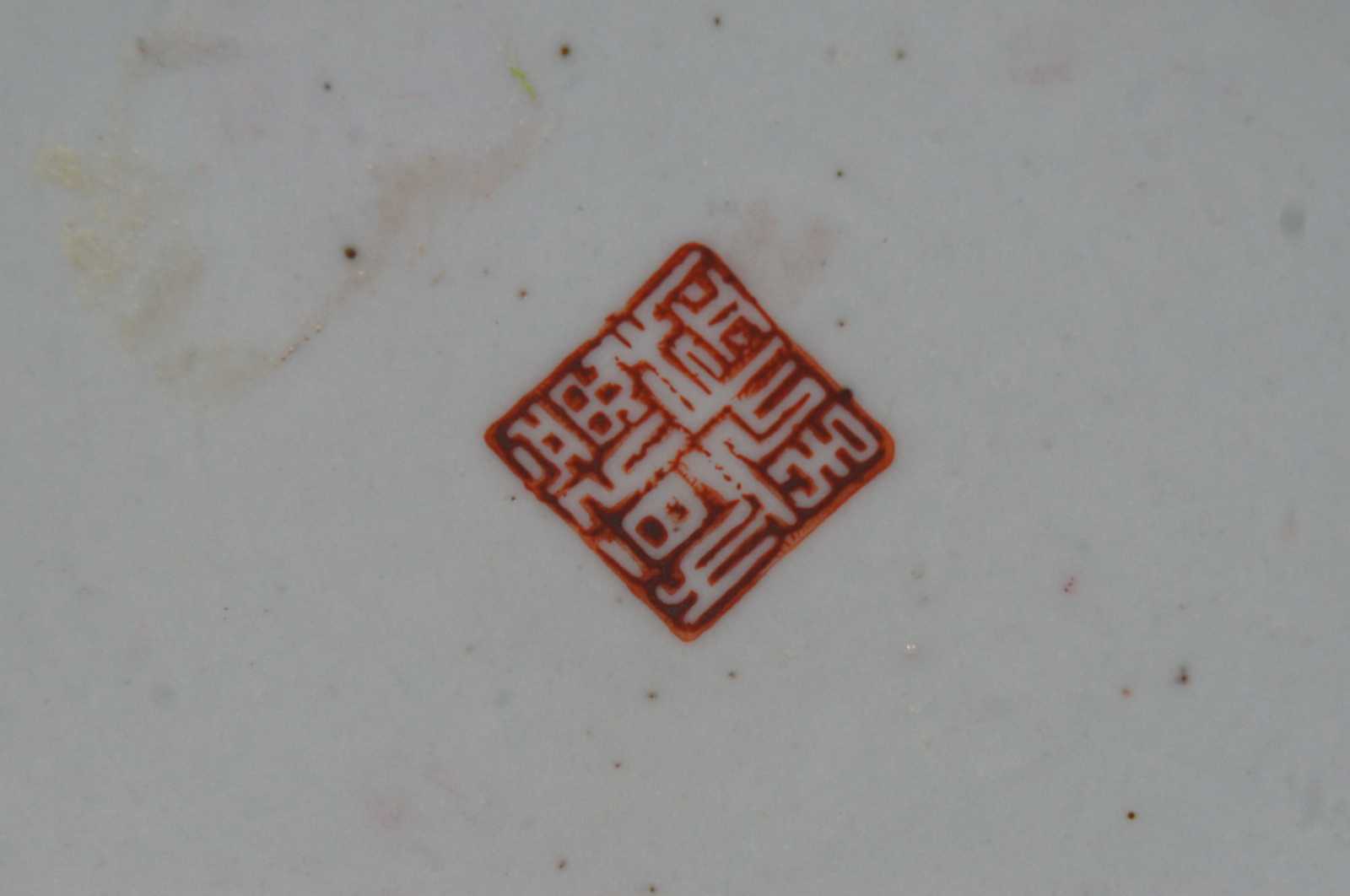 Antique Chinese flared wide mouth serpentine shaped porcelain vase decorated with brown leaves and pink and yellow flowers; marked on the base.