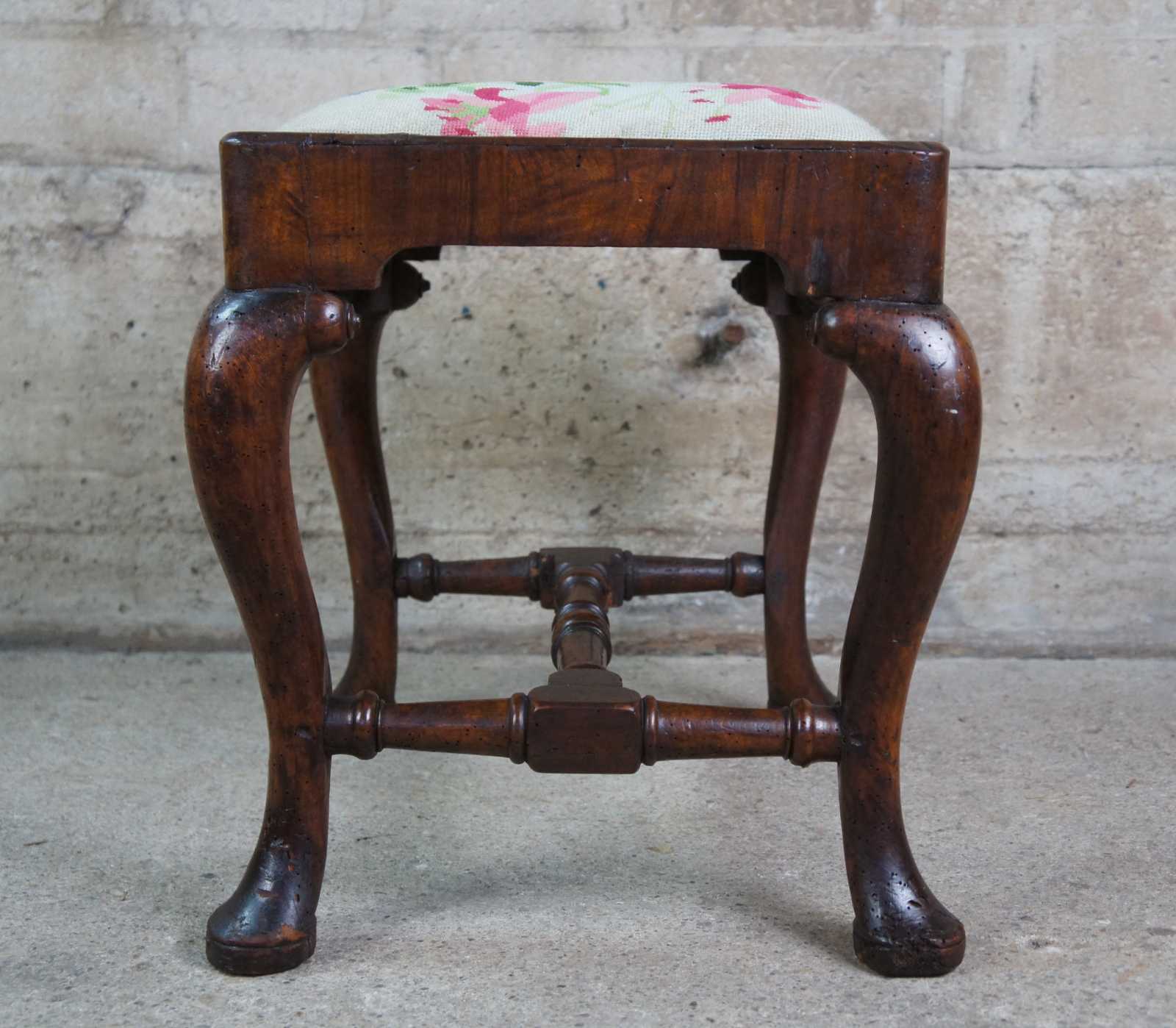 An exceptional 18th century Georgian Stool. A rectangular form made from Mahogany with floral needlepoint seat and cabriole legs with pad feet. Legs are connected by a turned H stretcher.
