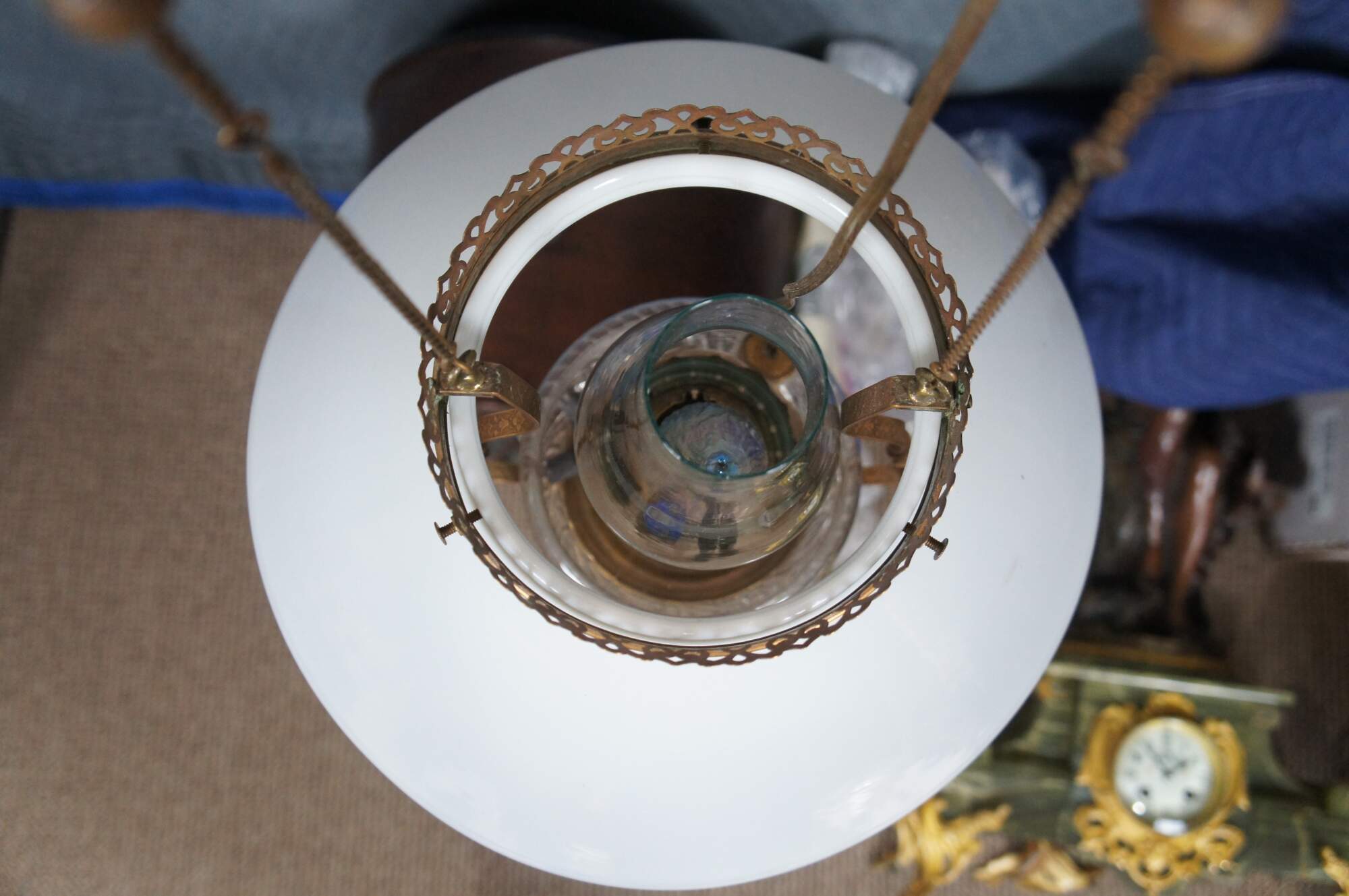 Antique late 19th century Aesthetic Movement cieling mounted parlor light / chandelier featuring pierced brass design with pressed glass oil reservoir, milk glass shade, clear hurricane and brass smoke bell. Suspends from cieling mount with two chains that can be pulled down or retracted up into the hidden spool / pulley to adjust the height - mechanism is fully functional. Originally oil but now converted to electric.