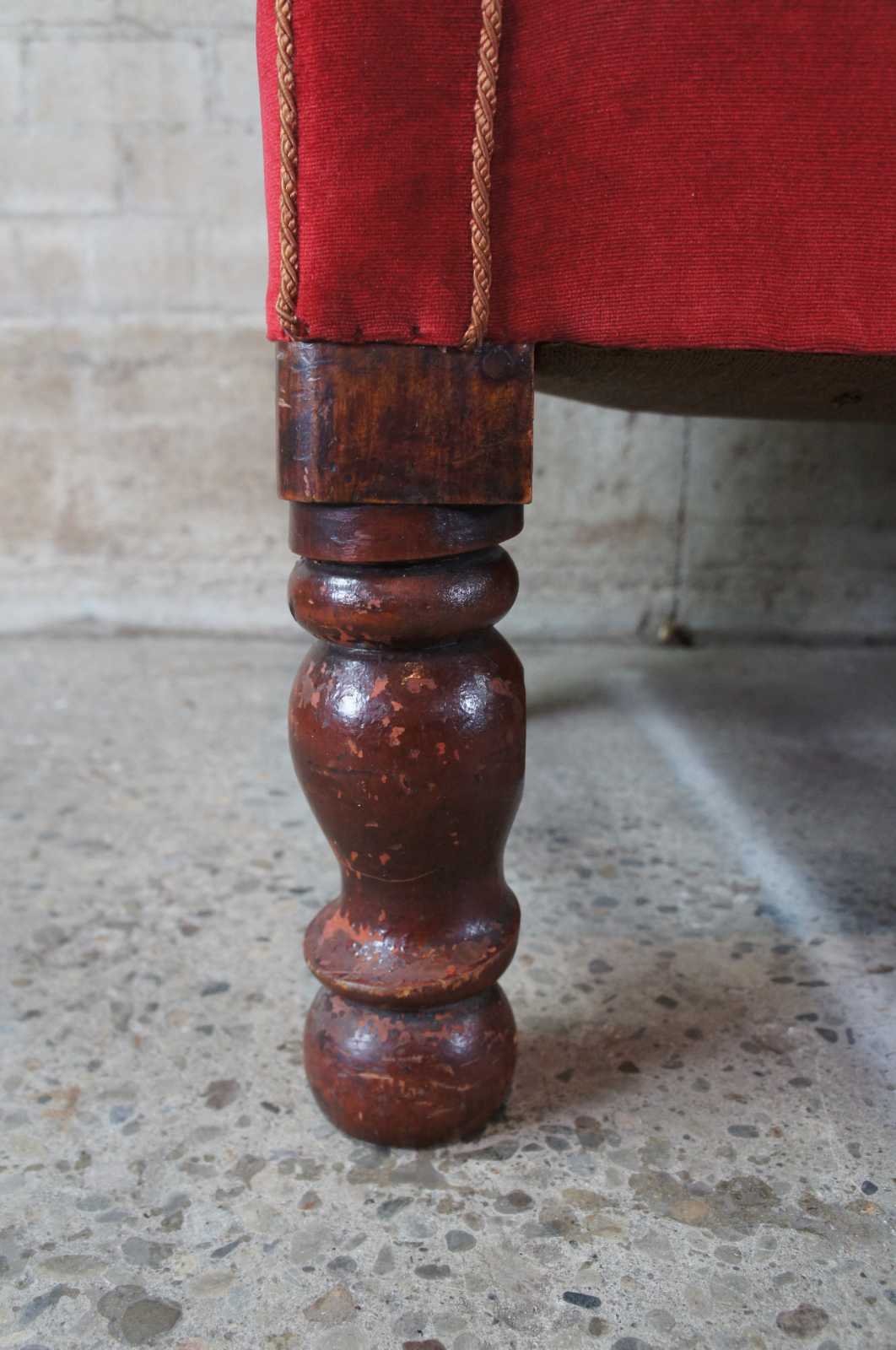 Good antique condition, wear and distressing commensurate with age and use, distressing and finish loss, some imperfections to fabric, horsehair coming through on back right corner of seat as well as on small puncture to seat.