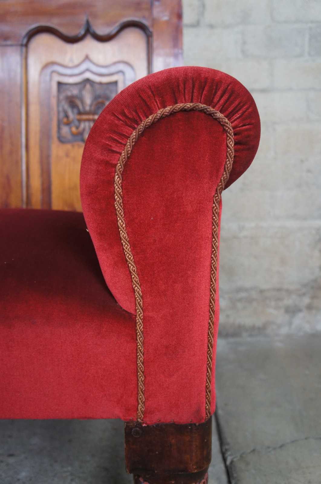 Extraordinary 18th century English oak pub bench or sofa. A rectangular form with high back and red velvet upholstery. Features Gothic revival panels and Fleur De Lis carvings. The bench is supported by robust turned bun feet. Origin London, England.