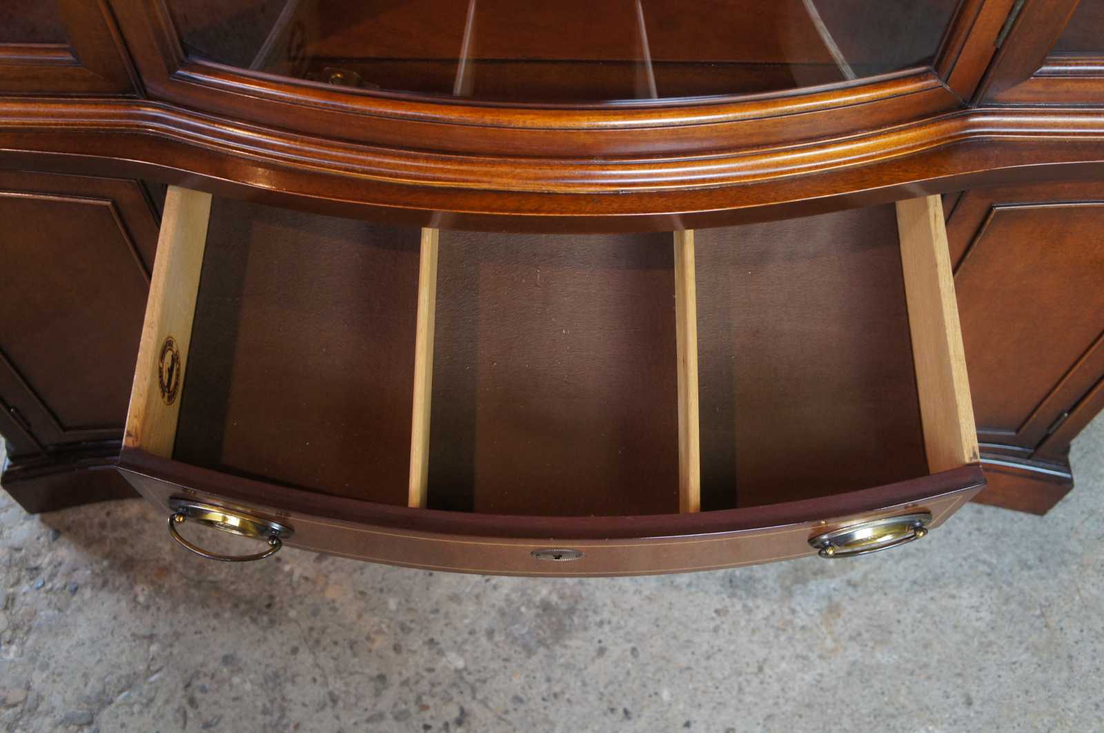 Vintage mid-century bow front china cabinet, made by Bassett Furniture in the 1950s as part of their Monticello collection. Featuring richly-hued mahogany and a curved glass door which matches the curved drawer fronts. This piece was constructed with quality in mind, and features plenty of storage.
