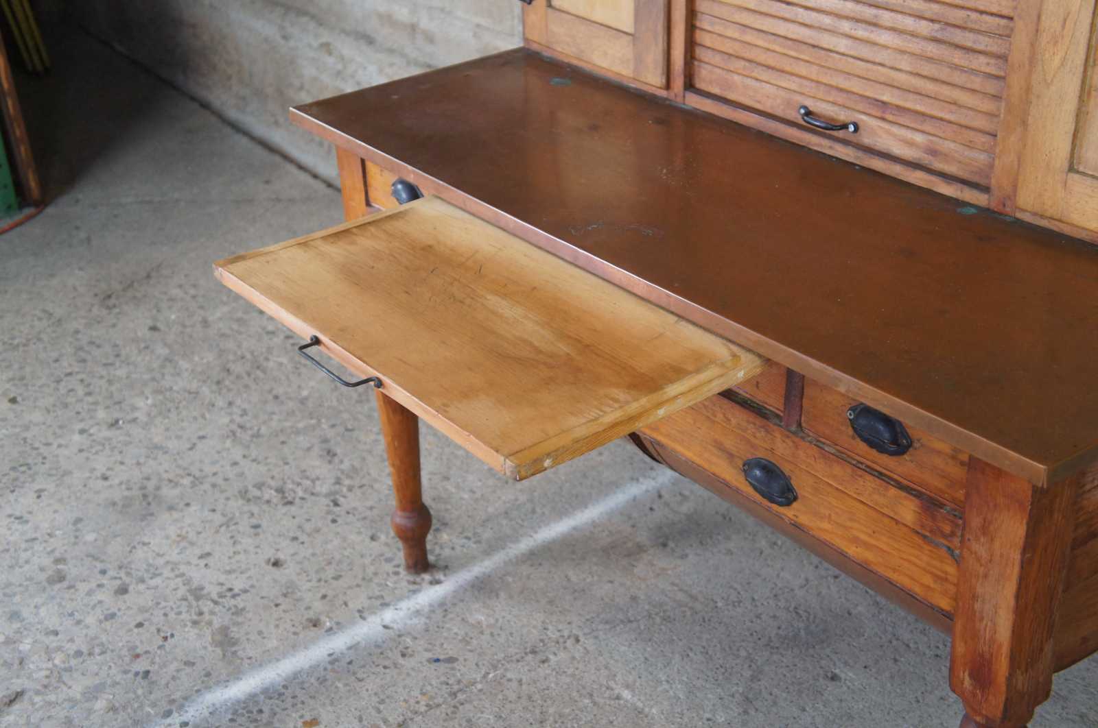 An exquisite Bakers cabinet by Montgomery Ward. Made from oak with 5 drawers, copper work surface and stepback hutch featuring etched glass, a tambour door and articulating sifter. Includes copper lined flour bins and iron hardware.