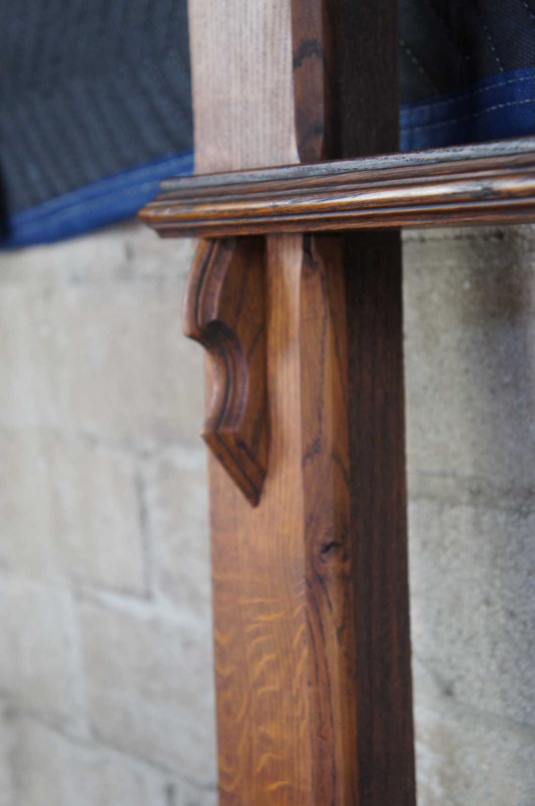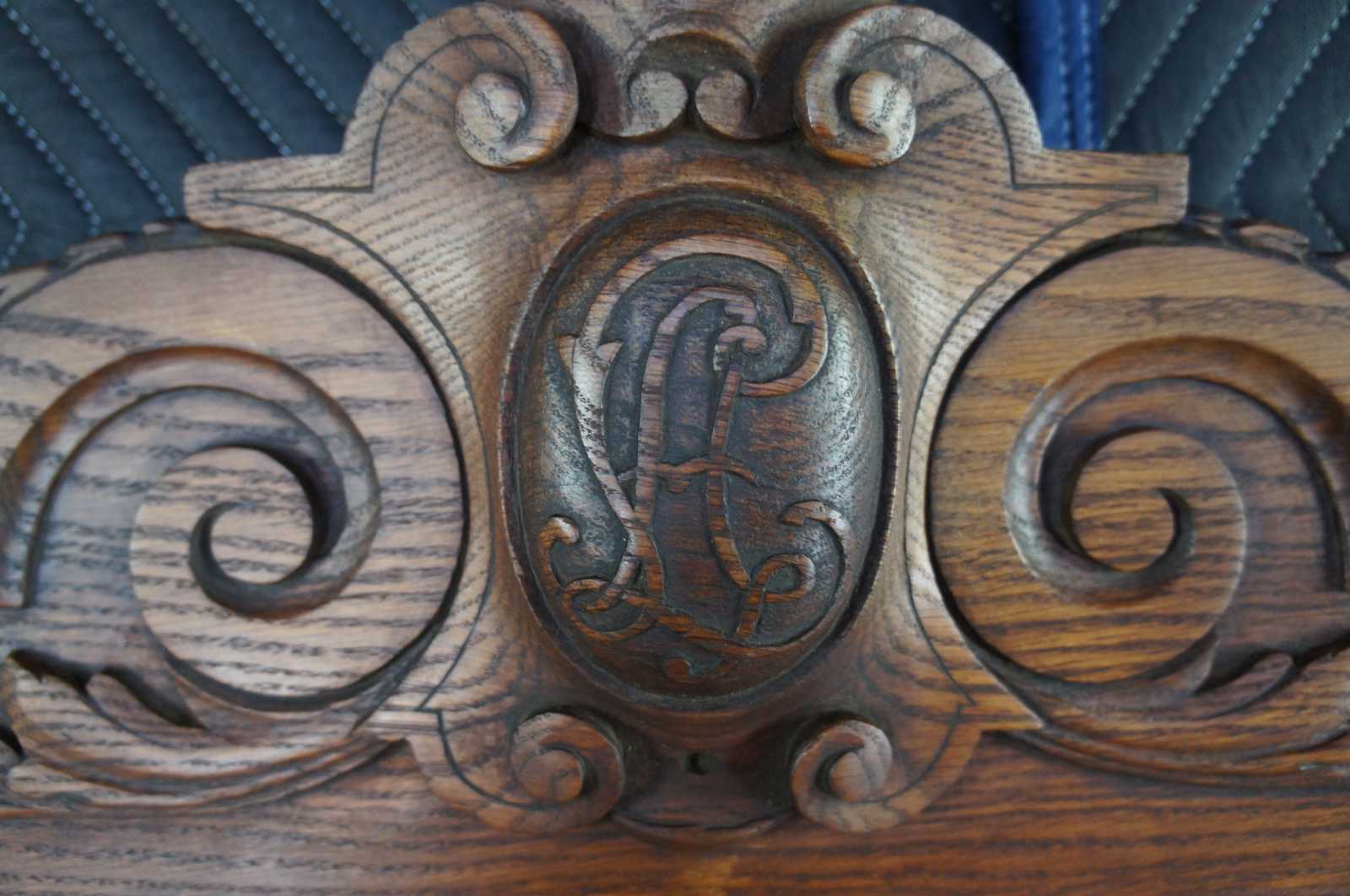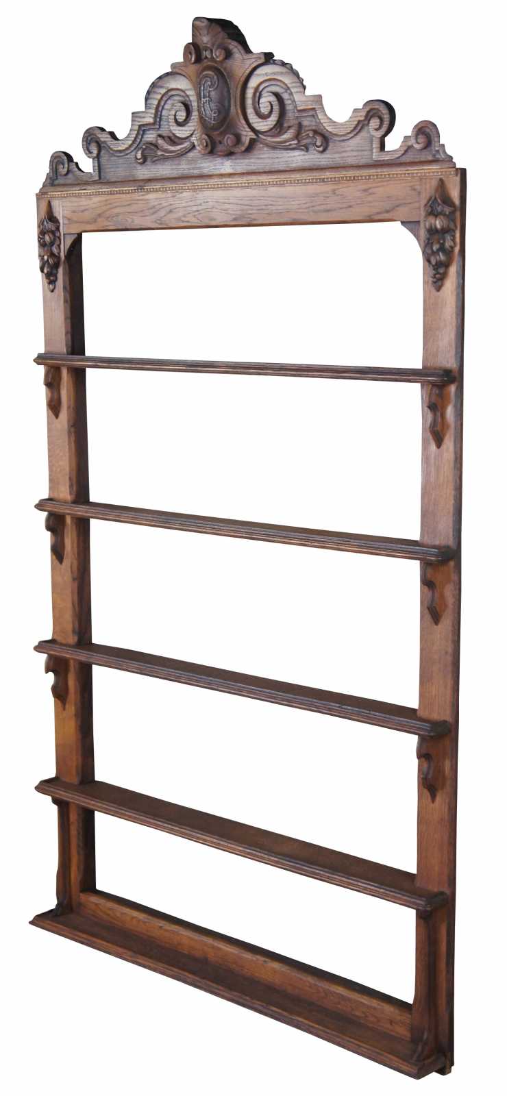An exquisite Victorian era French hanging plate rack from last quarter of the 19th century. Made from oak with five open shelves supported by corbels. Includes ornate fruit and nut carvings set beneath gadrooning trim. Features an ornately scrolled crown centered by a convex crest. The letters "LA" are carved into the center. The slim profile allows for versatile use and display of collectibles.