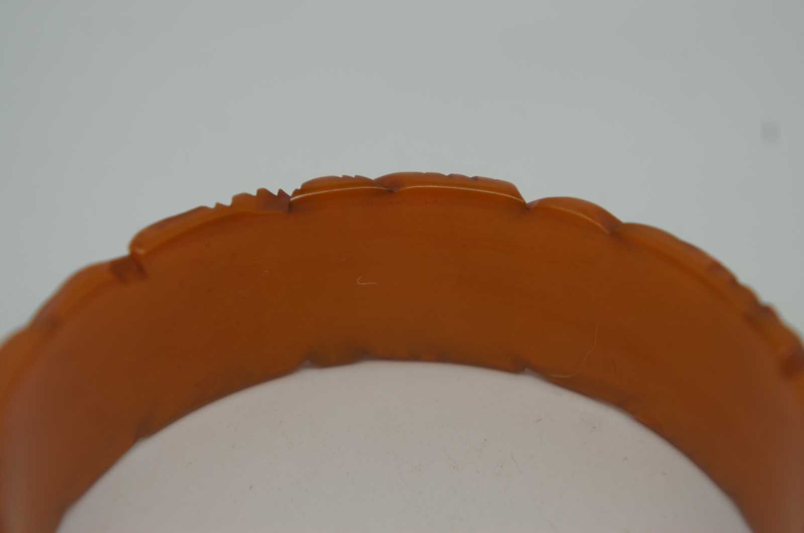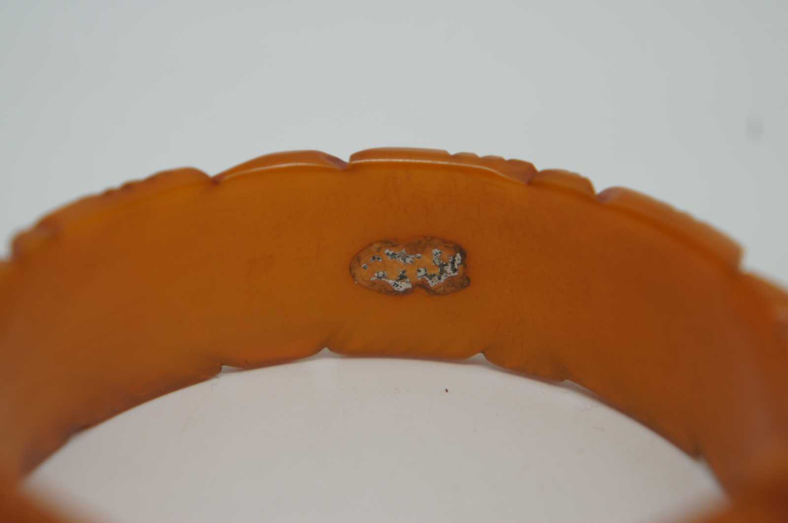 Early to mid 20th century pumpkin orange Bakelite bangle bracelet with heavily carved tiki inspired flowers or leaves.