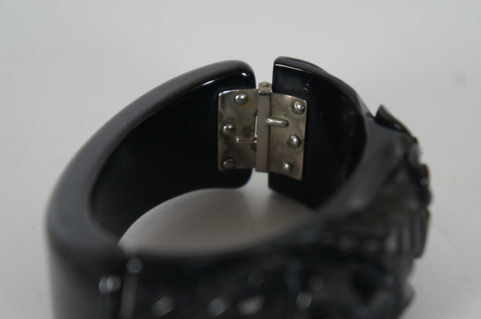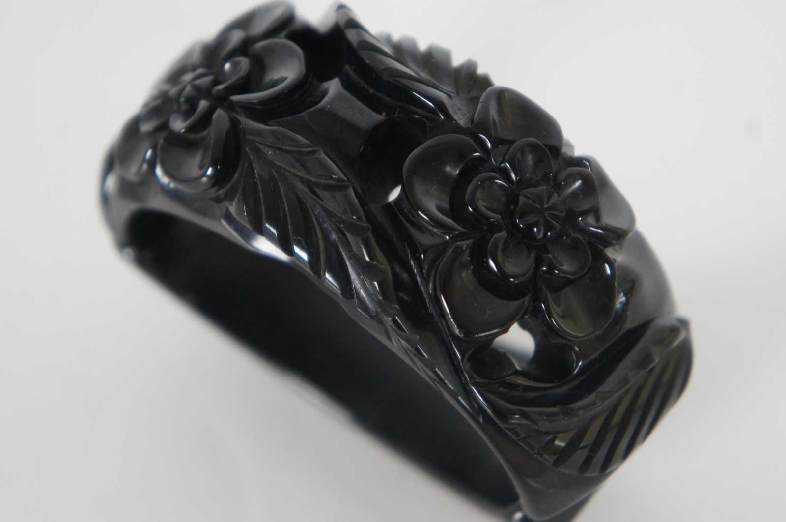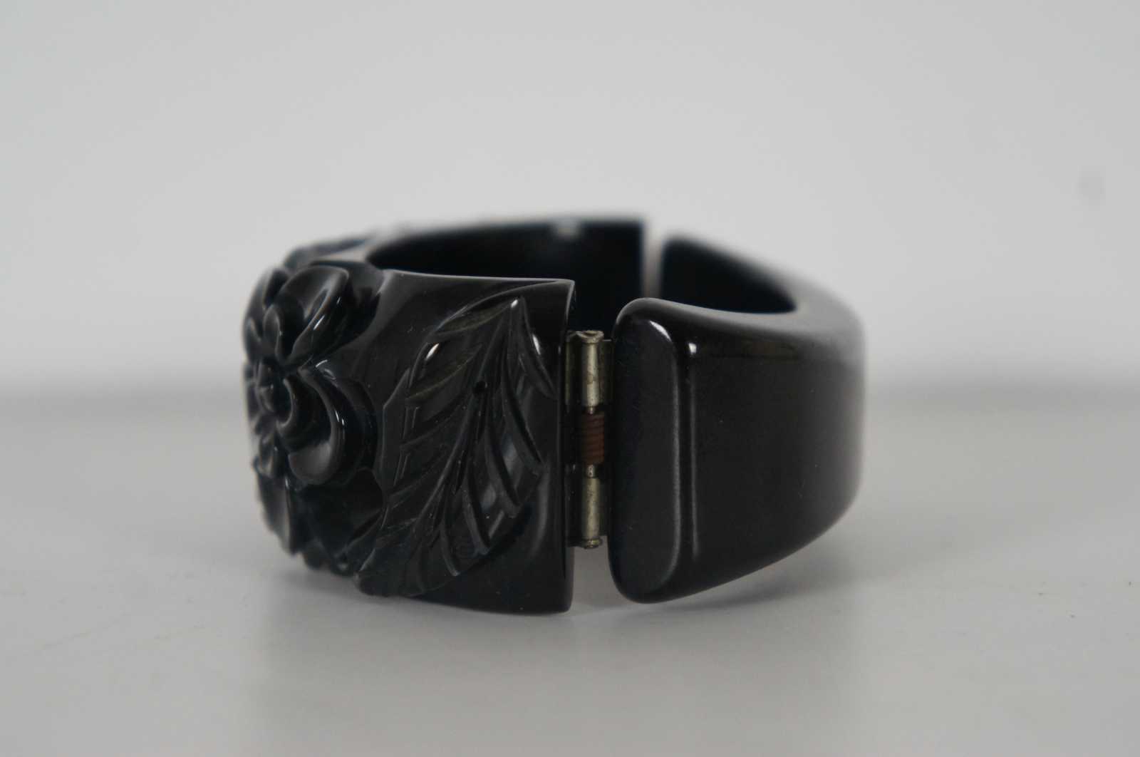Early to mid 20th century black Bakelite clamper bracelet with spring hinge and carved flowers and leaves.