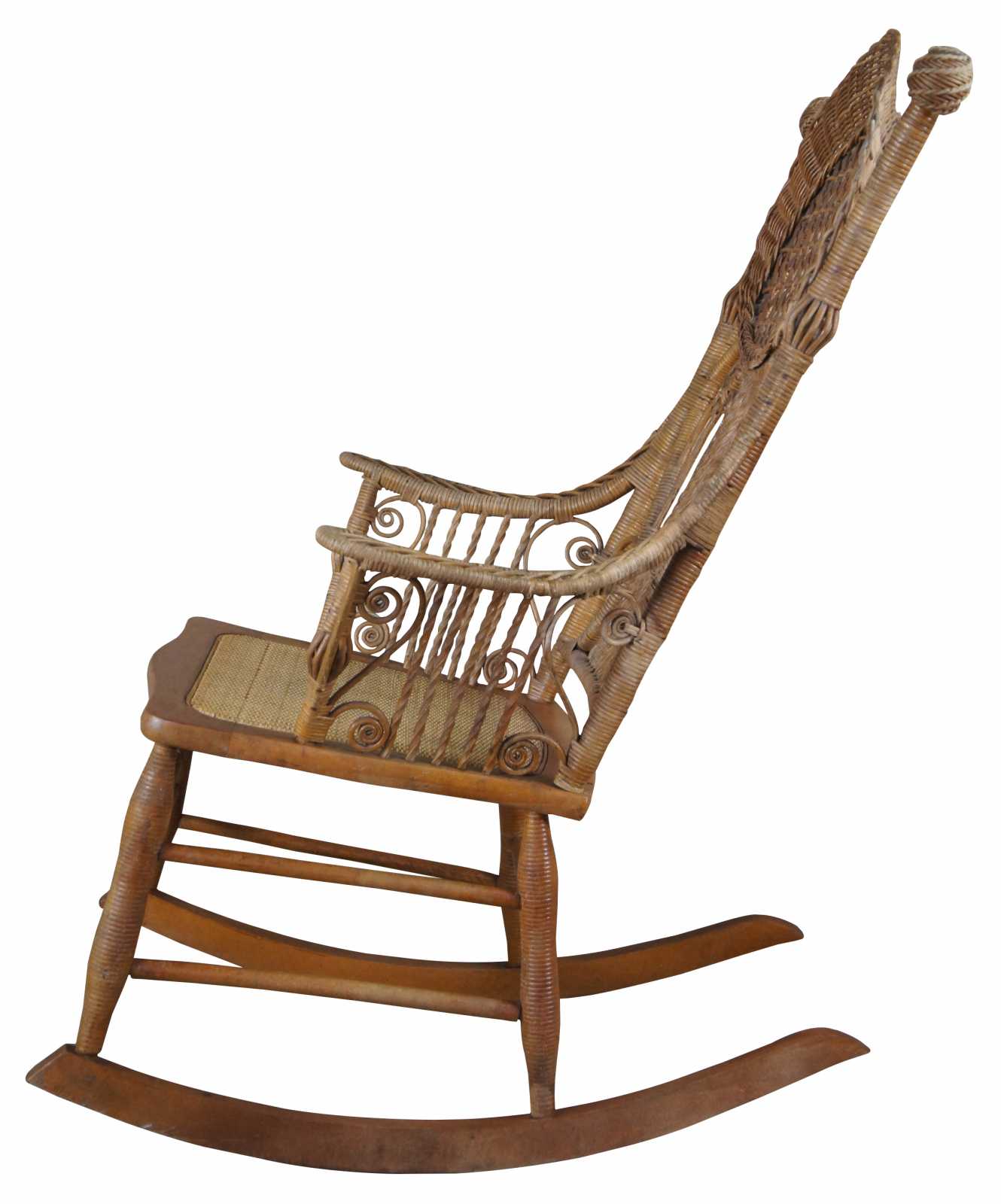 Early 1900s Heywood Wakefield Rocking chair. Features a wood frame wrapped in wicker with a rattan seat. Includes scrolled and twisted supports as well as braiding and lattice design. Remnants of original tag can be seen along the underside.