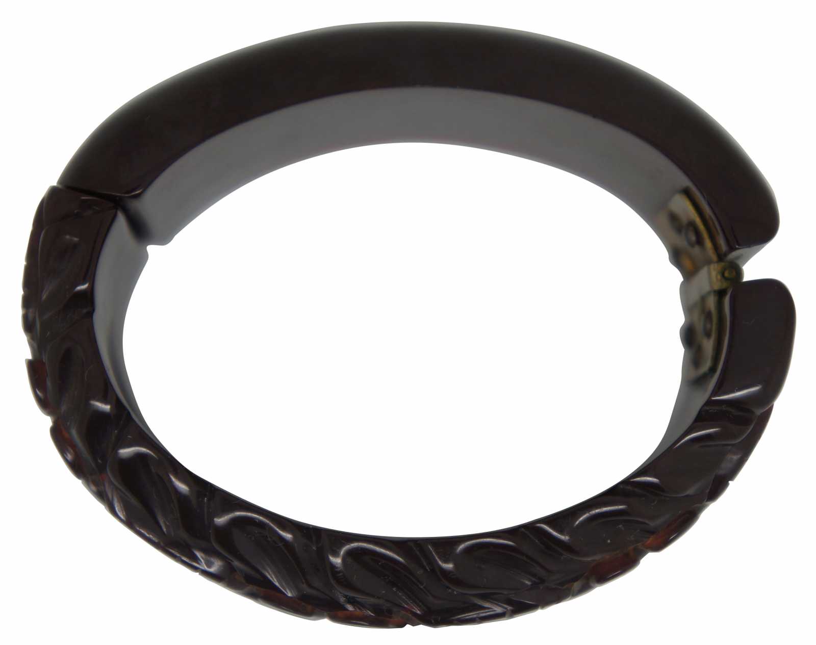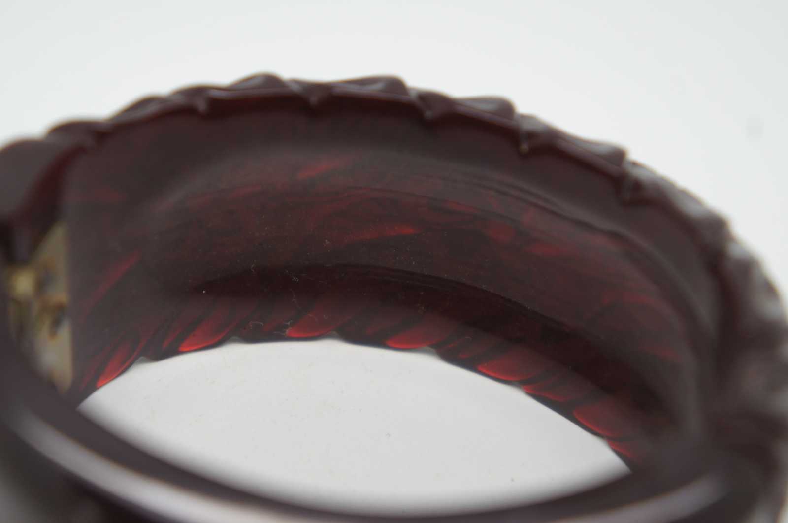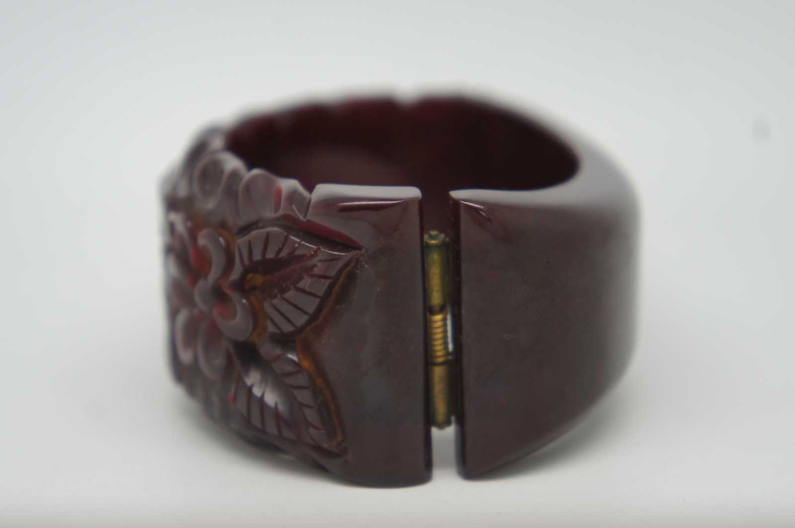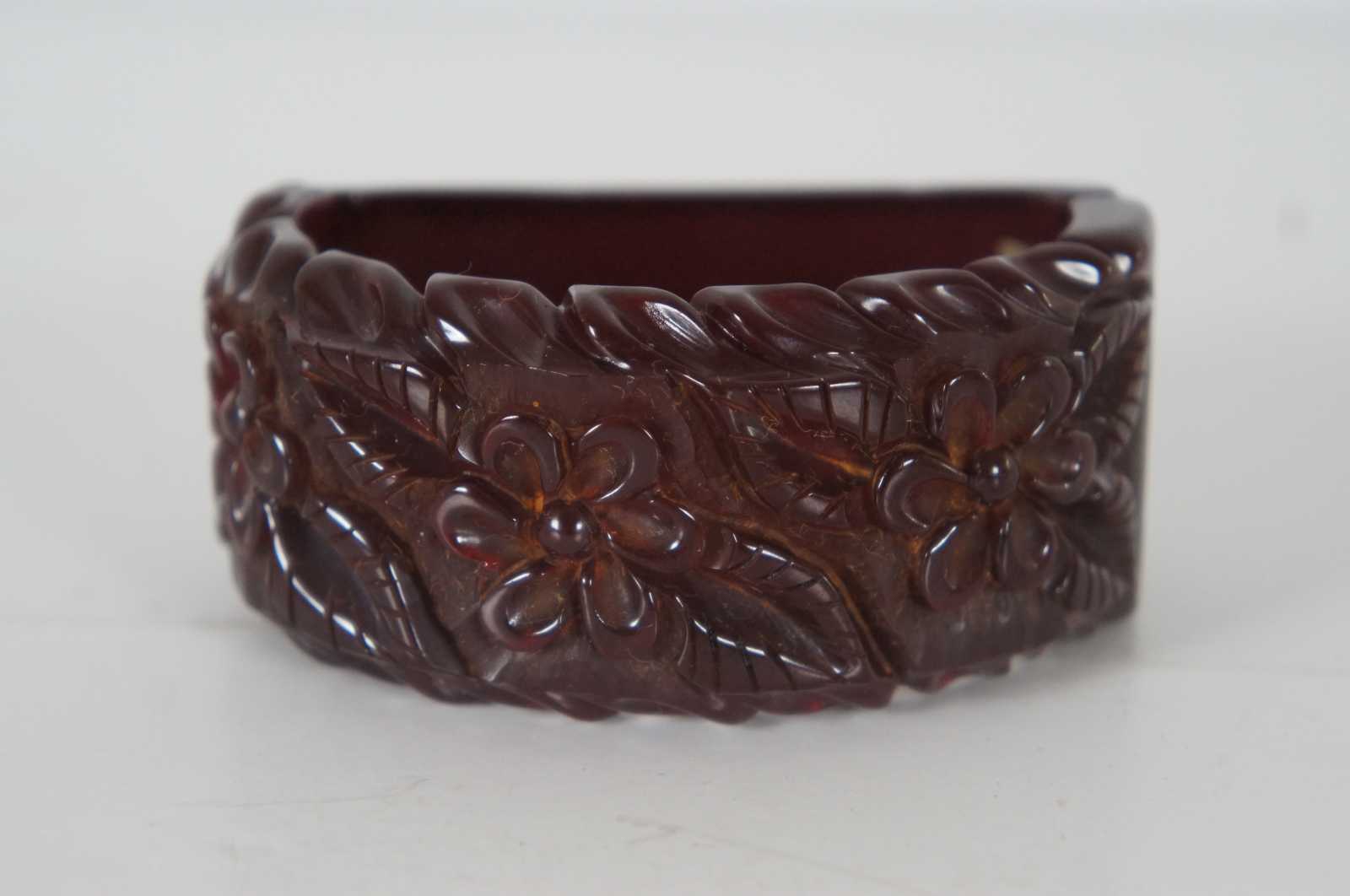 Early to mid 20th century Bakelite clamper bracelet with a carved floral and leaf pattern in semi-translucent oxblood/maroon with spring hinge.