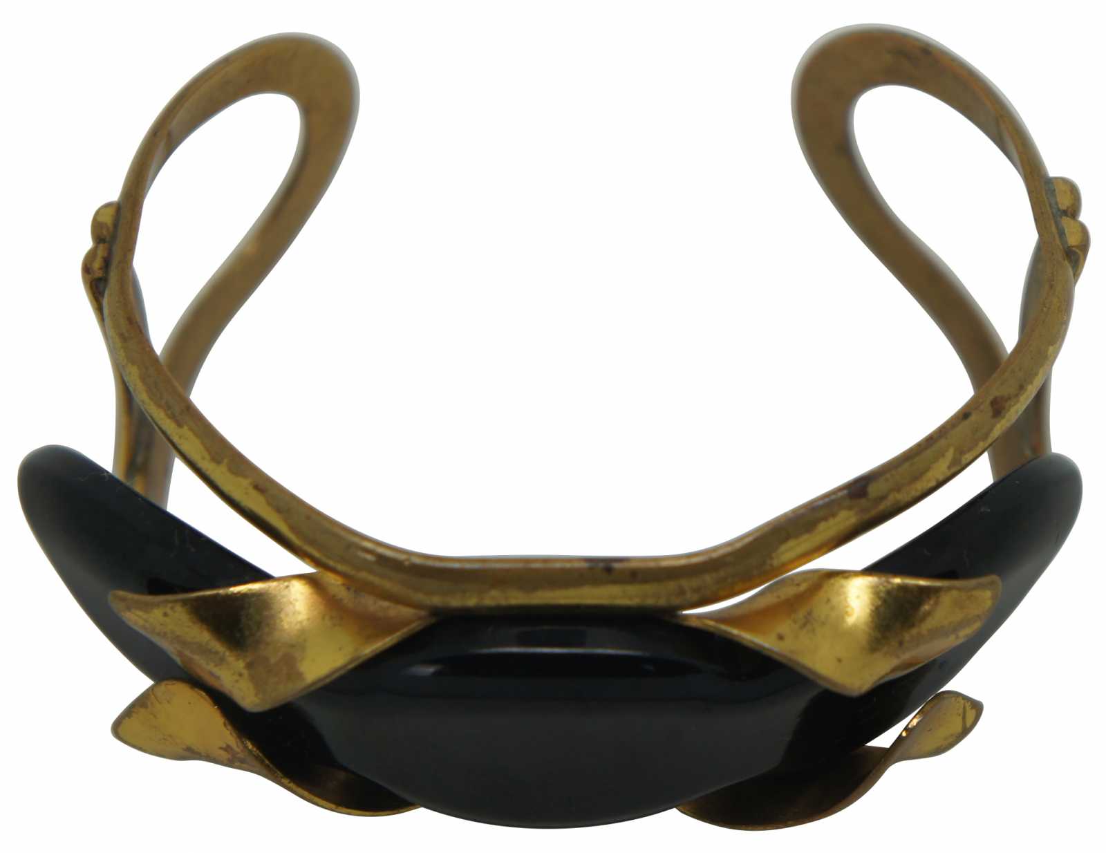 Early to mid 20th century gold tone brass cuff bracelet with black Bakelite stone.