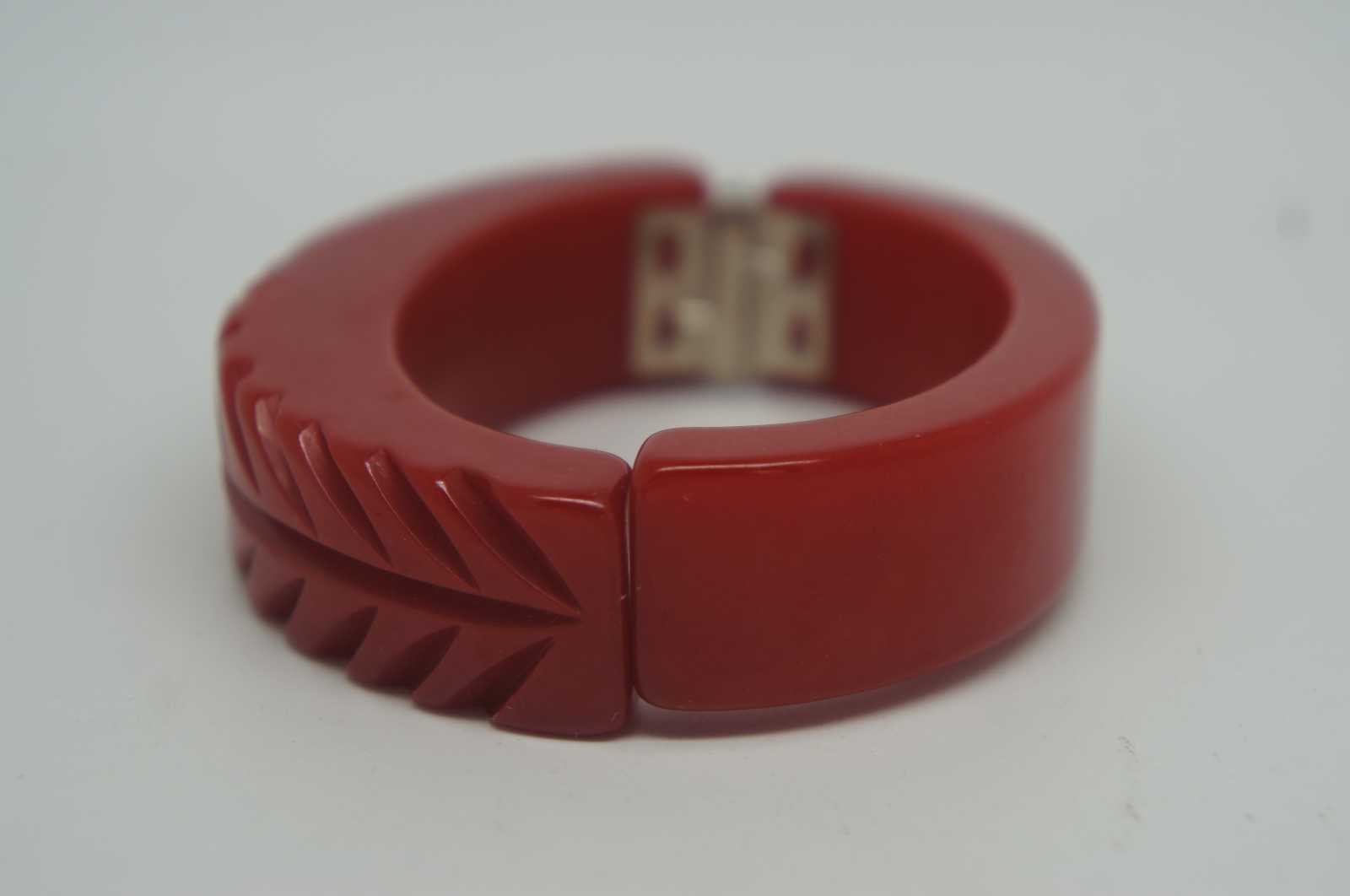 Early to mid 20th century Bakelite clamper bracelet in candy apple red with a carved tribal inspired leaf motif and spring hinge.