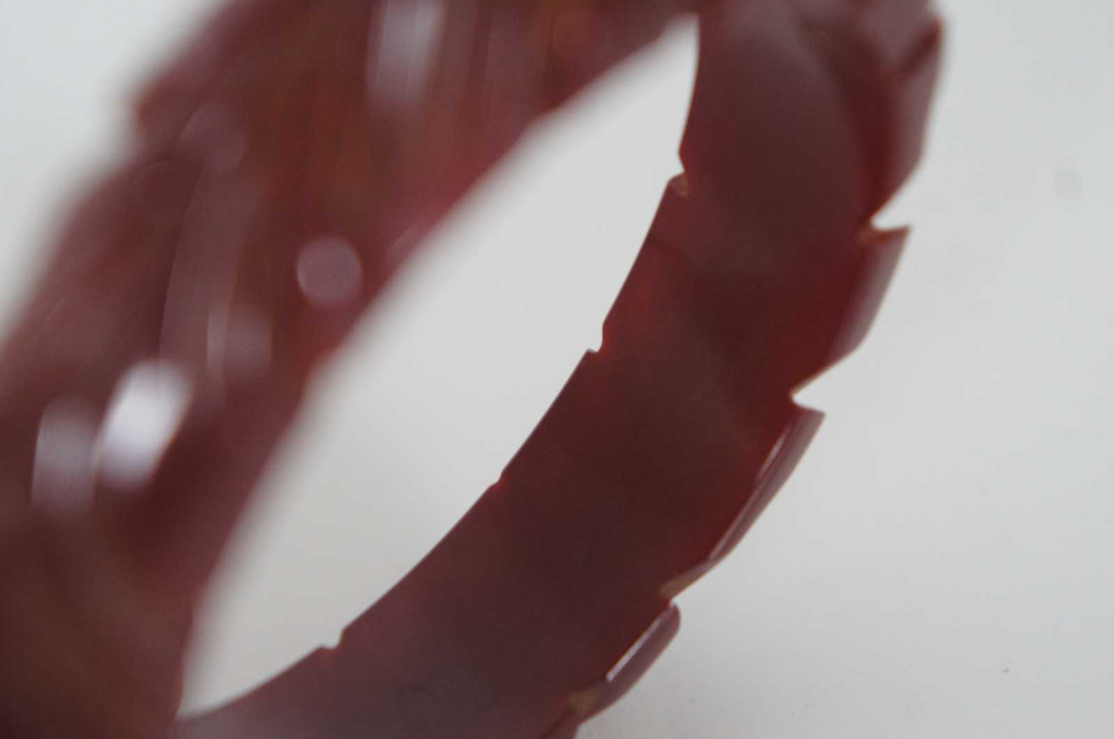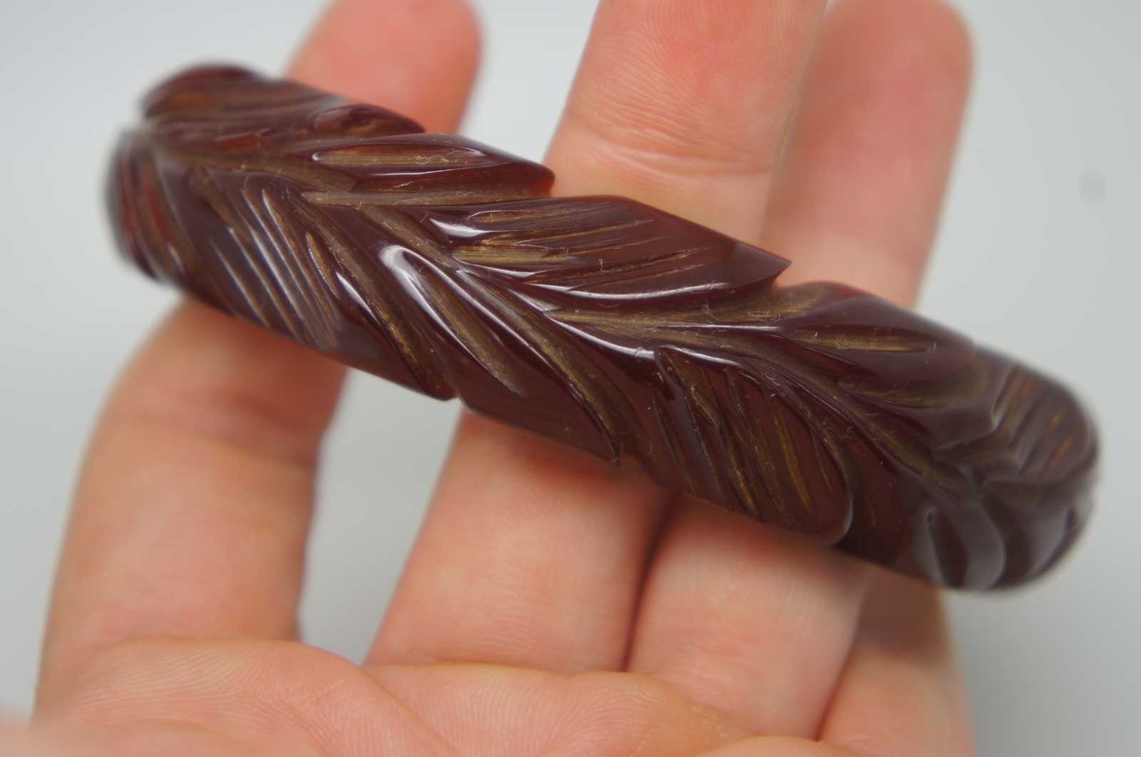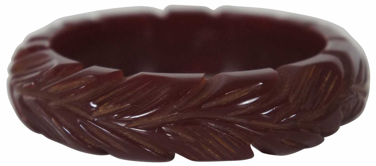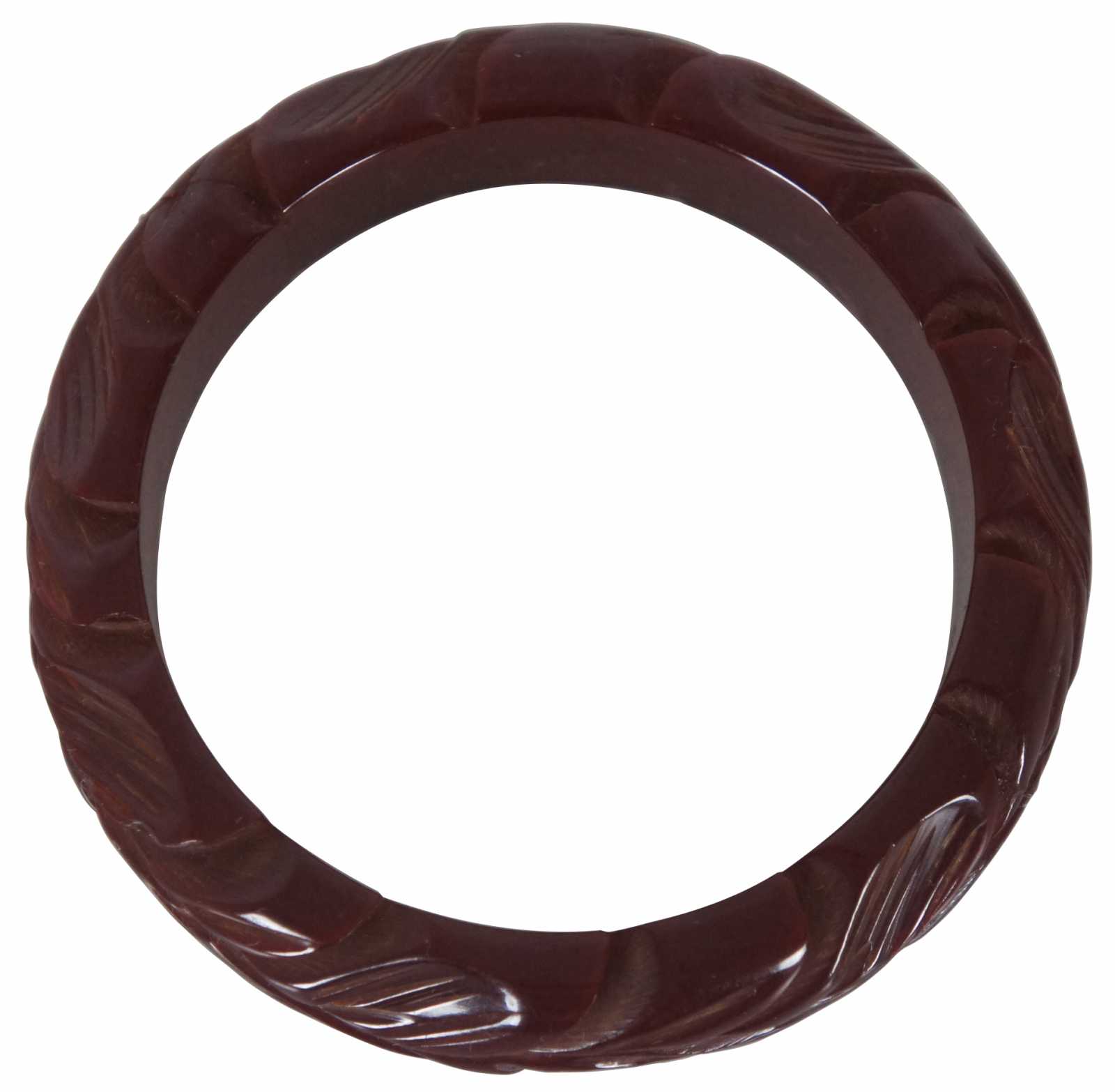 Early to mid 20th century Bakelite bangle bracelet in semi-translucent oxblood/maroon heavily carved with leaves.