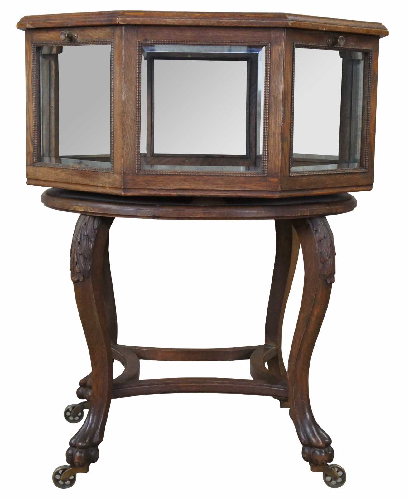 An exquisite and rare Victorian octagonal shaped Vitrine or Bijouterie, Last quarter of the 19th century. Made of quartersawn oak featuring rotating top with beveled glass, four drop front doors over serpentine legs with claw feet and casters.