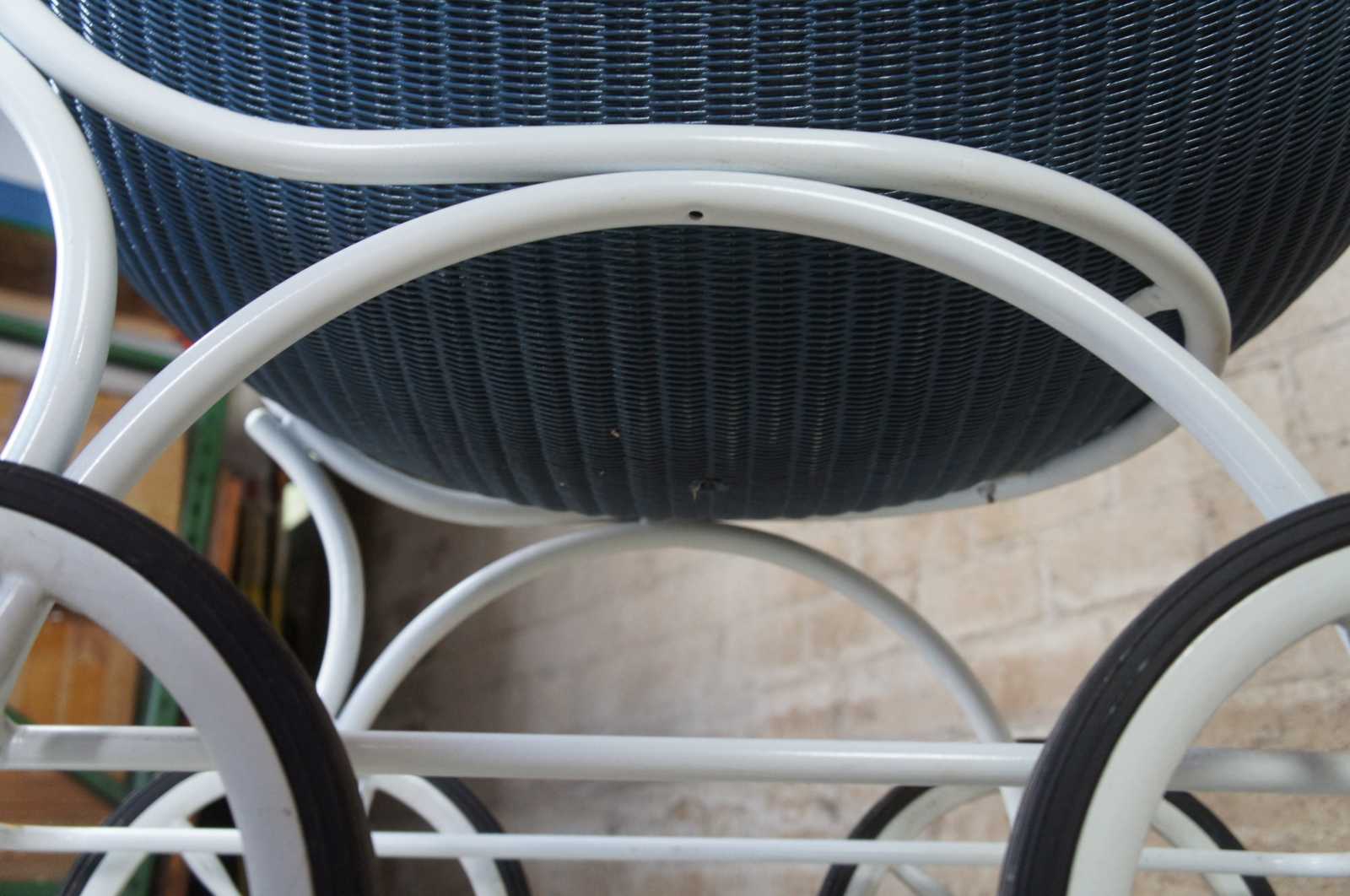 Mid century faux baby stroller beverage cooler or cart. Made of wicker with tubular metal frame featuring a top that flips to access both sides of cooler, plug to drain the melted ice, and a lower glass tier with gallery for supply storage.