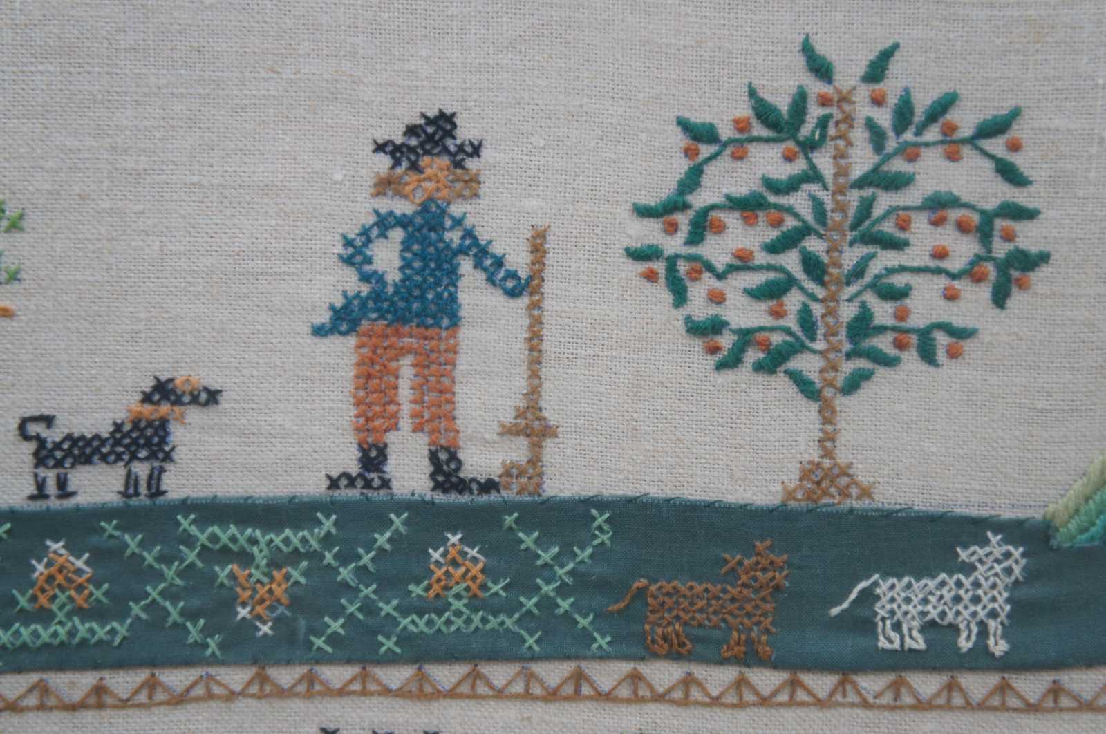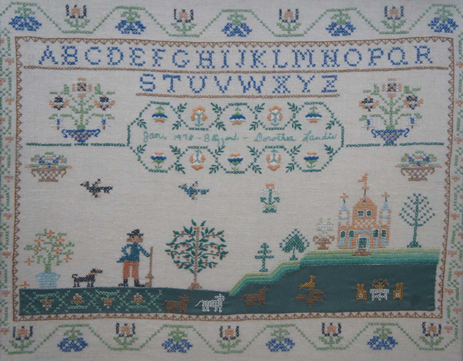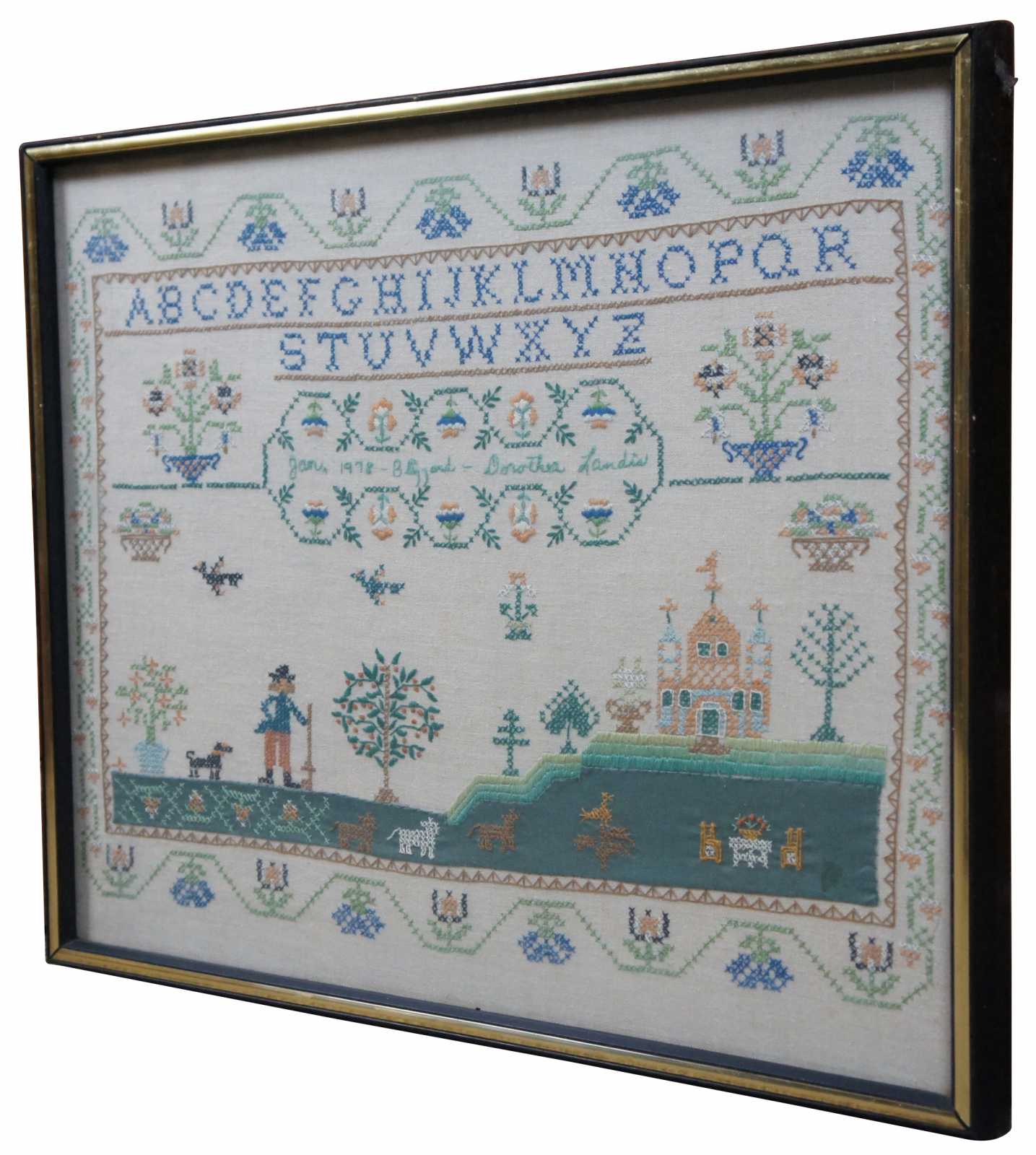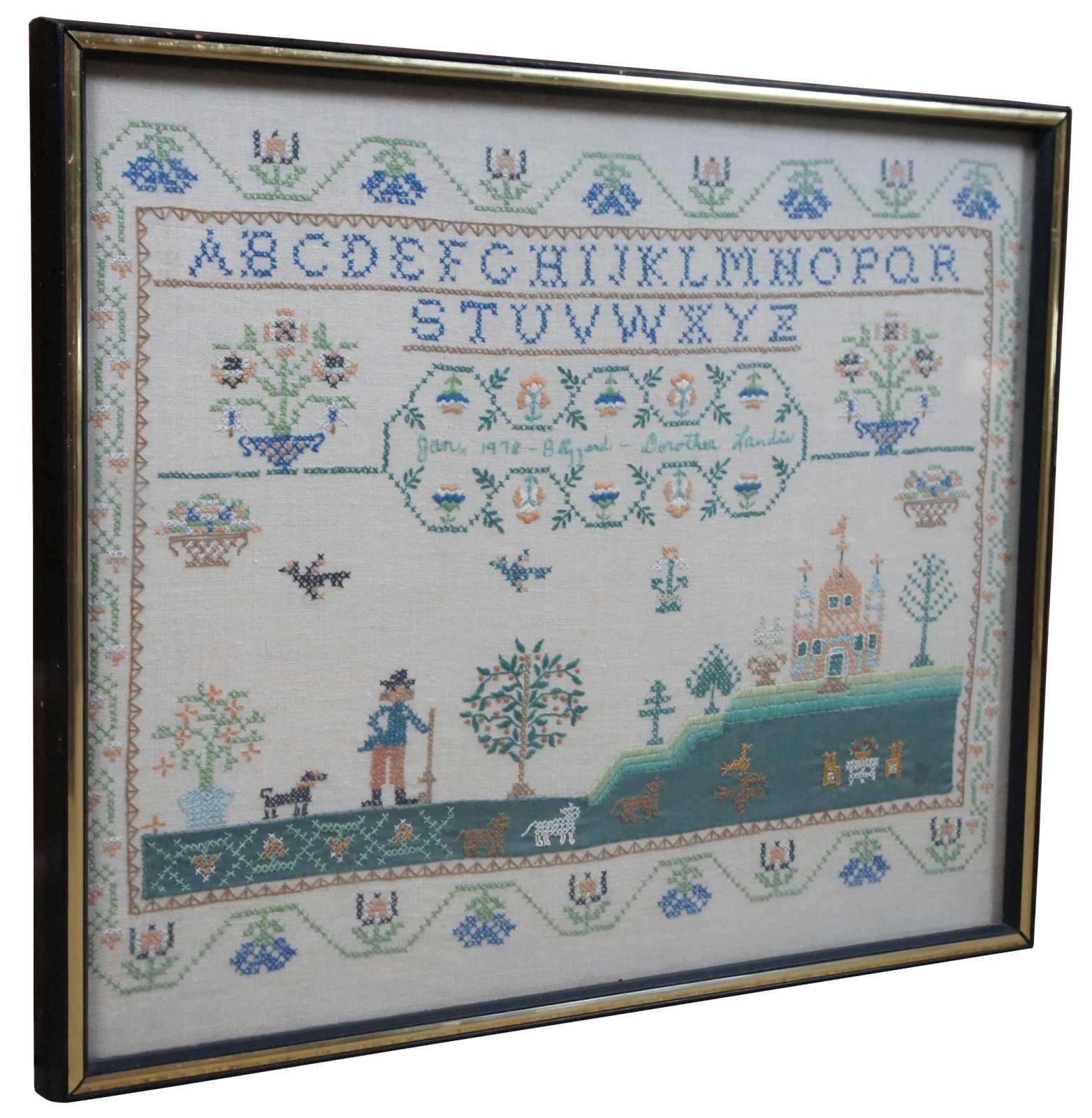 Vintage 1978 cross stitch folk art sampler with floral frame, alphabet, and a landscape showing a church, human figure, and animals.