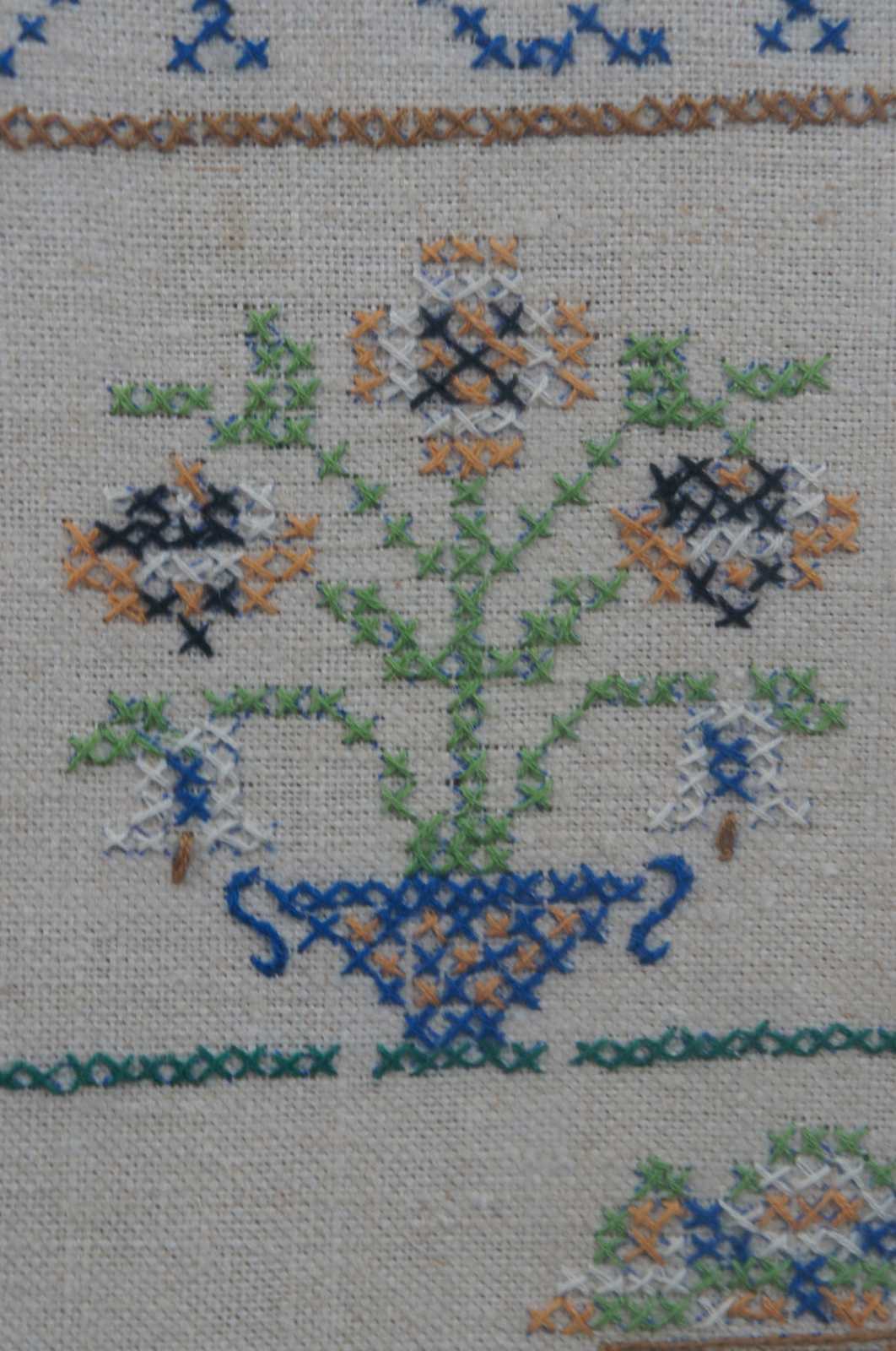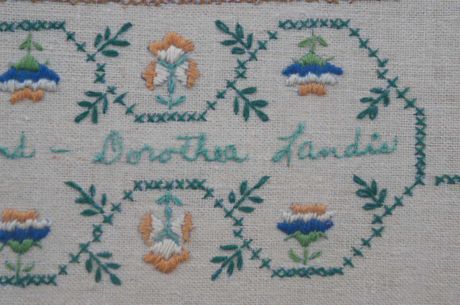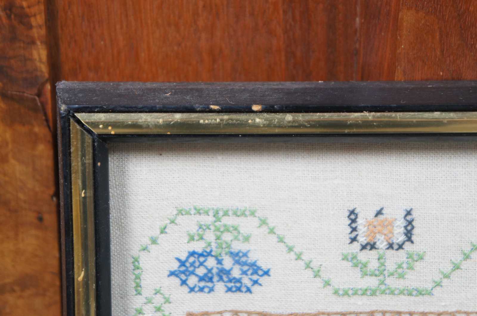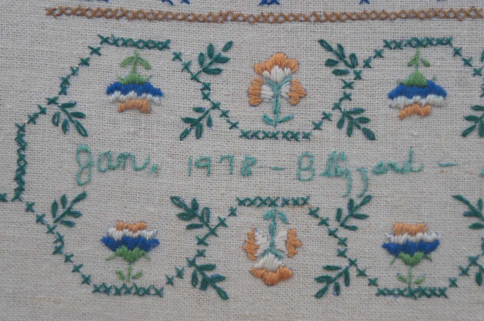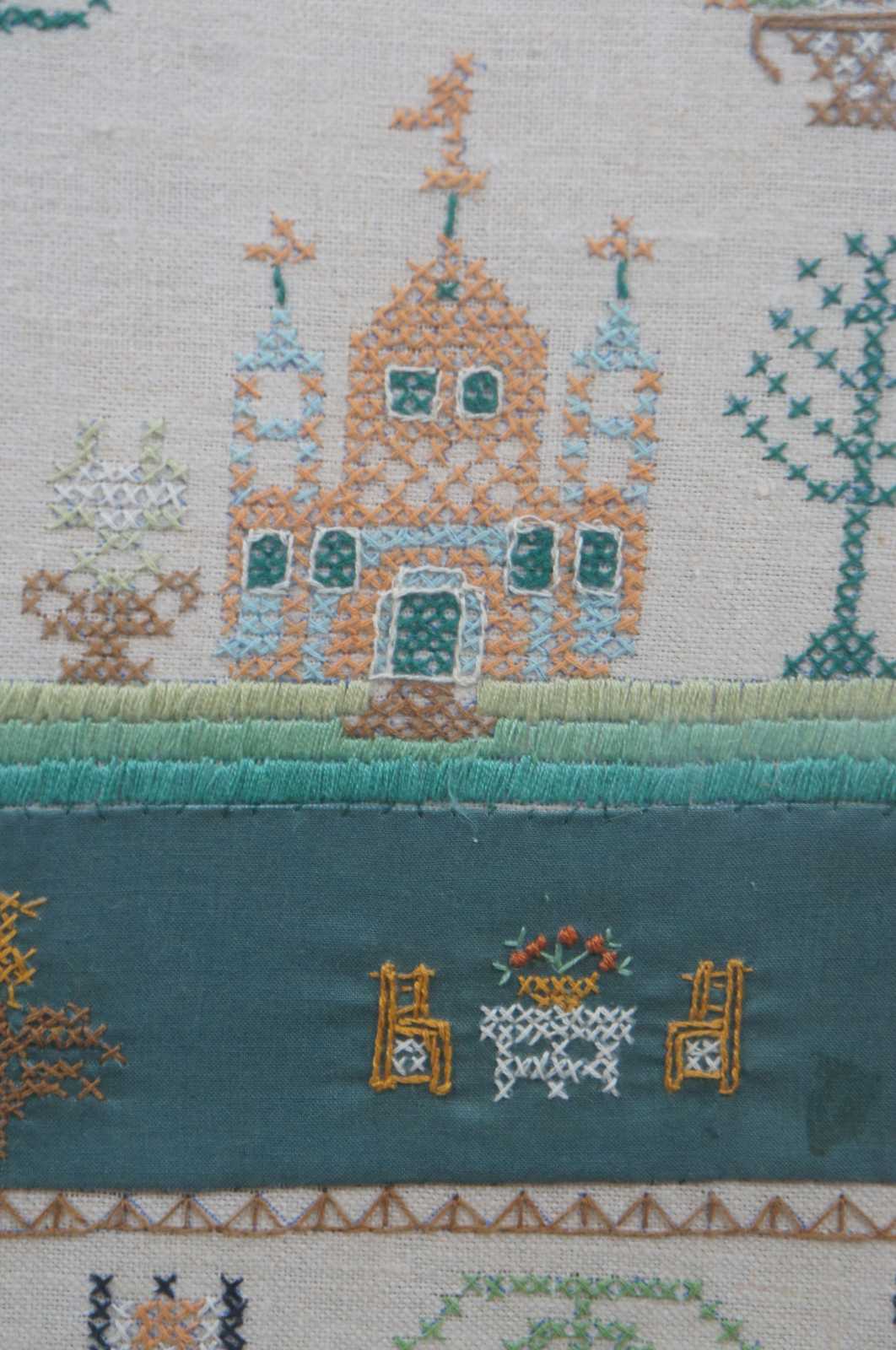 Vintage 1978 cross stitch folk art sampler with floral frame, alphabet, and a landscape showing a church, human figure, and animals.
