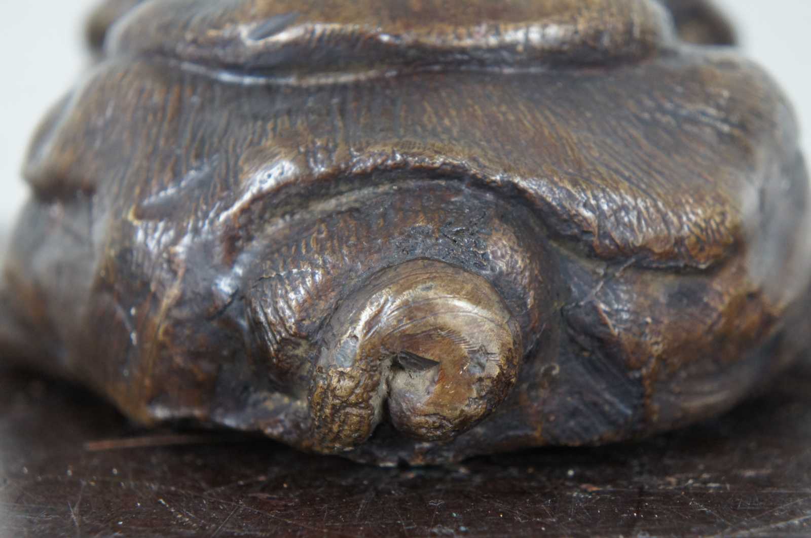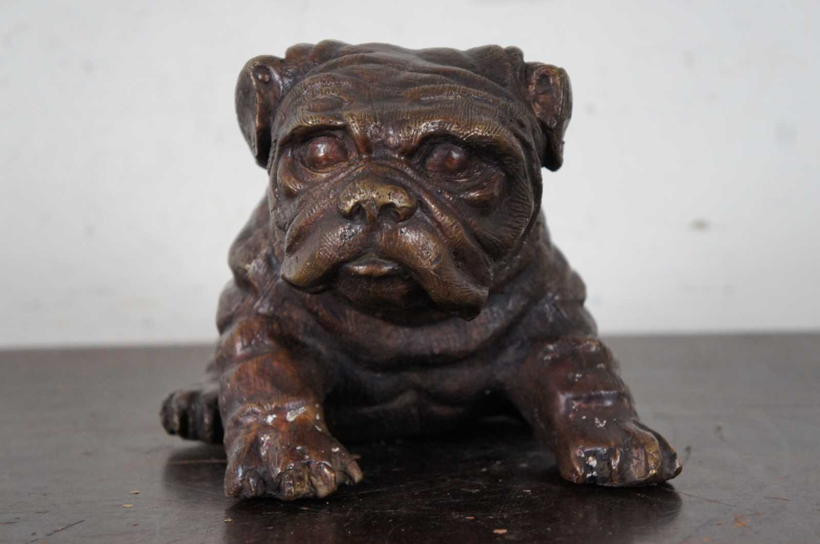 Vintage bronze figurine in the shape of a seated, wrinkly bulldog puppy.
