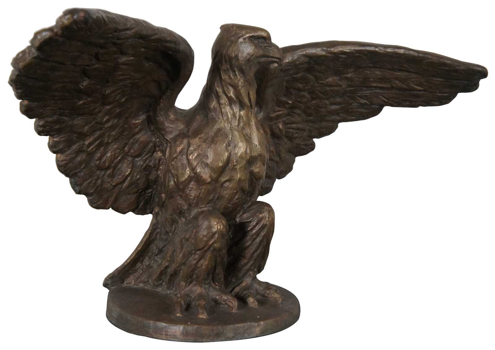 Museum quality antique solid bronze 70lb sculpture by Roman Bronze Works of an eagle seated on the base with wings outstretched. Roman Bronze Works, now operated as Roman Bronze Studios, is a bronze foundry in New York City. Established in 1897 by Riccardo Bertelli, it was the first American foundry to specialize in the lost-wax casting method, and was the country's pre-eminent art foundry during the American Renaissance. A truly impressive and rare find.