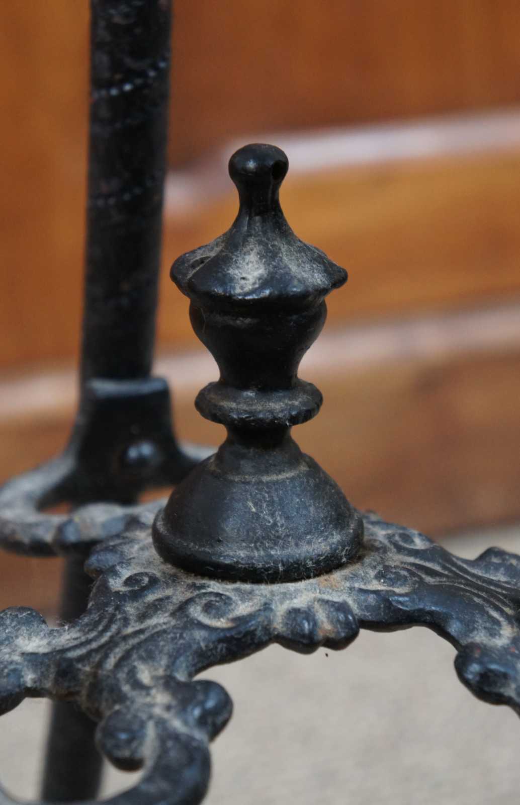 Antique victorian plant stand featuring ornate styling with three legs and hourglass form.