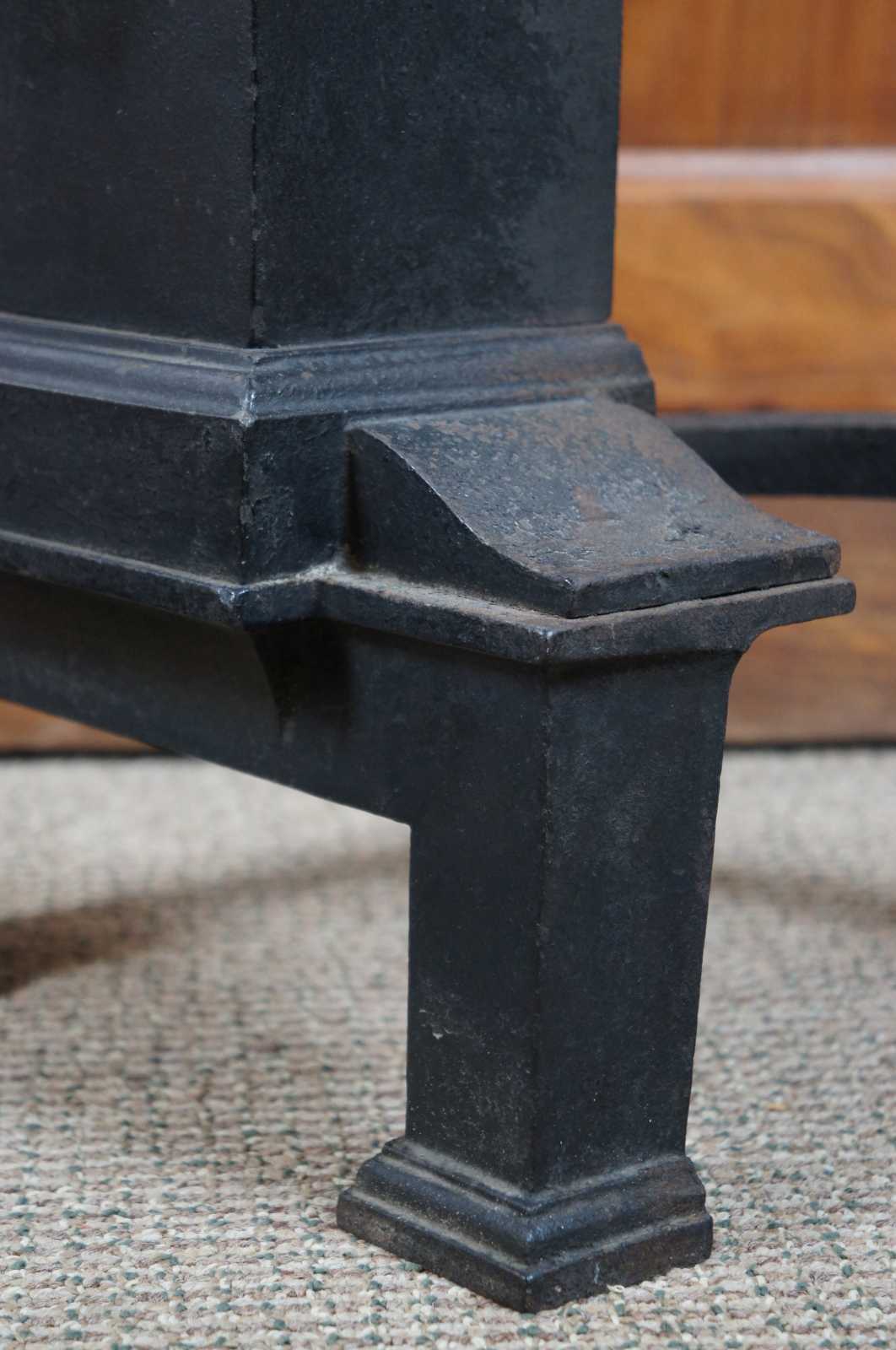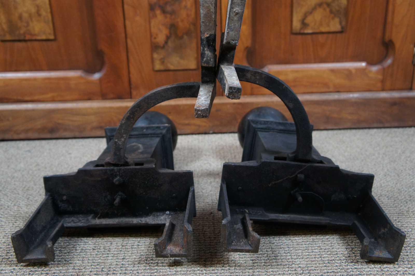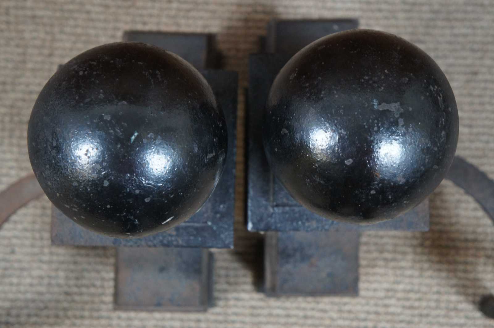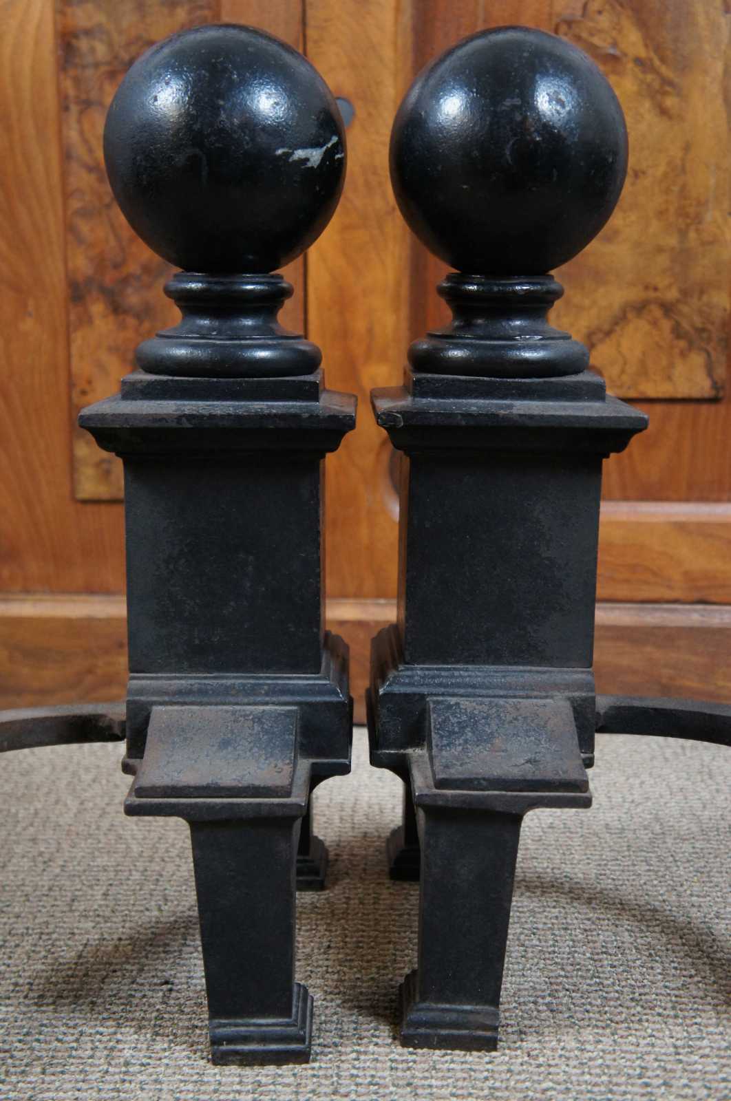 Antique black cast iron fireplace andirons with cannon ball tops and broad square column bases. Casting mark of 1962 on underside. An exceptional and heavy set.