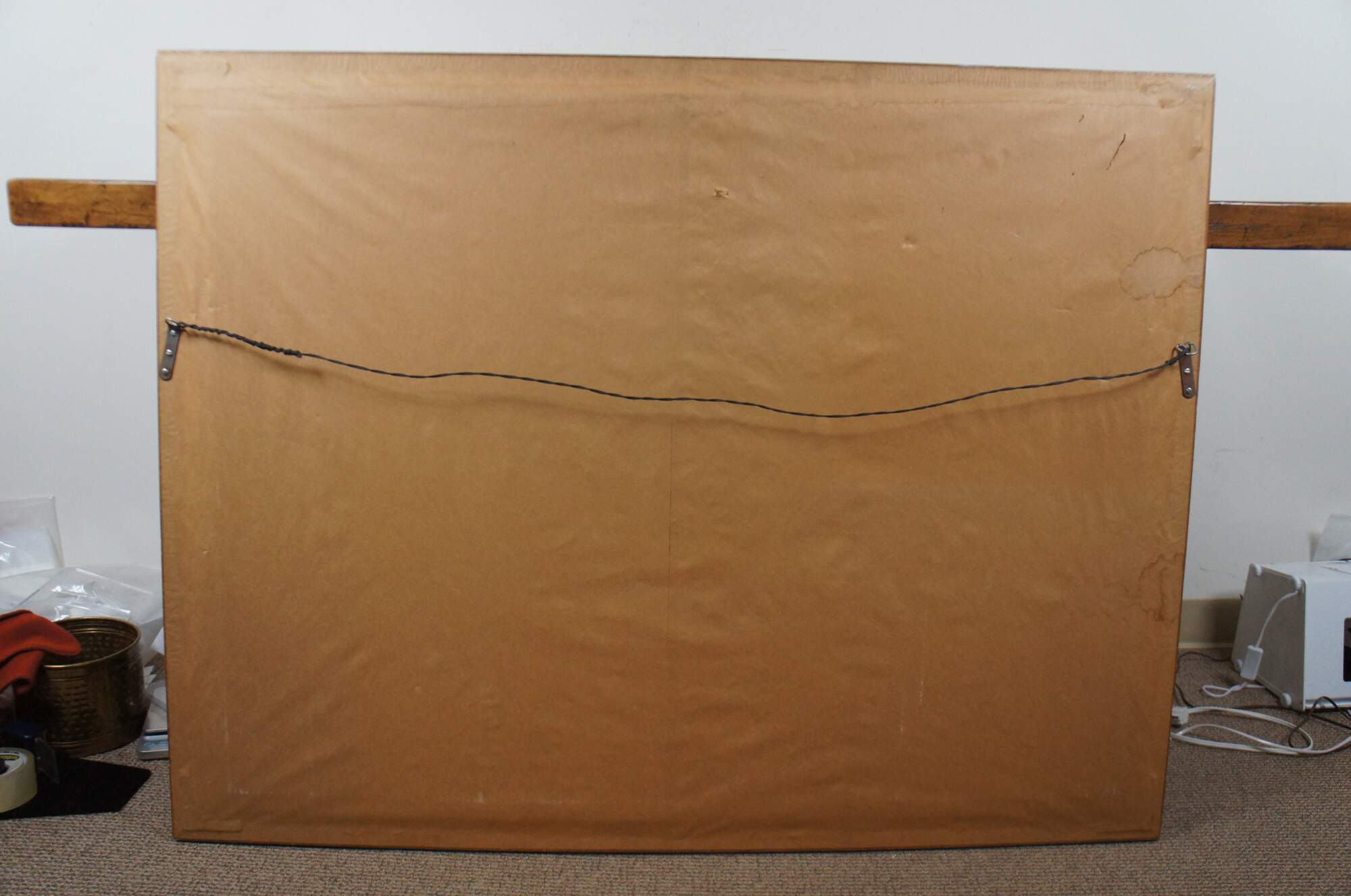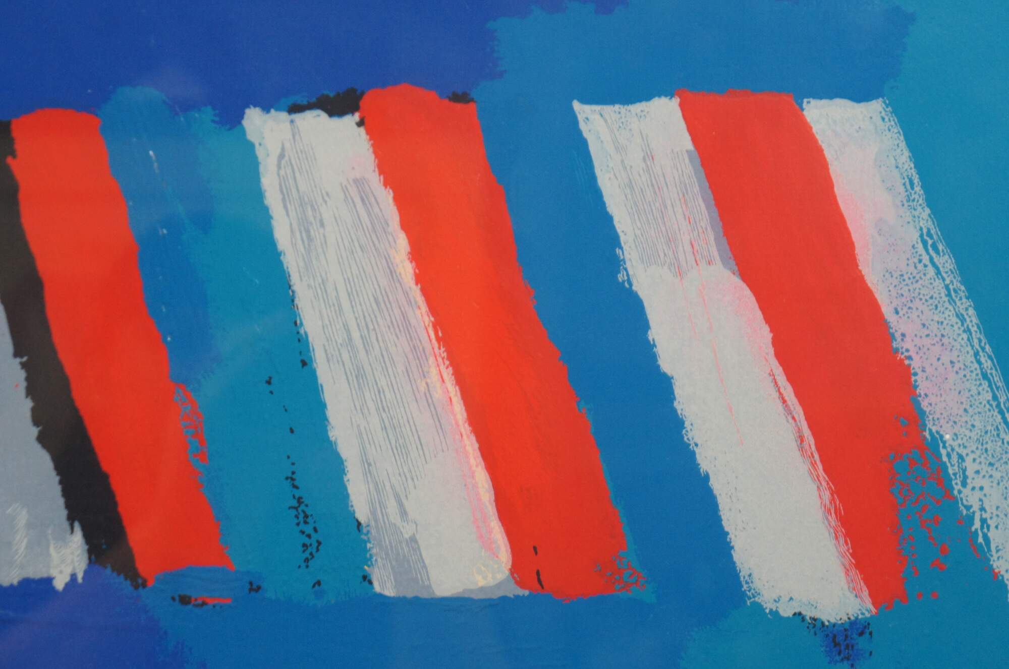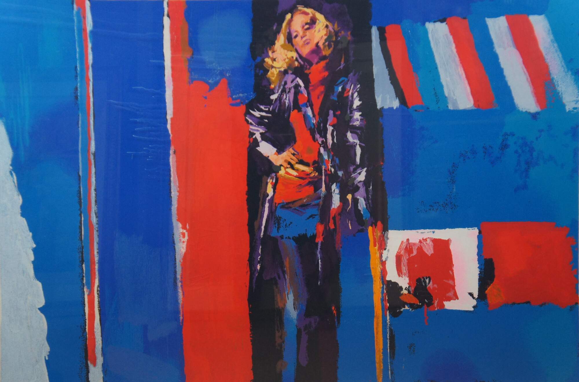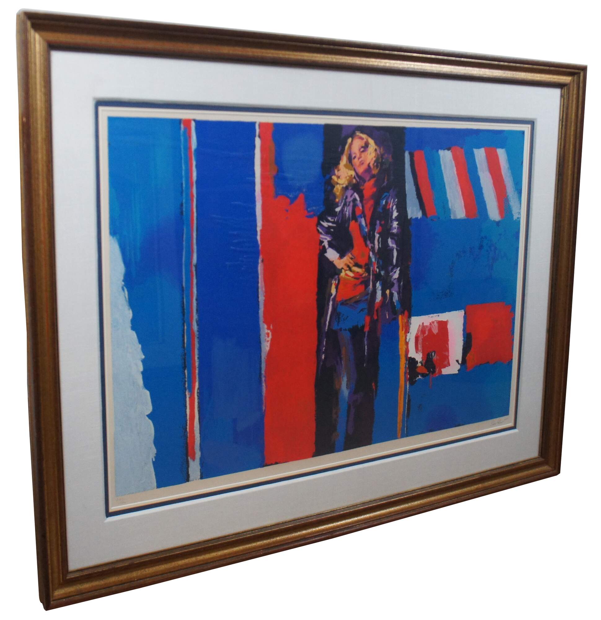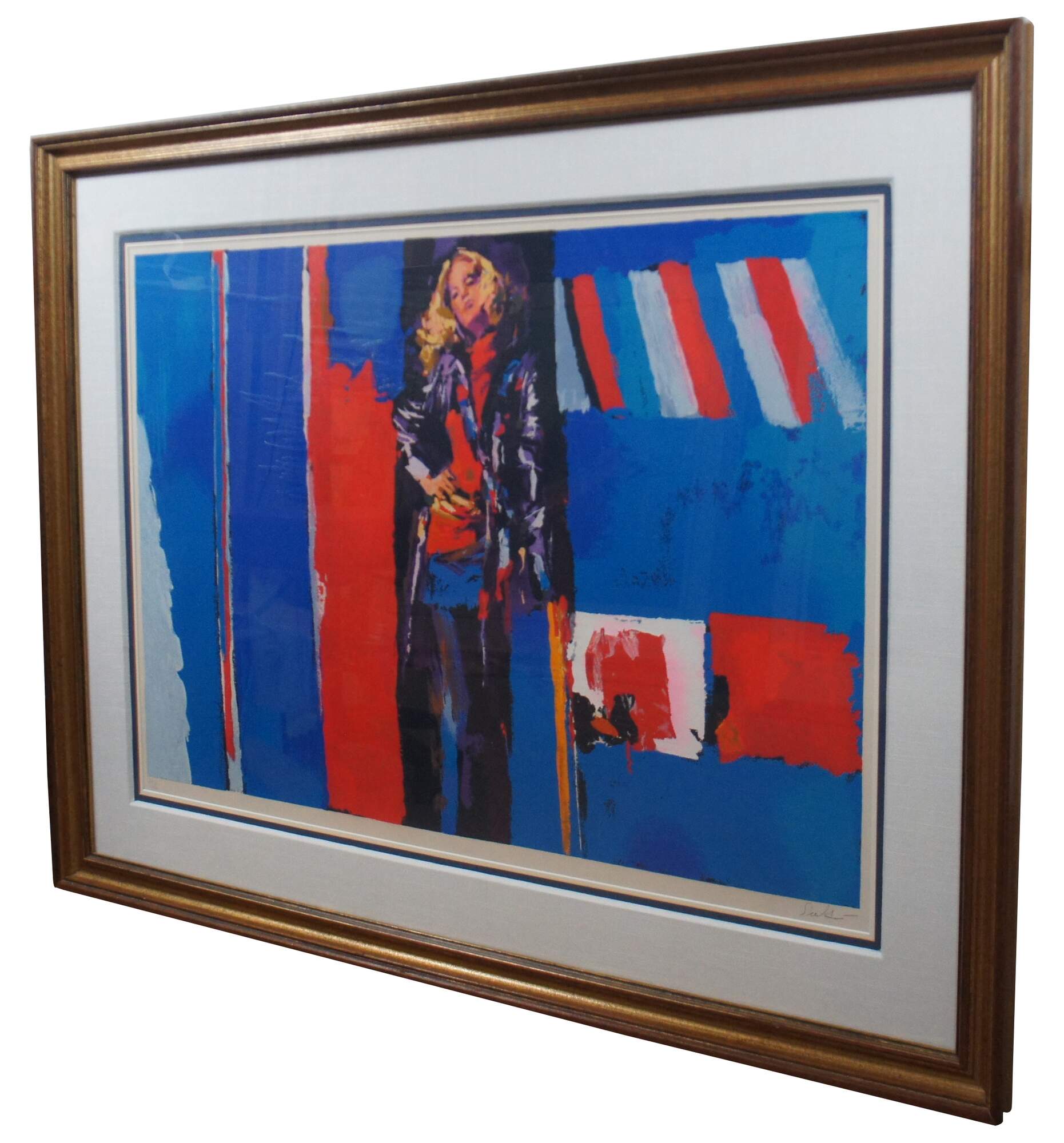 Vintage 1976 limited edition serigraph print by Nicola Simbari titled “Nanette,” showing a blonde woman posed in front of a red, white and blue backdrop; pencil signed and numbered 243/300. “Nicola Simbari is a painter of semi-abstract impressionist works. He is a colorist who favors brilliant tones, richly layered with a palette knife. Simbari paints to convey light and energy and provide new definition through intensity of vision and technique.