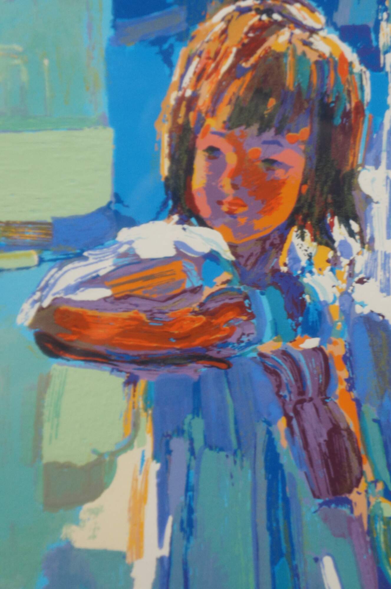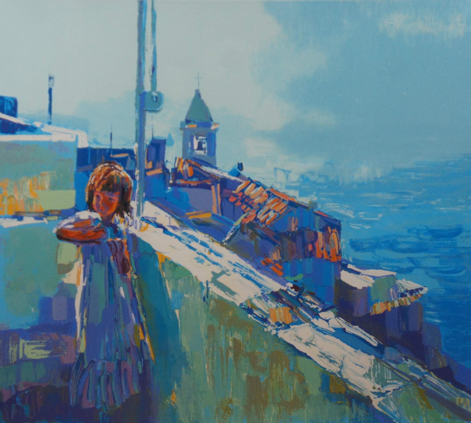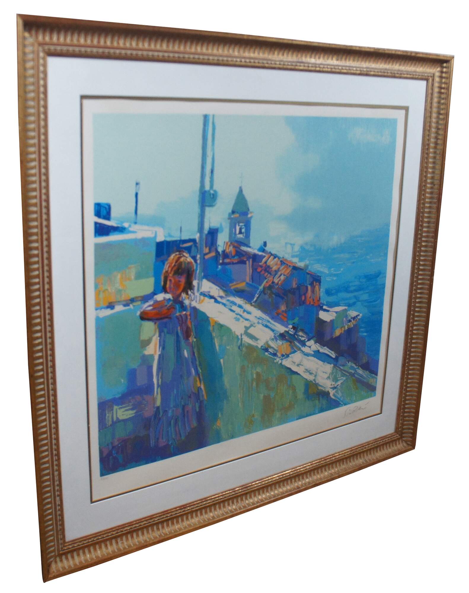 Vintage 1979 limited edition serigraph print by Nicola Simbari titled “Jennifer,” showing a young girl in white standing on a rooftop overlooking roofs down to the sea; pencil signed and numbered 8/300. “Nicola Simbari is a painter of semi-abstract impressionist works. He is a colorist who favors brilliant tones, richly layered with a palette knife. Simbari paints to convey light and energy and provide new definition through intensity of vision and technique.