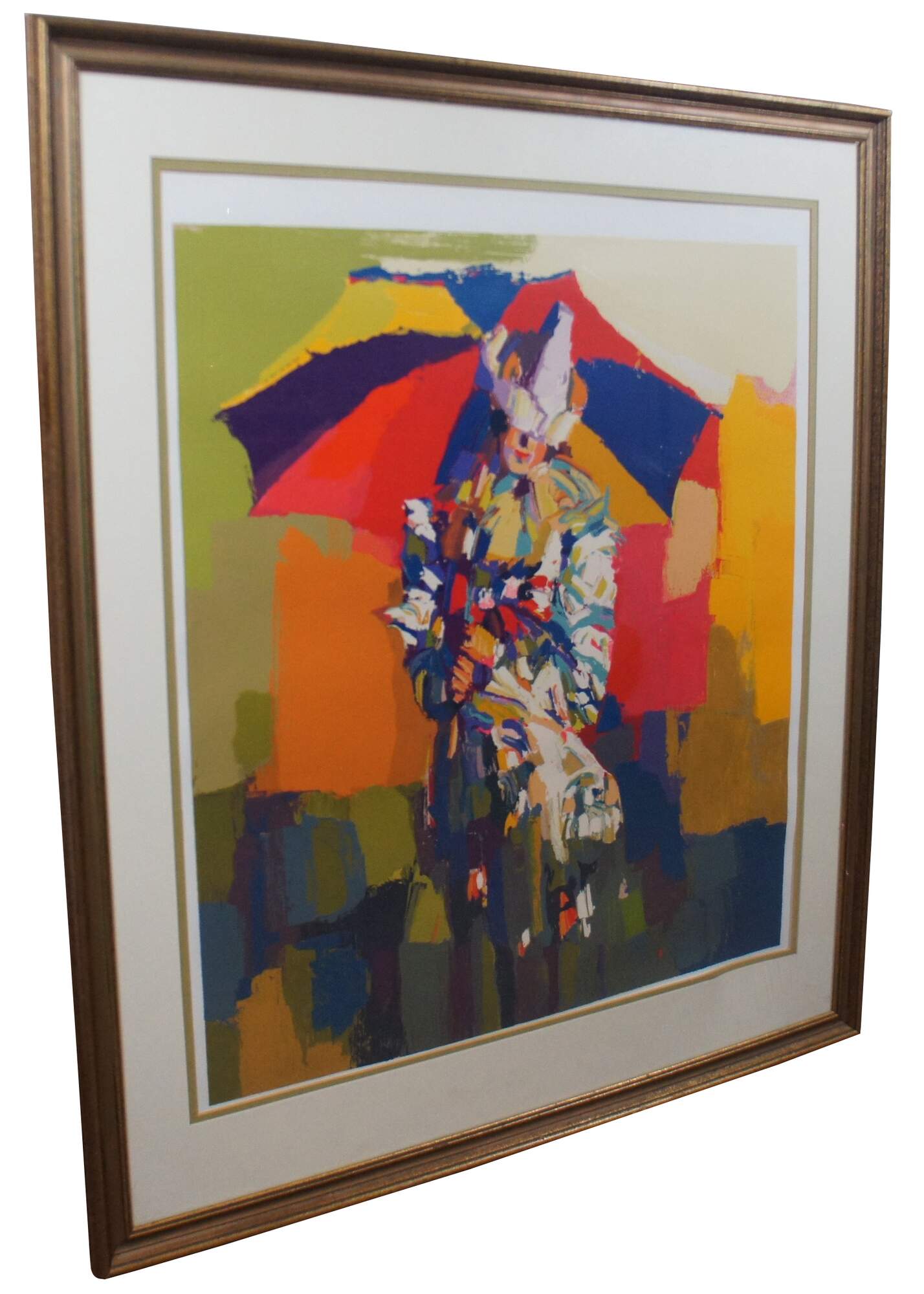 Vintage 1979 limited edition serigraph print by Nicola Simbari titled “Clown a l’ombelle,” showing a Commedia del Arte style clown holding a brightly colored umbrella; pencil signed and numbered but obscured by mat. “Nicola Simbari is a painter of semi-abstract impressionist works. He is a colorist who favors brilliant tones, richly layered with a palette knife. Simbari paints to convey light and energy and provide new definition through intensity of vision and technique.