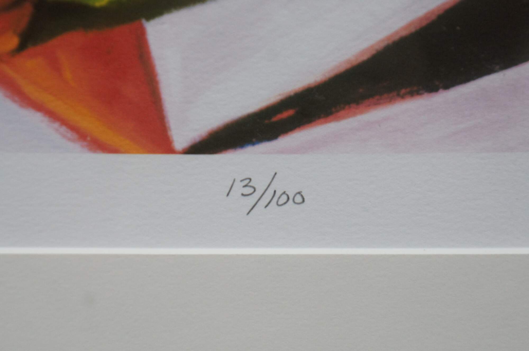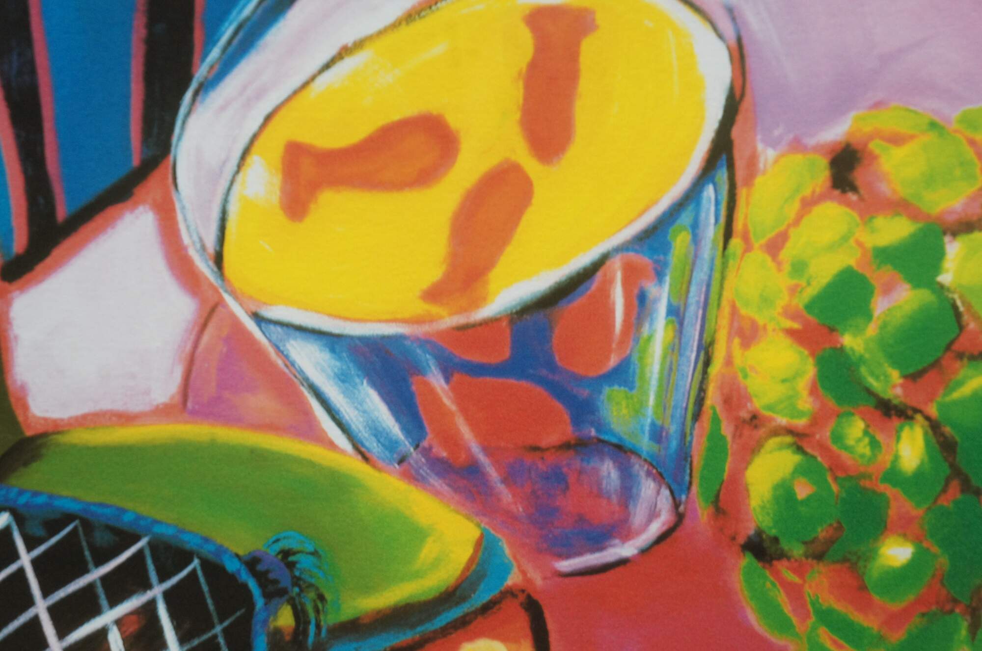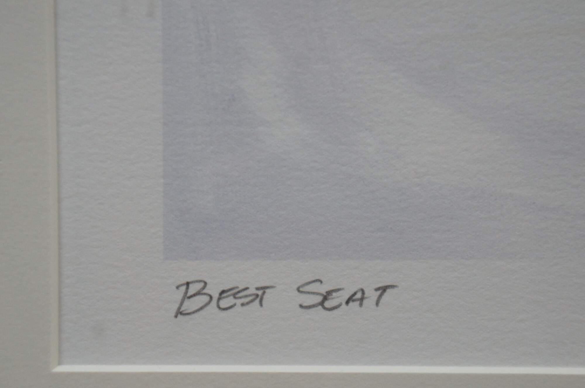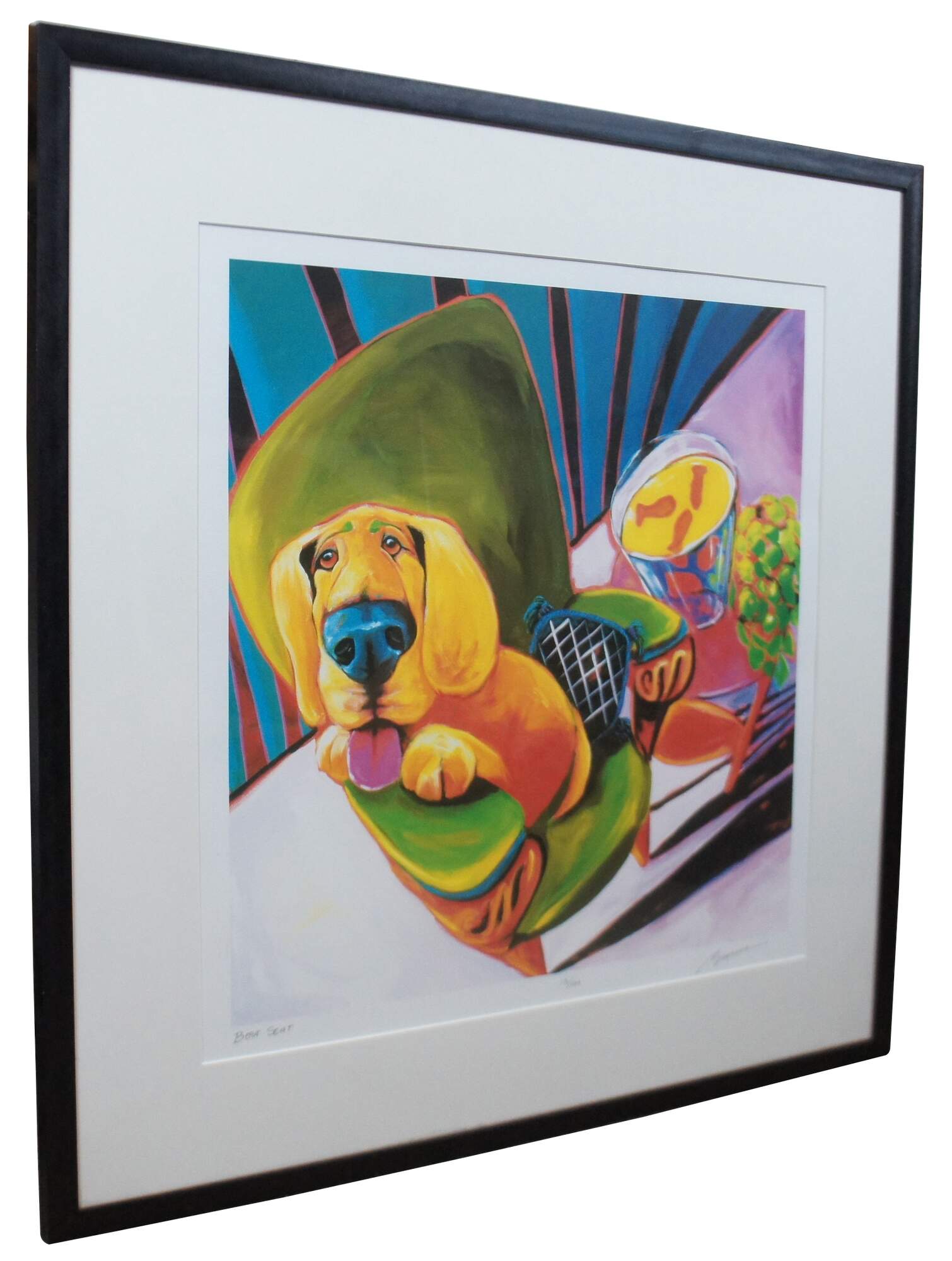 Limited edition whimsical expressionist style lithograph print by Ron Burns titled “Best Seat,” showing a golden dog seated in a green chair; pencil signed and numbered 13/100. “A painter of boldly colored, semi abstract animals, he was the artist-in-residence for the United States Humane Society.