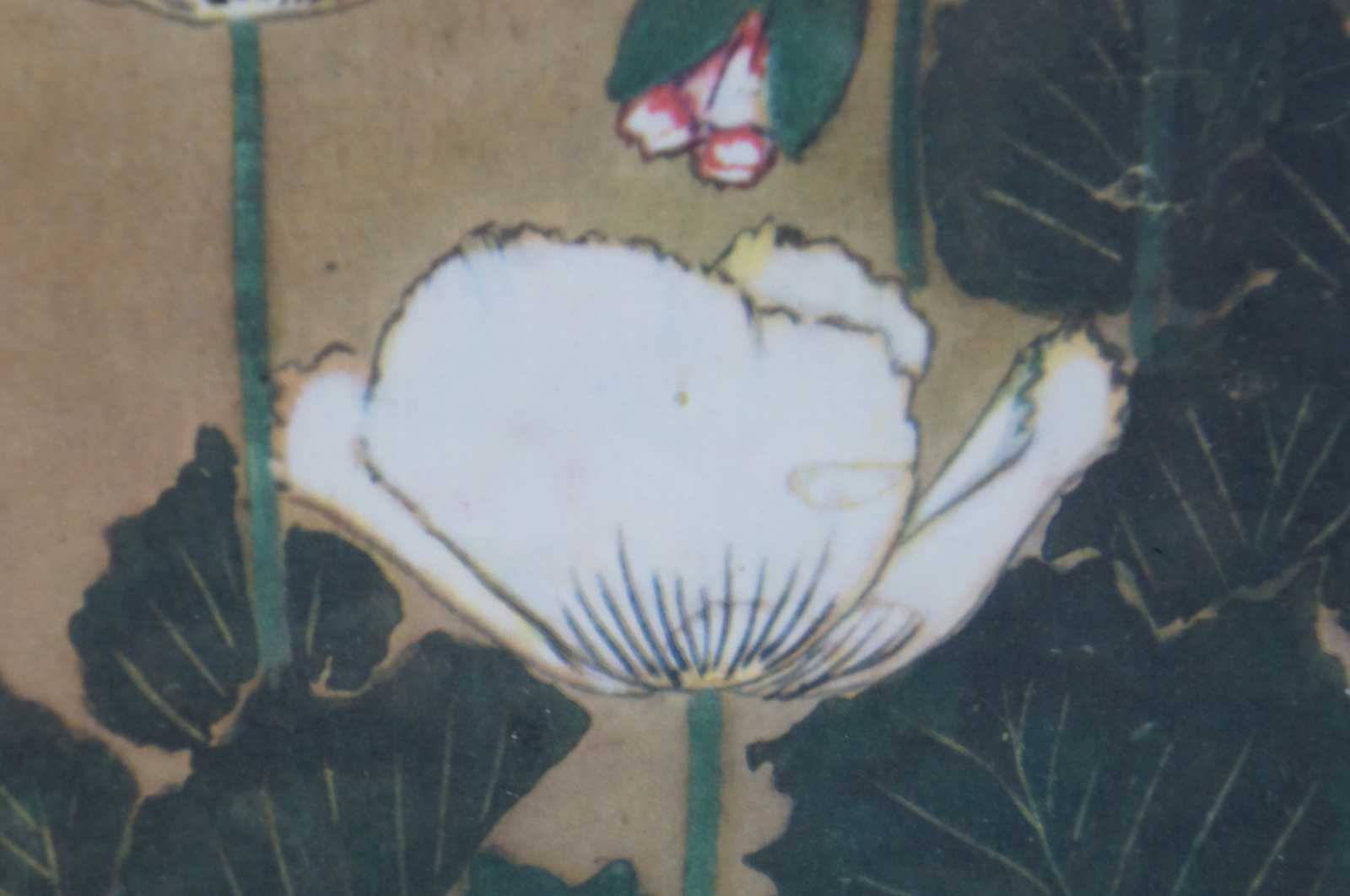 This work is traditionally attributed to Kitagawa Sōsetsu, one of the top pupils of Tawaraya Sōtatsu, who is recognized as the founder of Rinpa, a school of painting famous for stylized and often colorful depictions of natural forms. But exactly who created this composition is hard to pin down since a number of Tawaraya Sōtatsu’s pupils appear to have used “I’nen” seals, similar to the one found on this painting. The stock-in-trade of the artists who used the “I’nen” seal at this time were screens, scrolls, and fans lavishly painted with trees, plants, or flowers, as seen here. As with all Rinpa vegetal motifs, there is a balance between stylization and naturalism. The plants are identifiable but reflect a decorative intent, for they seem completely detached from any real landscape.