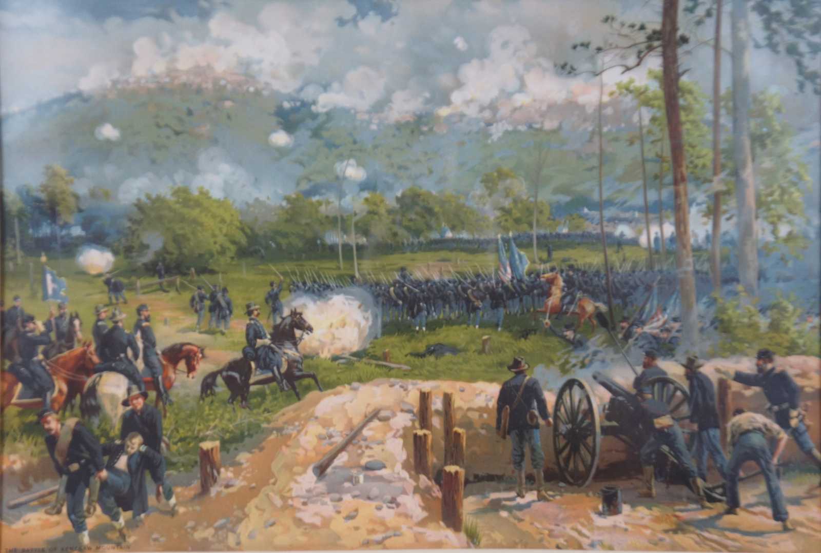 Set of three framed lithograph prints featuring The Battle of Kenesaw (Kennesaw) Mountain (Fought on June 27, 1864, during the Atlanta Campaign of the American Civil War), the Battle of Spottsylvania (The Battle of Spotsylvania Court House, sometimes more simply referred to as the Battle of Spotsylvania (or the 19th-century spelling Spottsylvania), was the second major battle in Lt. Gen. Ulysses S. Grant and Maj. Gen. George G. Meade's 1864 Overland Campaign of the American Civil War), and Antietam (The Battle of Antietam, also called the Battle of Sharpsburg, occurred on September 17, 1862, at Antietam Creek near Sharpsburg, Maryland. It pitted Confederate General Robert E. Lee’s Army of Northern Virginia against Union General George McClellan’s Army of the Potomac and was the culmination of Lee’s attempt to invade the north. The battle’s outcome would be vital to shaping America’s future, and it remains the deadliest one-day battle in all of American military history). Copyright 1880s by L. Prang & Company of Boston, printed by the American Lithographic Company.
