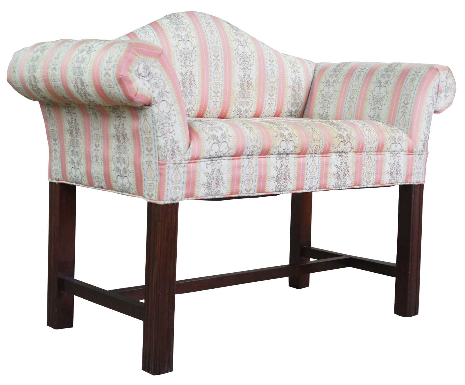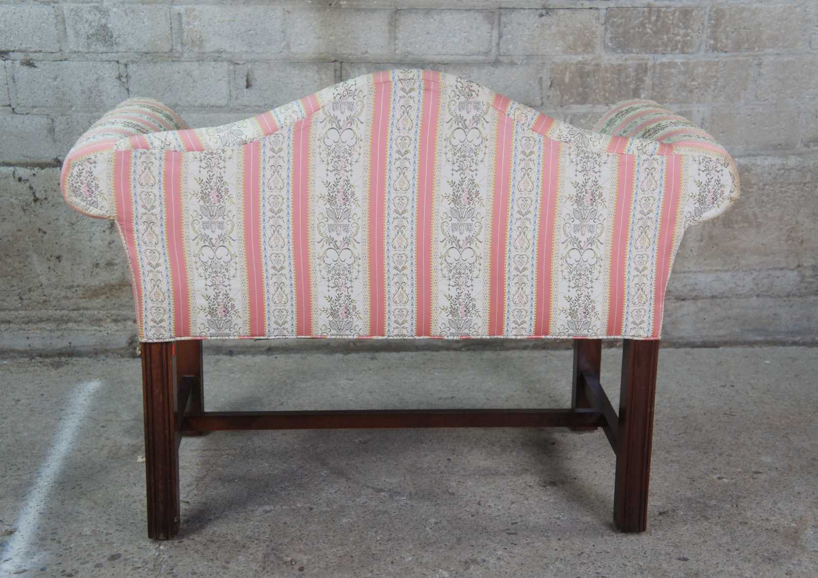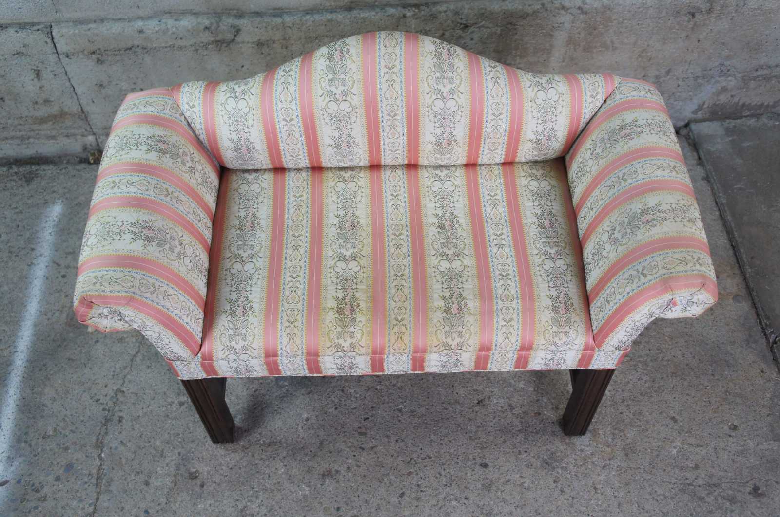 Petite antique Chippendale settee or bench seat. Made of mahogany featuring camelback form with rolled arms and square fluted legs.