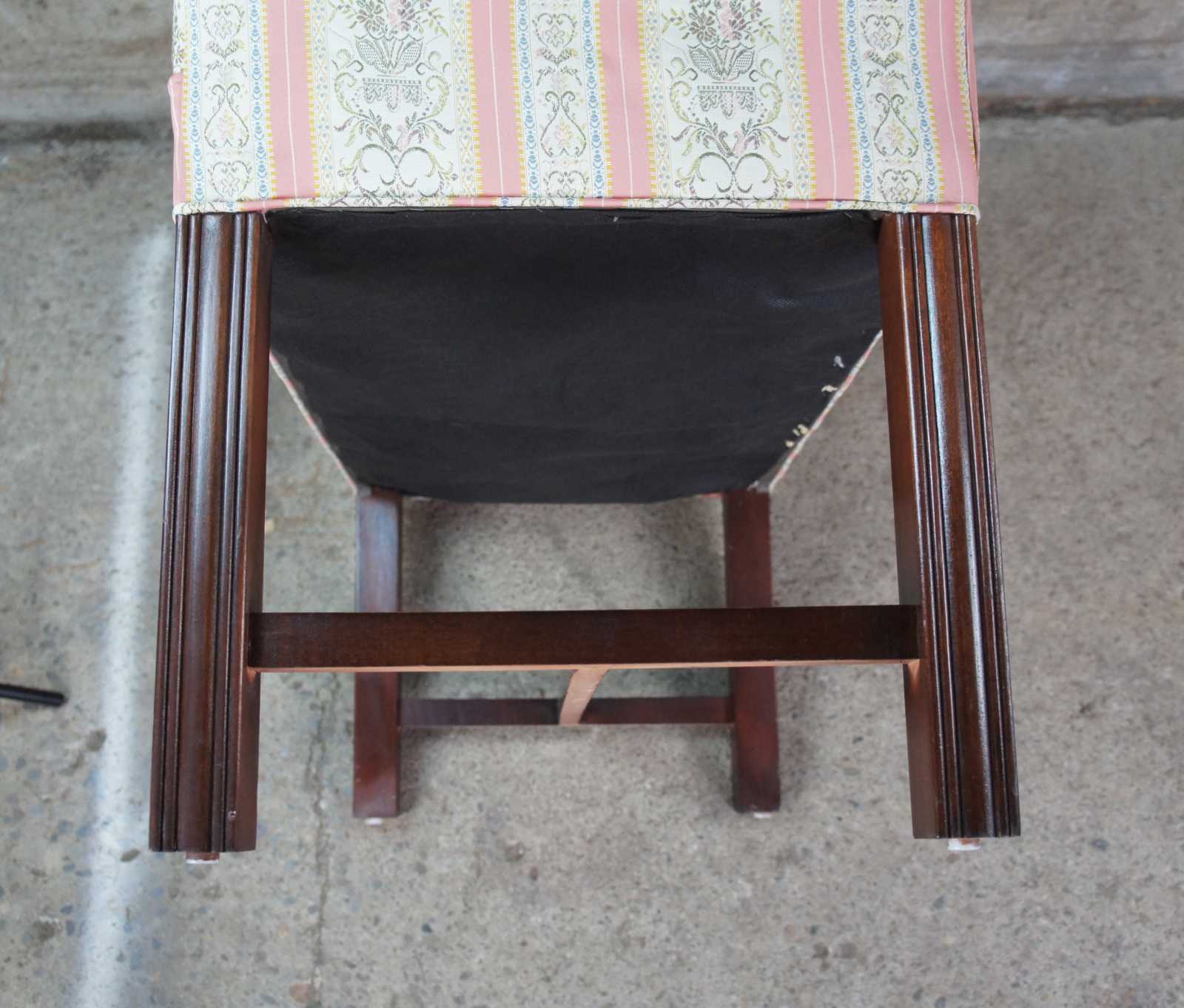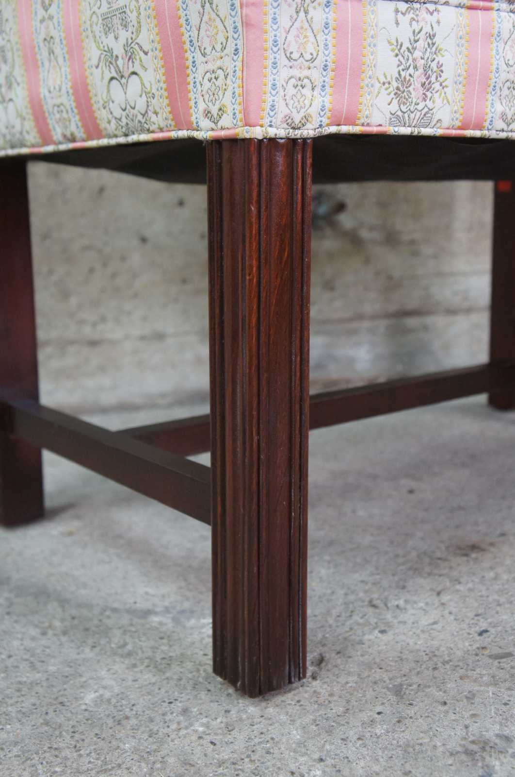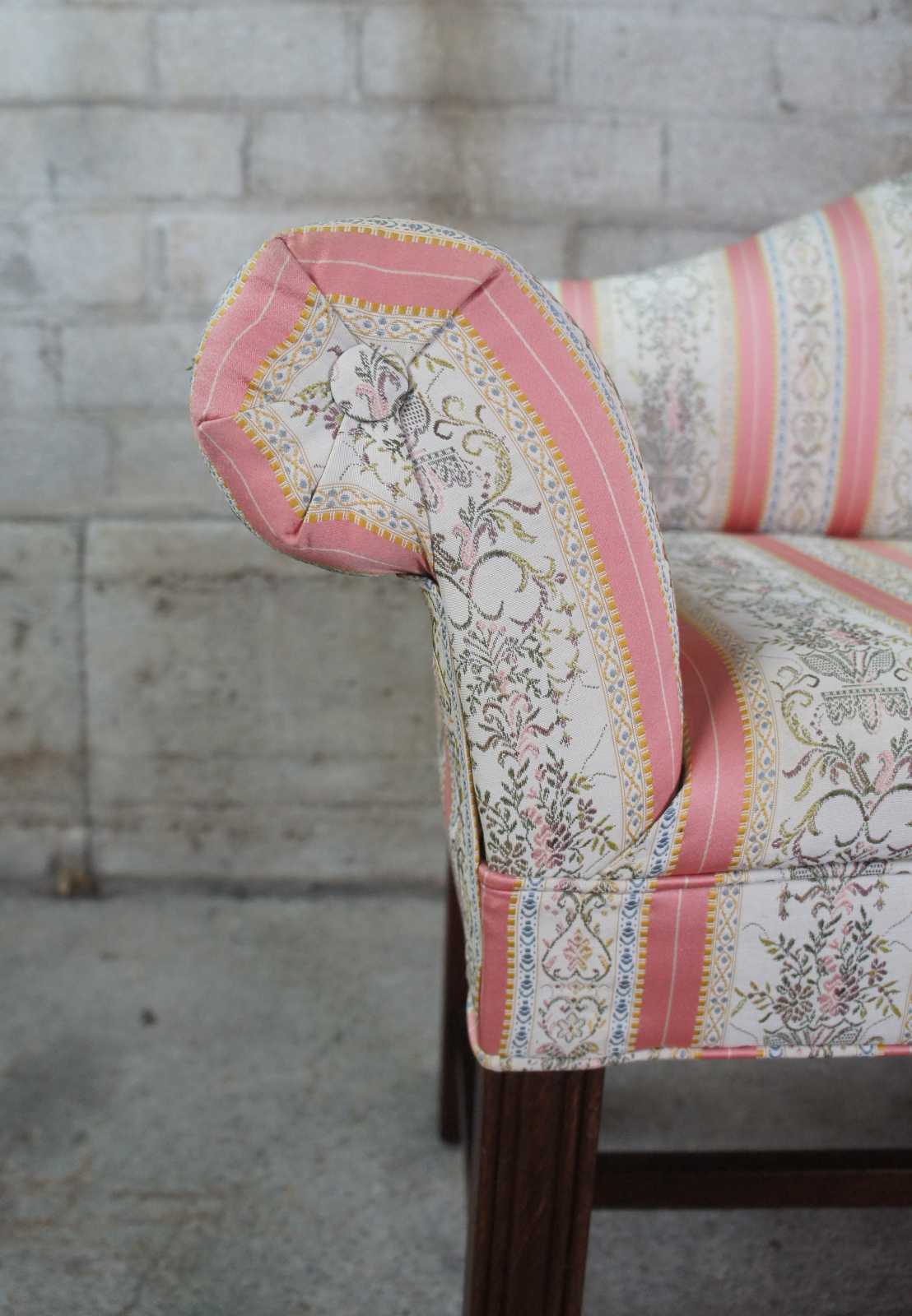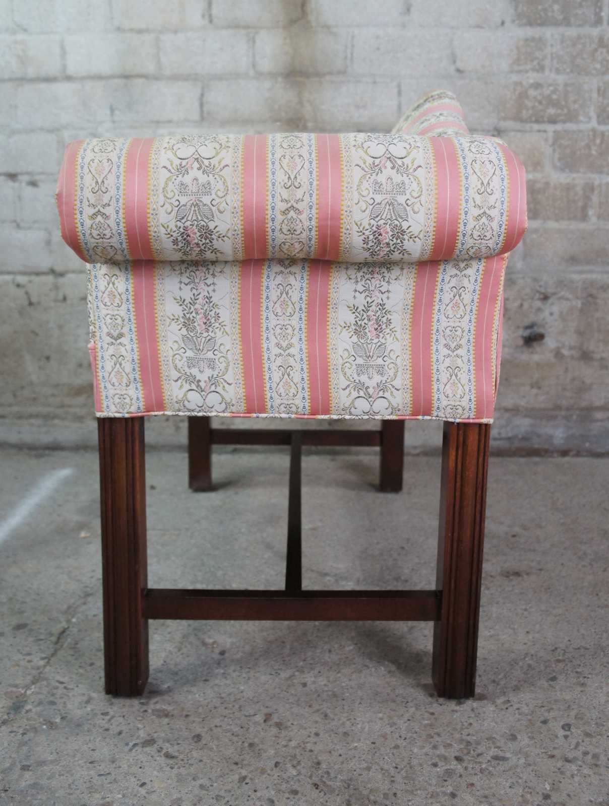 Petite antique Chippendale settee or bench seat. Made of mahogany featuring camelback form with rolled arms and square fluted legs.